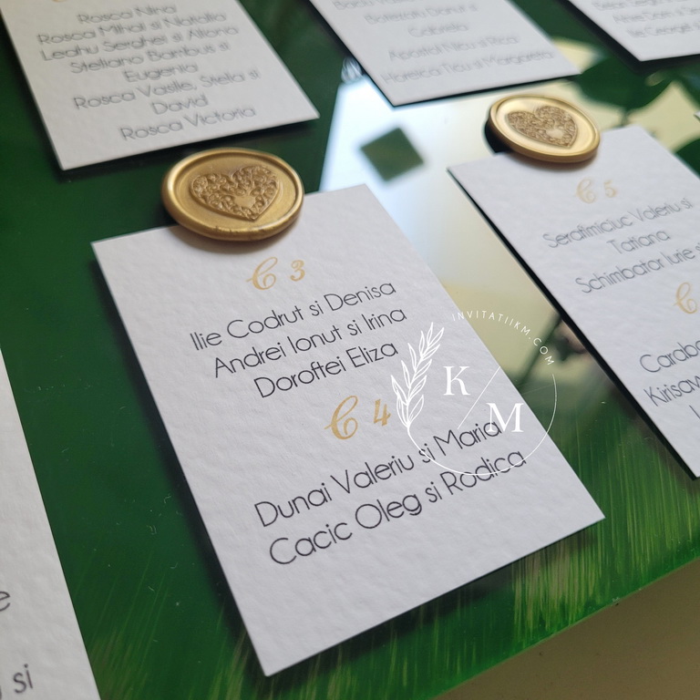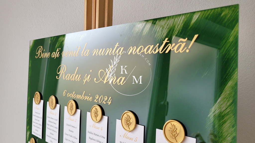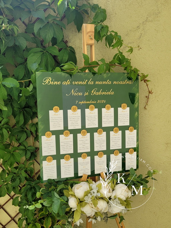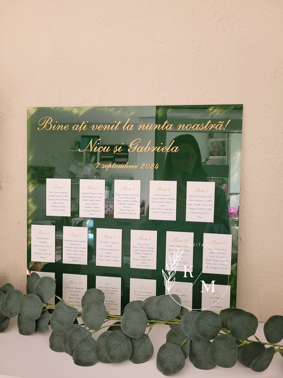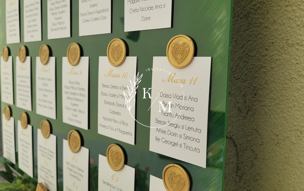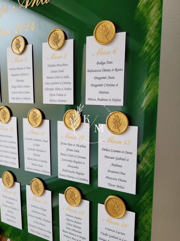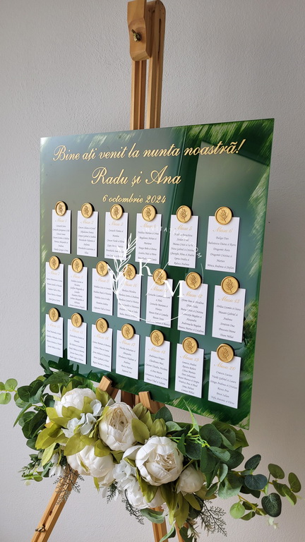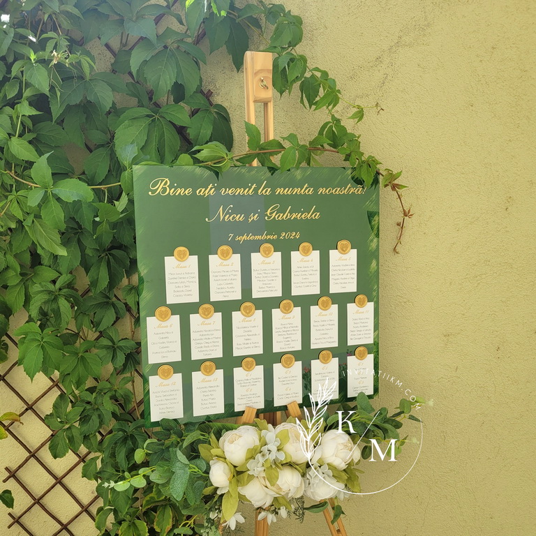 Panou de intampinare pentru nunta cu cartonase cu asezarea invitatilor la mese. Panoul este realizat din plexiglas transparent vopsit verde pe verso, are dimensiunea 50 x 50 cm, iar cartonasele sunt realizate din carton alb neted + sigiliu. In functie de numarul cartonaselor, acestea pot fi mai mari/mai micute. Se pot achizitiona impreuna sau separat.