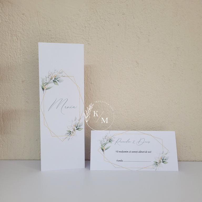 Meniuri si numere de masa, plicuri de bani cu chenar geometric auriu si frunze de eucalipt/verdeata. Meniurile de nunta sunt realizate din carton gros si au dimensiunea aprox. 10 x 20 cm (inchise). Plicurile de bani sunt realizate din carton gros si au buzunar interior lipit pentru dar. Numerele de masa sunt fata-verso si au aprox. 10 x 15 cm (inchise).