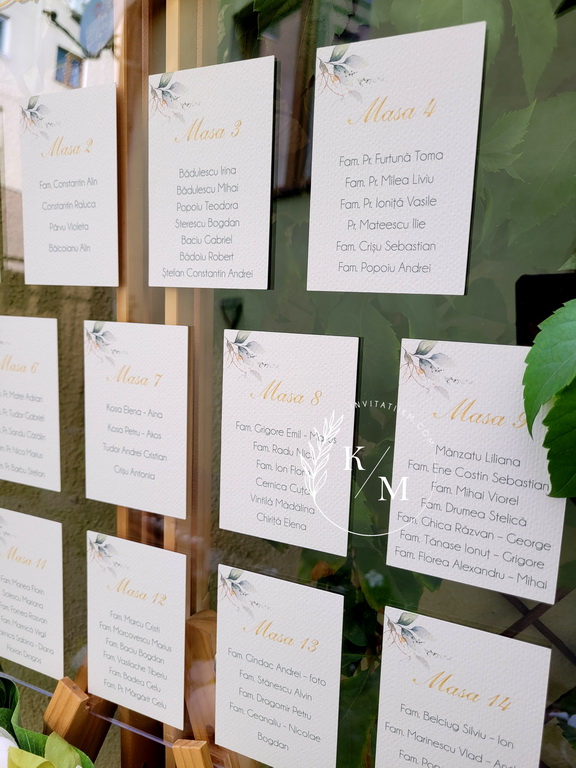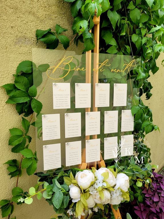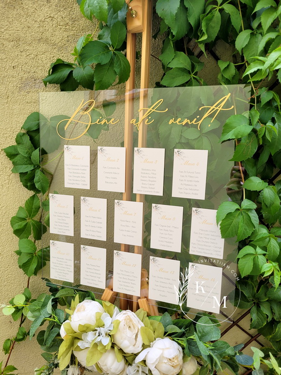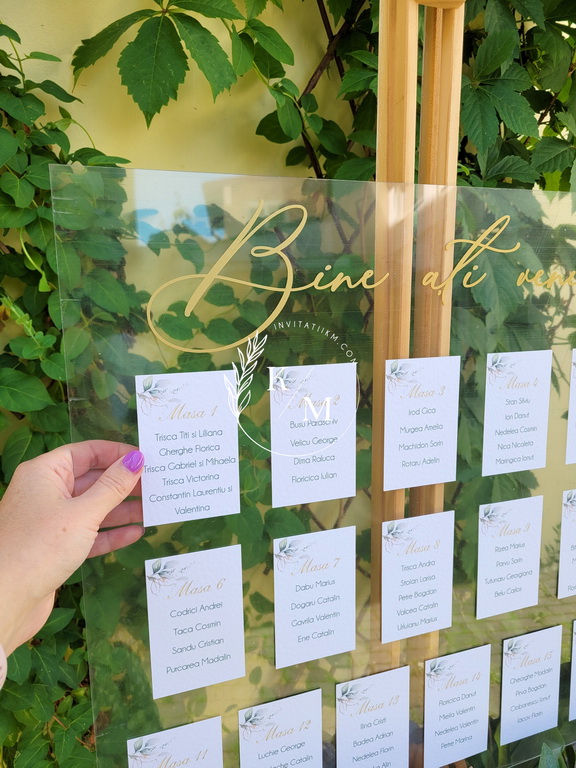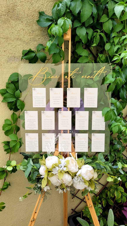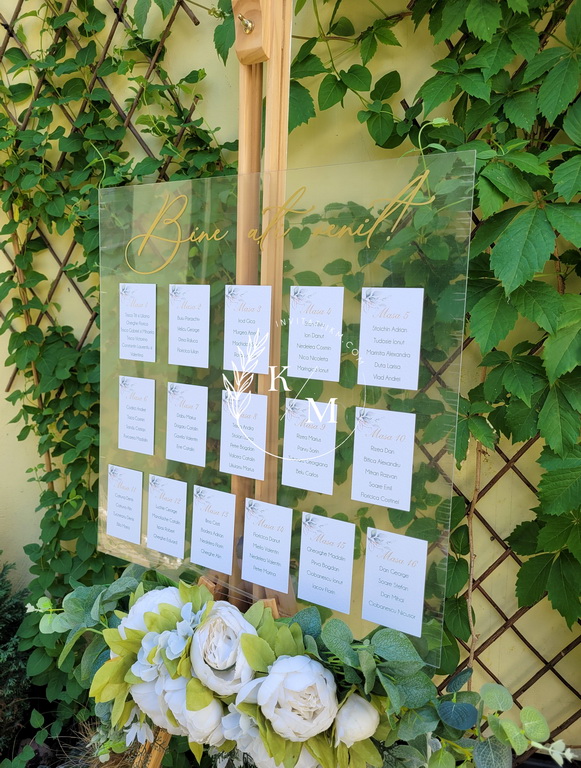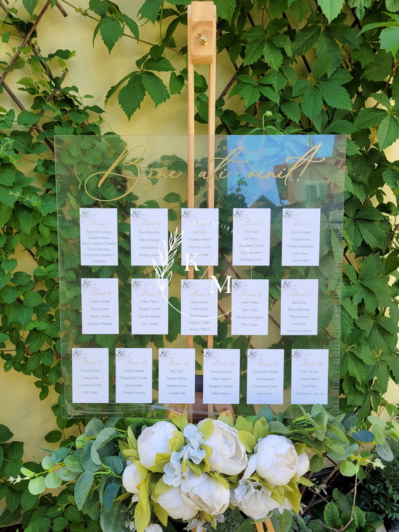 Panou de intampinare pentru nunta cu cartonase cu asezarea invitatilor la mese. Panoul este realizat din plexiglas transparent, are dimensiunea 50 x 50 cm, iar cartonasele sunt realizate din carton texturat/neted. In functie de numarul cartonaselor, acestea pot fi mai mari/mai micute. Se pot achizitiona impreuna sau separat.