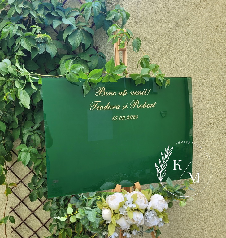 Panou de intampinare pentru nunta cu cartonase cu asezarea invitatilor la mese. Panoul este realizat din plexiglas transparent vopsit verde pe verso, are dimensiunea 50 x 70 cm, iar cartonasele sunt realizate din carton alb neted + sigiliu. In functie de numarul cartonaselor, acestea pot fi mai mari/mai micute. Se pot achizitiona impreuna sau separat.
