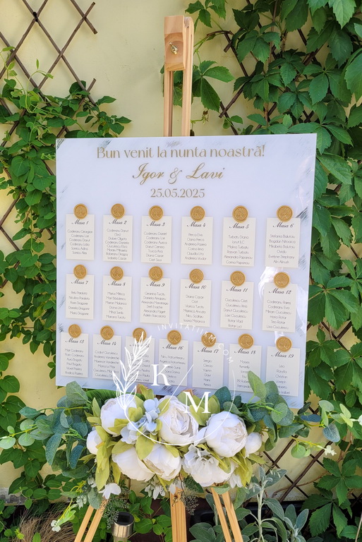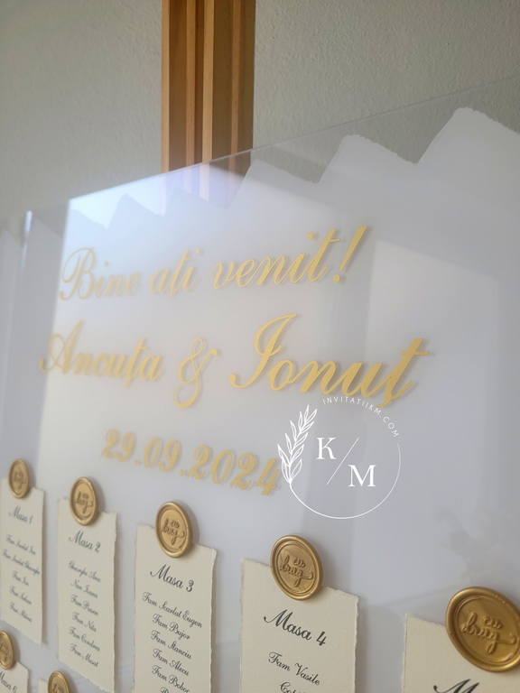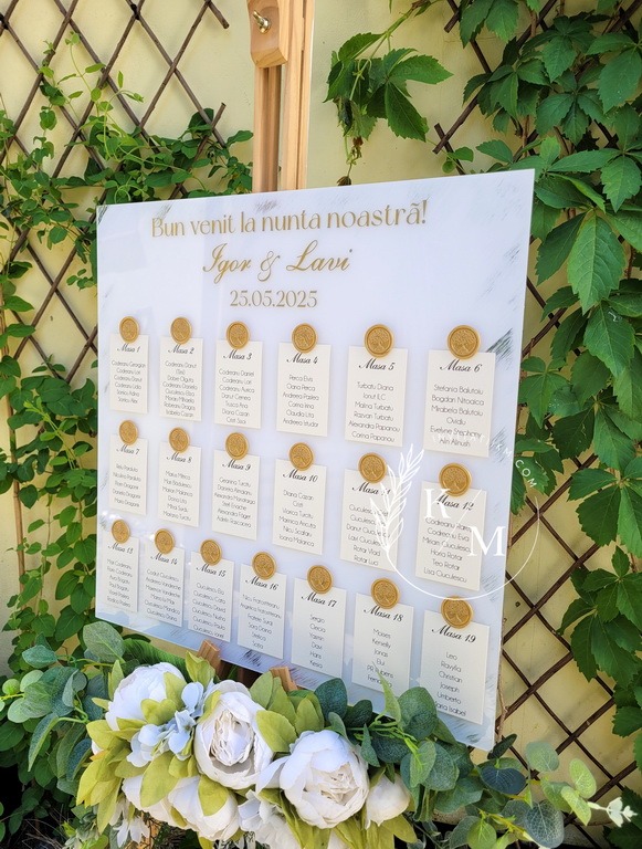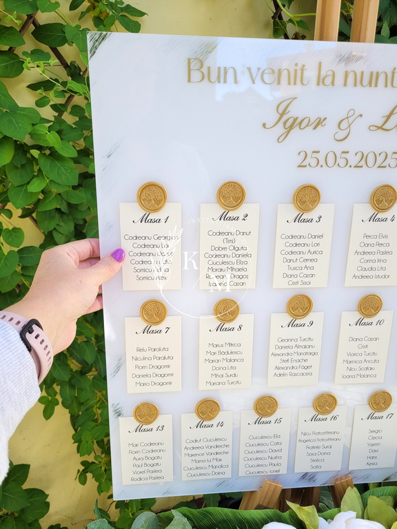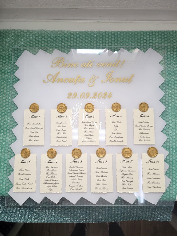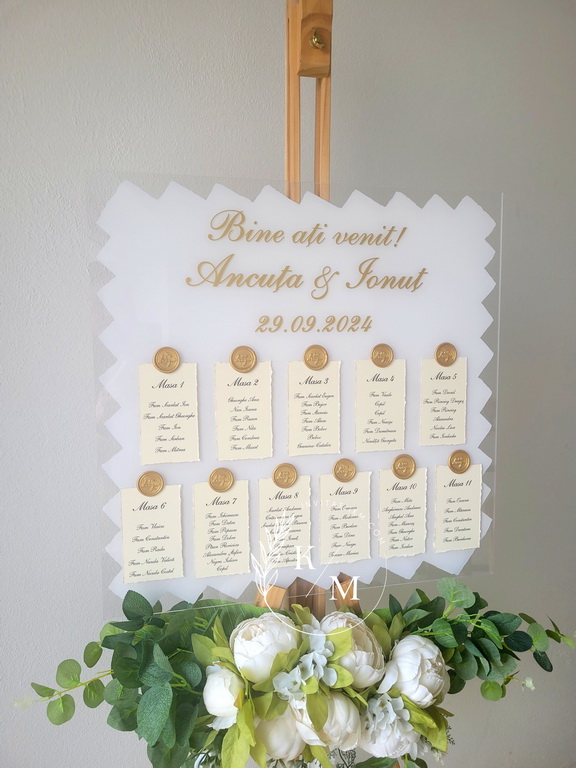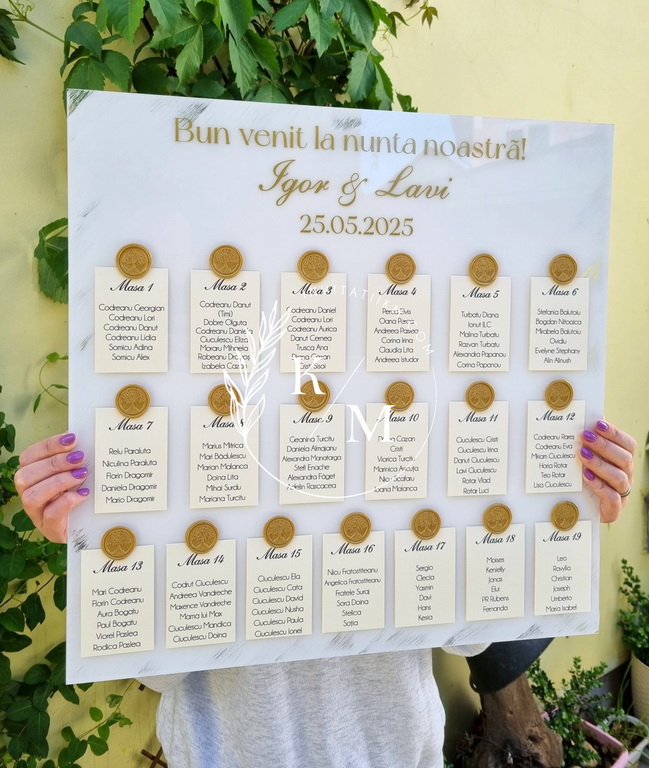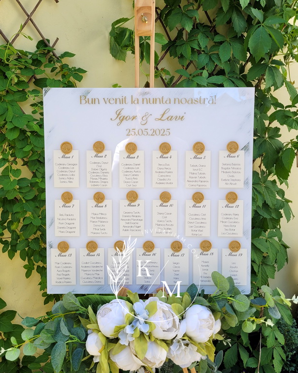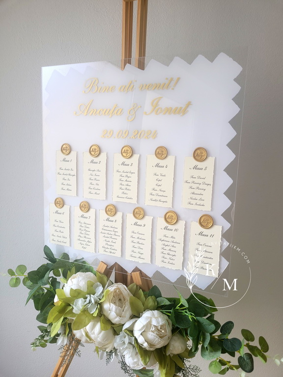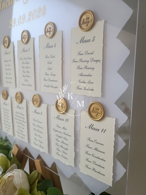 Panou de intampinare pentru nunta cu cartonase cu asezarea invitatilor la mese. Panoul este realizat din plexiglas transparent vopsit alb pe verso, are dimensiunea 50 x 50 cm, iar cartonasele sunt realizate din carton cu margini rupte manual + sigiliu. In functie de numarul cartonaselor, acestea pot fi mai mari/mai micute. Se pot achizitiona impreuna sau separat.
