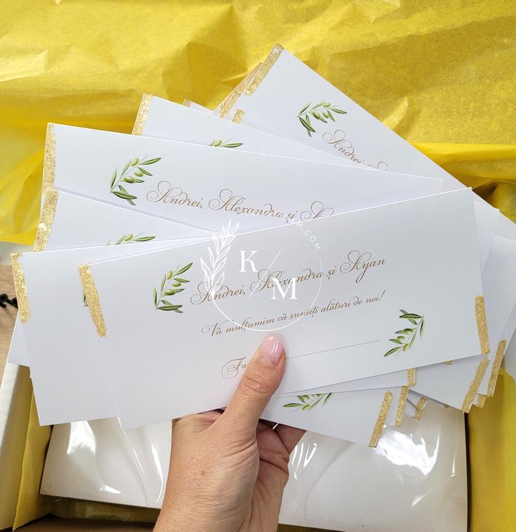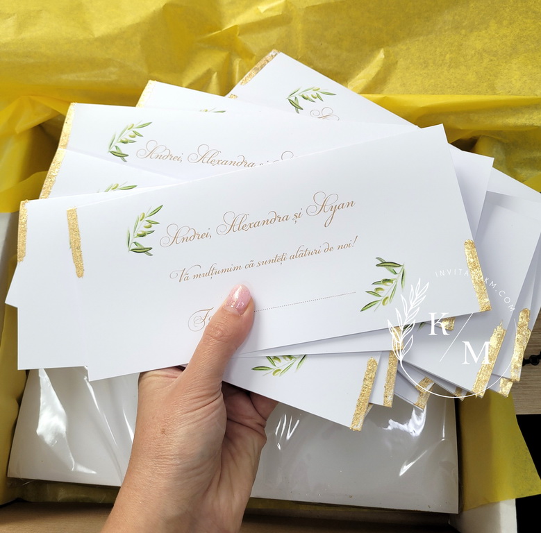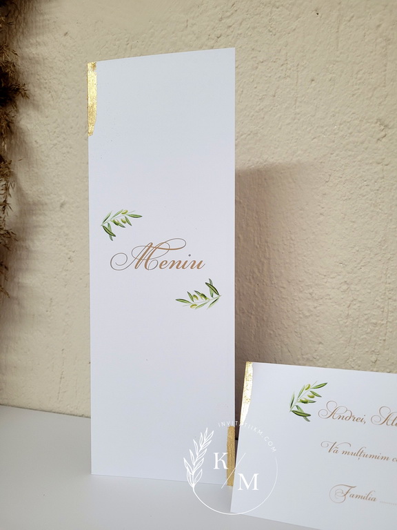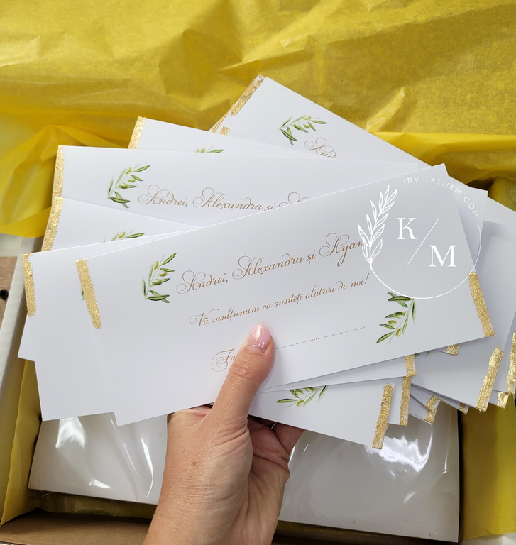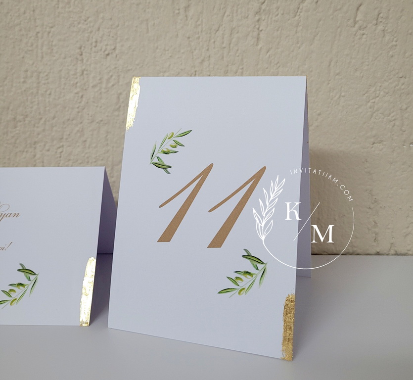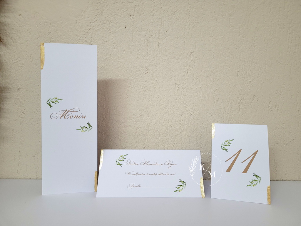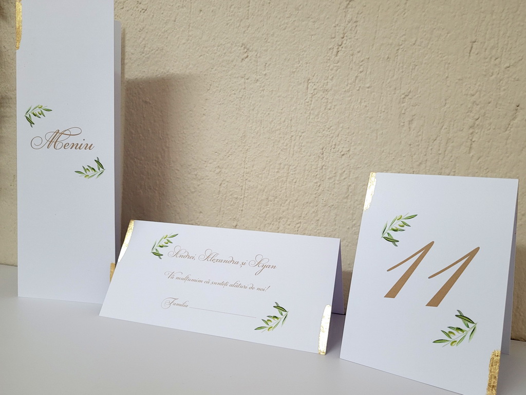 Meniuri de nunta, numere de masa, plicuri de bani/carduri de asezare cu detalii aurii aplicate manual, realizate cu foita aurie, si frunze verzi de maslin