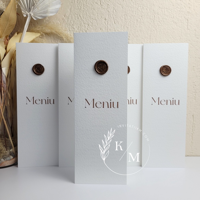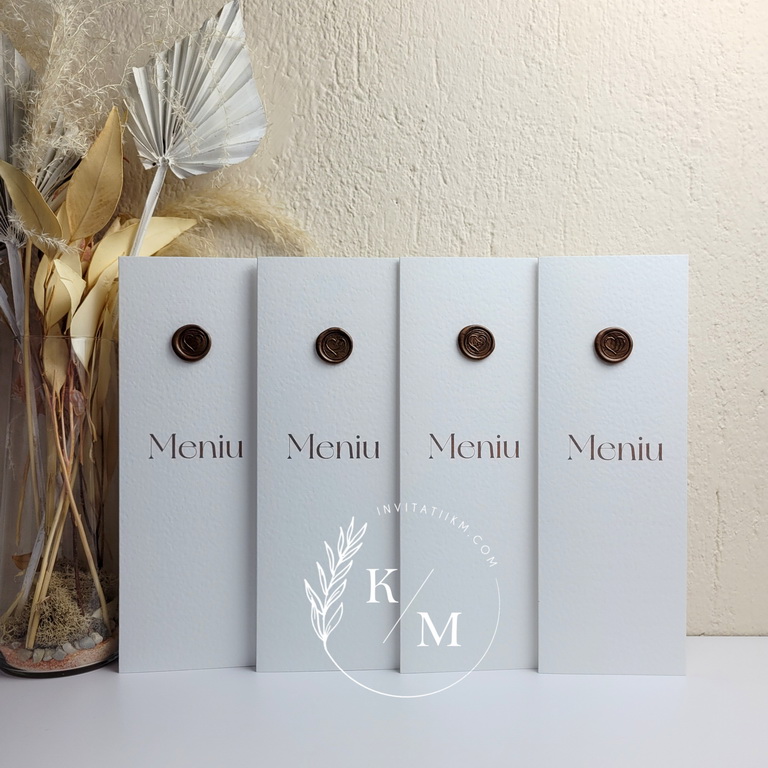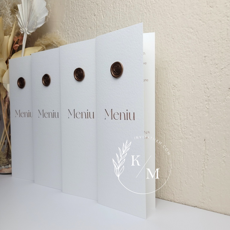 Meniu pentru nunta/botez realizat din carton alb texturat cu sigiliu