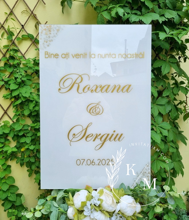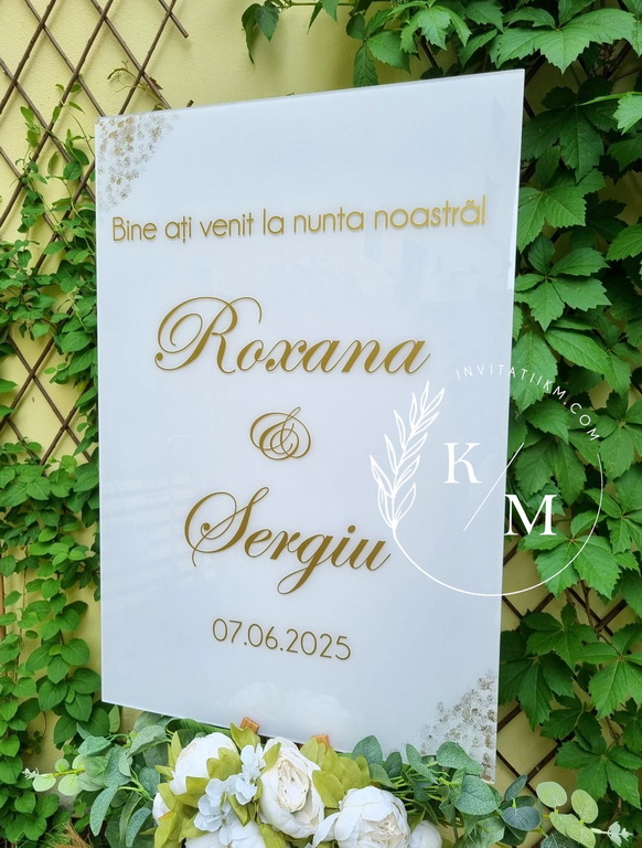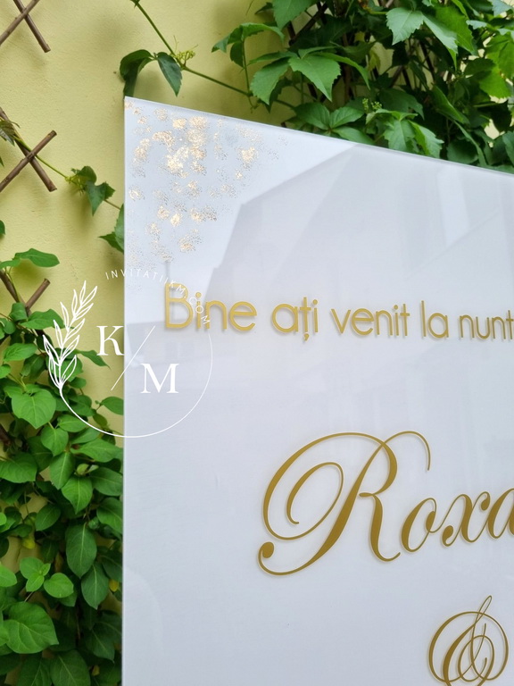 Panou de intampinare a invitatilor pentru nunta sau botez. Panoul de bun venit este realizat din plexiglas transparent, personalizat cu text din autocolant auriu, vopsit pe verso si detalii din foita aurie aplicate manual.