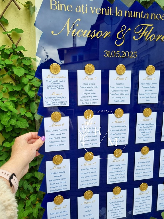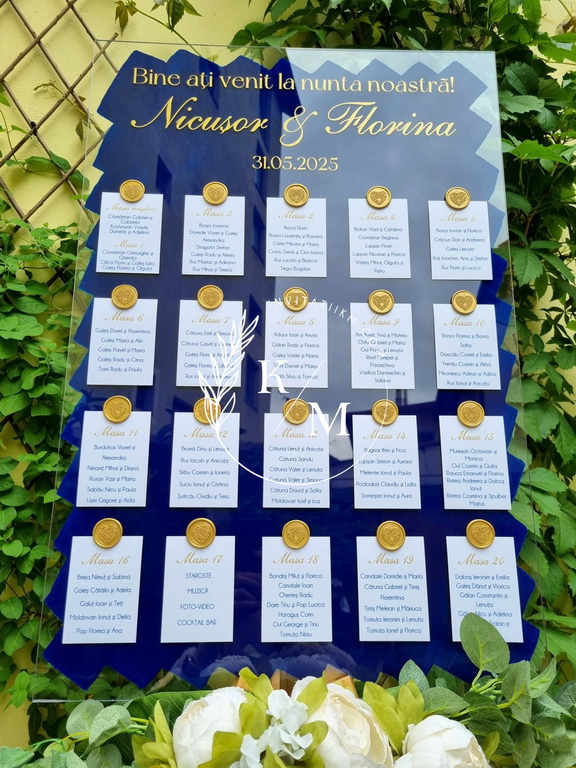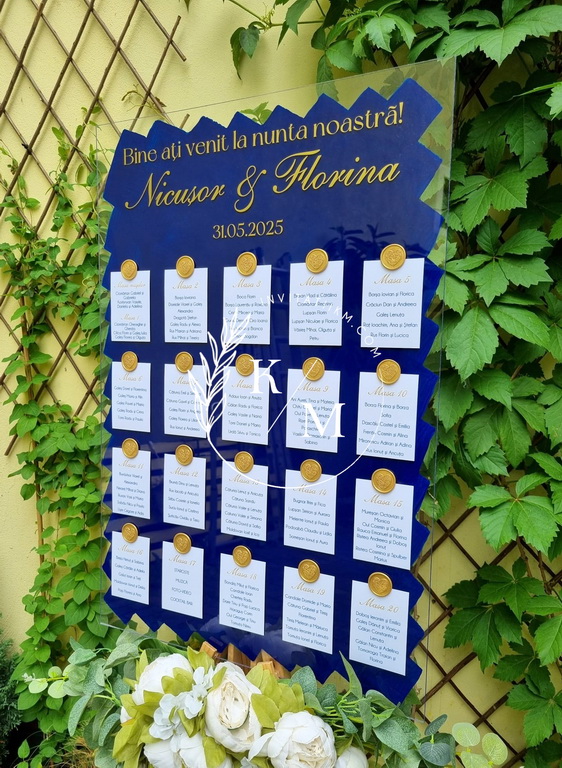 Panou de intampinare pentru nunta cu cartonase cu asezarea invitatilor la mese. Panoul este realizat din plexiglas transparent vopsit albastru royal/albastru regal pe verso, are dimensiunea 50 x 70 cm, iar cartonasele sunt realizate din carton + sigiliu. In functie de numarul cartonaselor, acestea pot fi mai mari/mai micute. Se pot achizitiona impreuna sau separat.