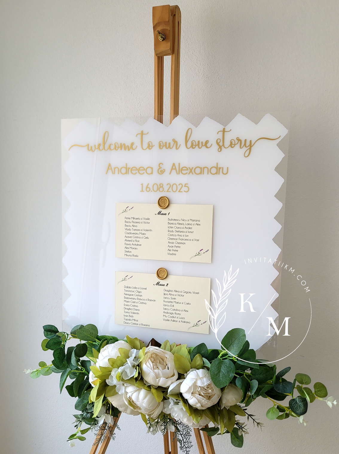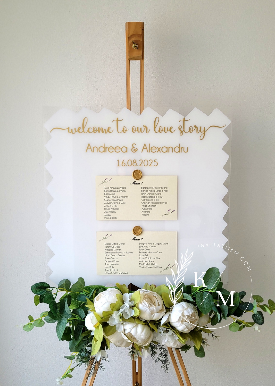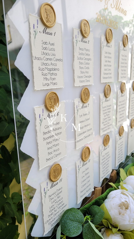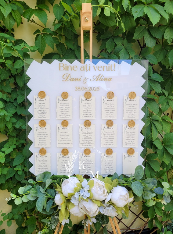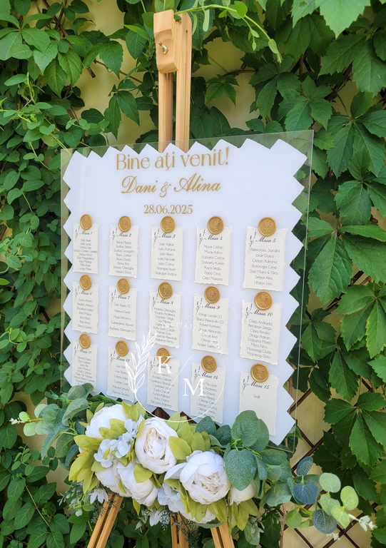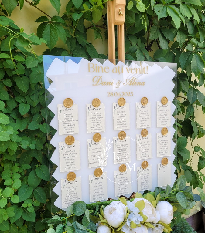 Panou de intampinare pentru nunta cu cartonase cu asezarea invitatilor la mese. Panoul este realizat din plexiglas transparent vopsit alb pe verso, are dimensiunea 50 x 50 cm, iar cartonasele sunt realizate din carton cu margini rupte manual + sigiliu. In functie de numarul cartonaselor, acestea pot fi mai mari/mai micute. Se pot achizitiona impreuna sau separat.
