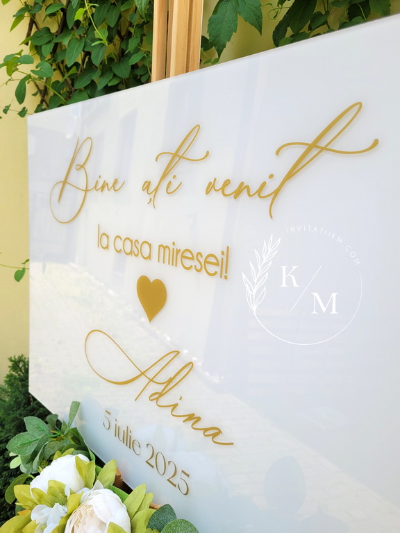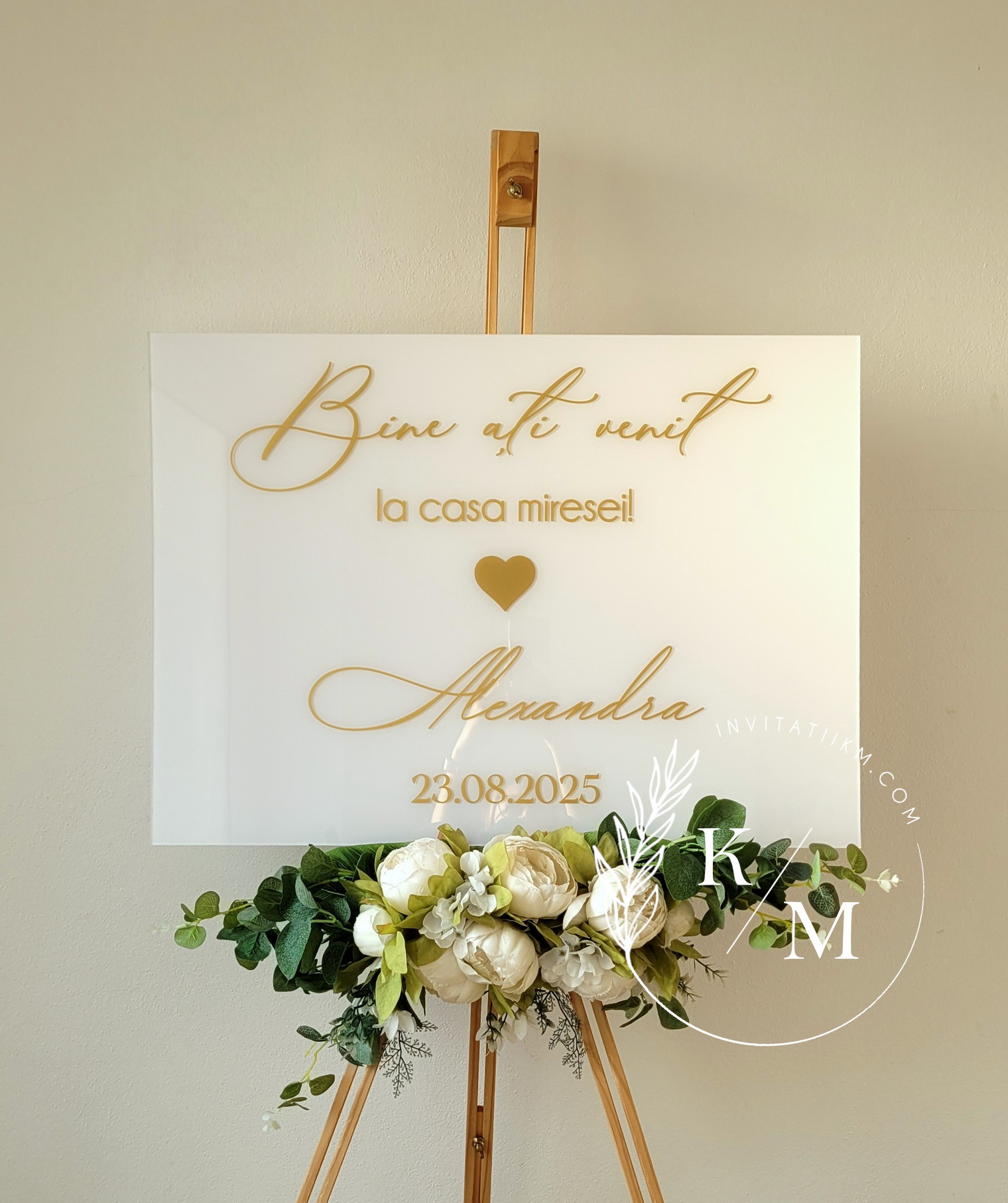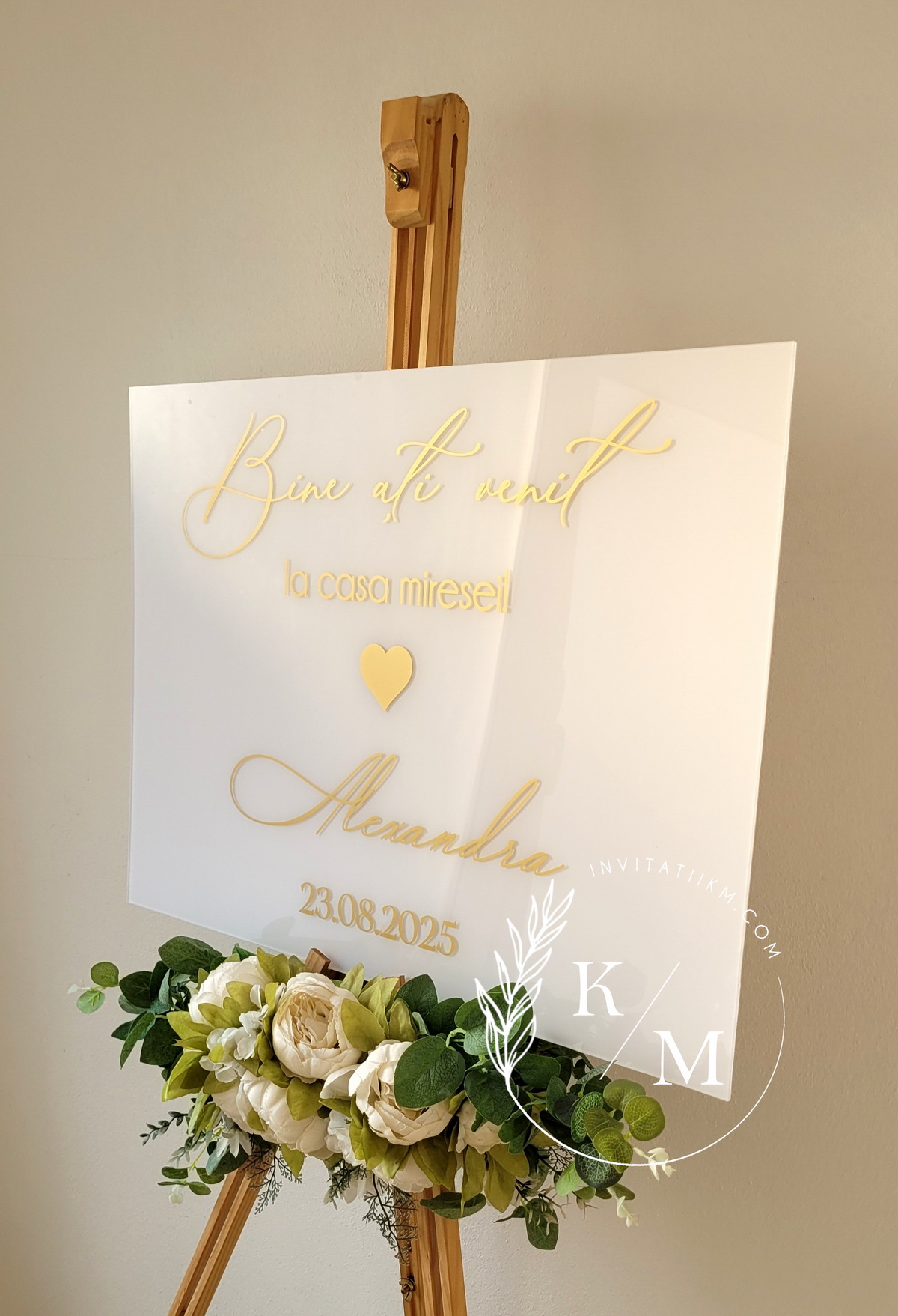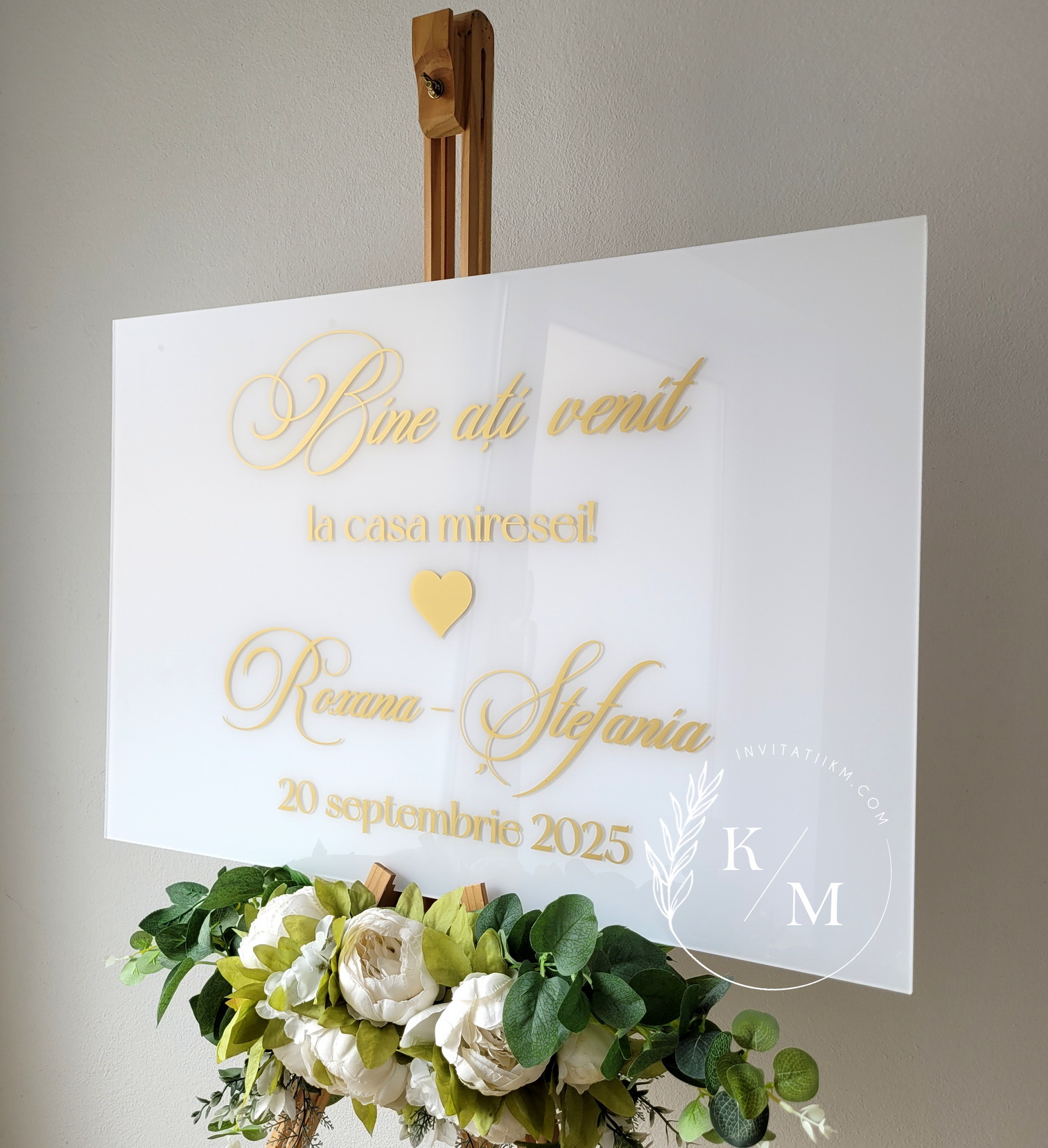 Set de doua panouri de intampinare pentru nunta, ce pot fi folosite pentru a ura bun venit invitatilor la casa miresei, mirelui sau nasilor. Panourile noastre de intampinare sunt realizate din plexiglas transparent, personalizate cu nume si data din autocolant auriu mat si vopsite in diverse culori.
