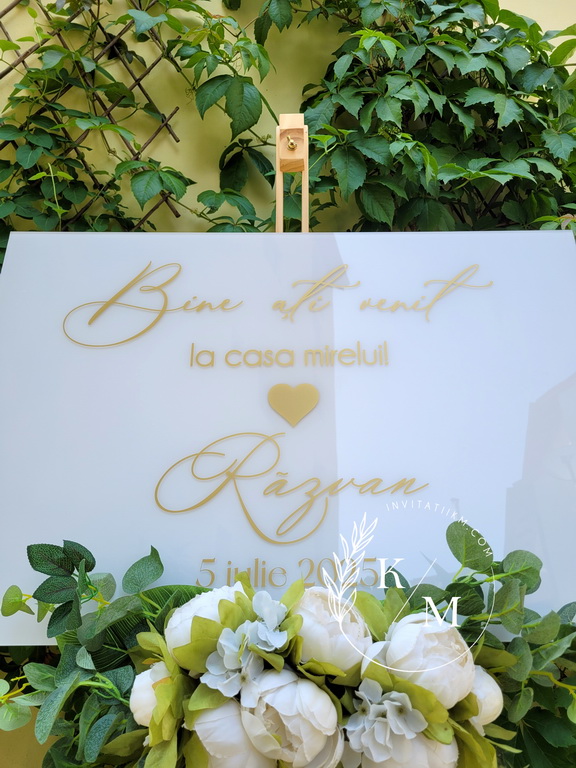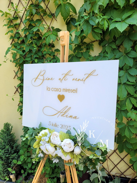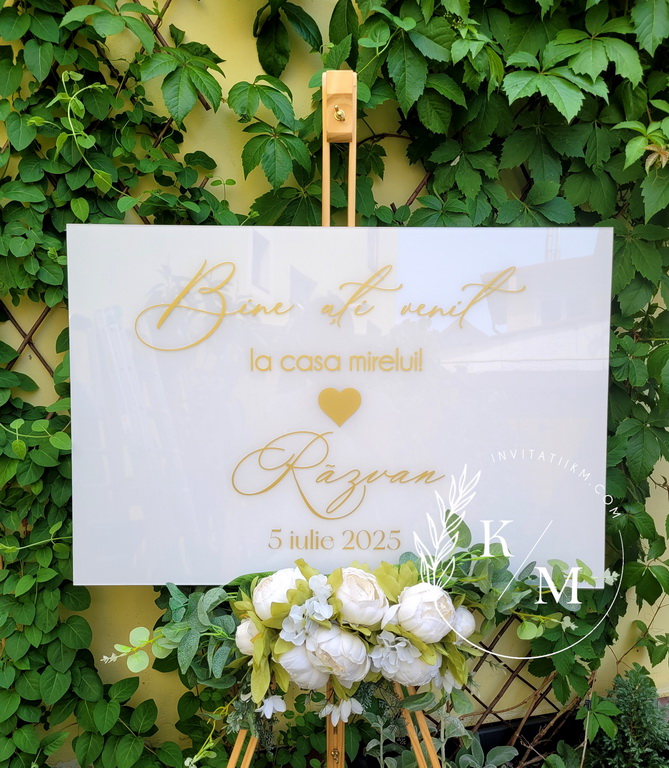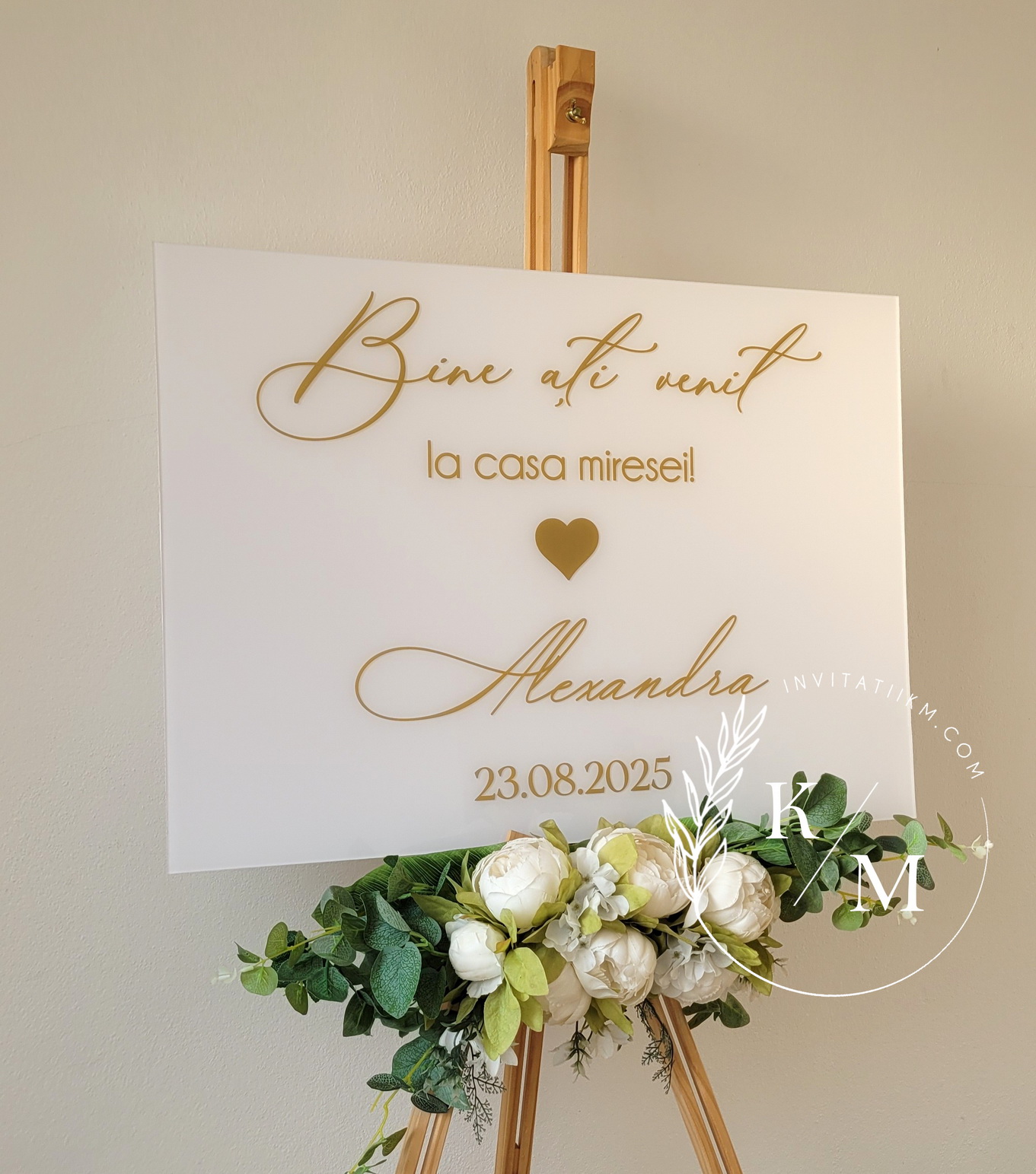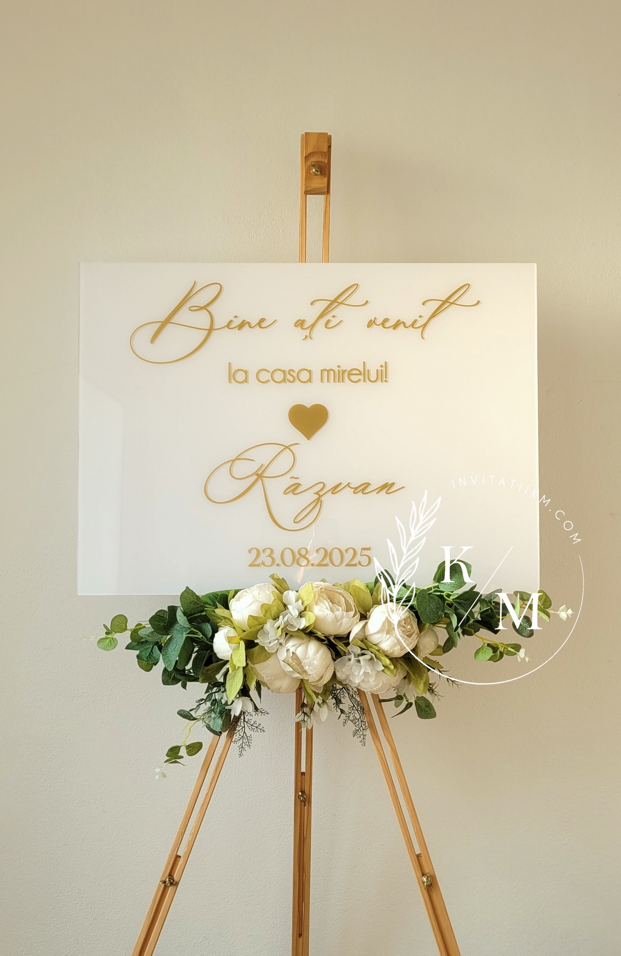 Set de doua panouri de intampinare pentru nunta, ce pot fi folosite pentru a ura bun venit invitatilor la casa miresei, mirelui sau nasilor. Panourile noastre de intampinare sunt realizate din plexiglas transparent, personalizate cu nume si data din autocolant auriu mat si vopsite in diverse culori.