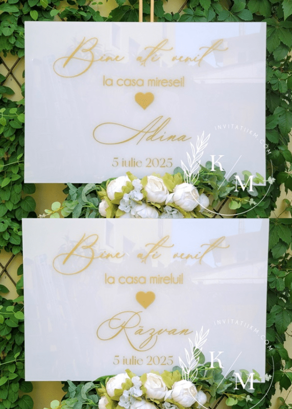 Set de doua panouri de intampinare pentru nunta, ce pot fi folosite pentru a ura bun venit invitatilor la casa miresei, mirelui sau nasilor. Panourile noastre de intampinare sunt realizate din plexiglas transparent, personalizate cu nume si data din autocolant auriu mat si vopsite in diverse culori.