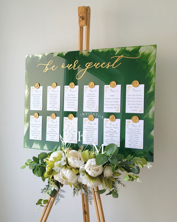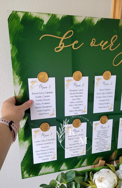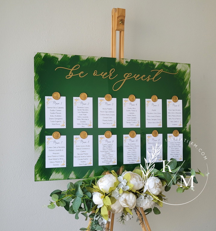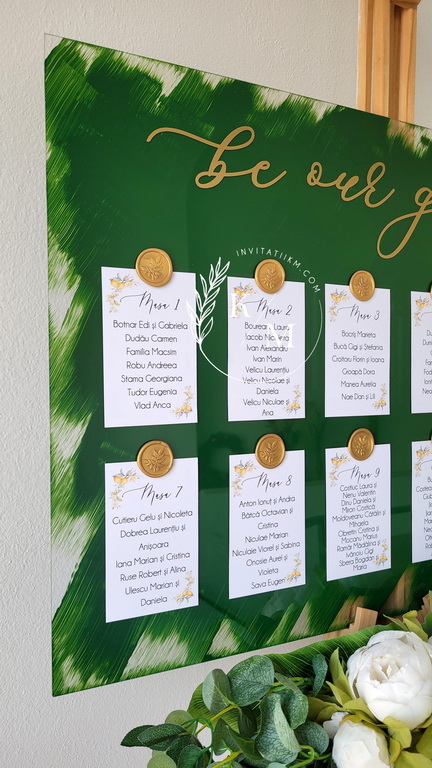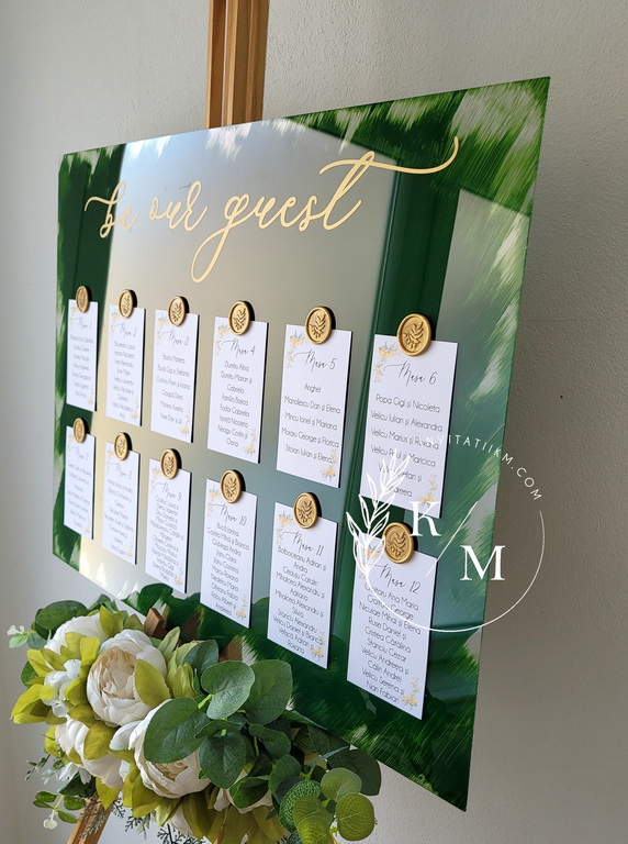 Panou de intampinare pentru nunta cu cartonase cu asezarea invitatilor la mese. Panoul este realizat din plexiglas transparent vopsit verde smarald pe verso, are dimensiunea 50 x 70 cm, iar cartonasele sunt realizate din carton + sigiliu, cu design cu tematica mediteraneana/lamai. In functie de numarul cartonaselor, acestea pot fi mai mari/mai micute. Se pot achizitiona impreuna sau separat.