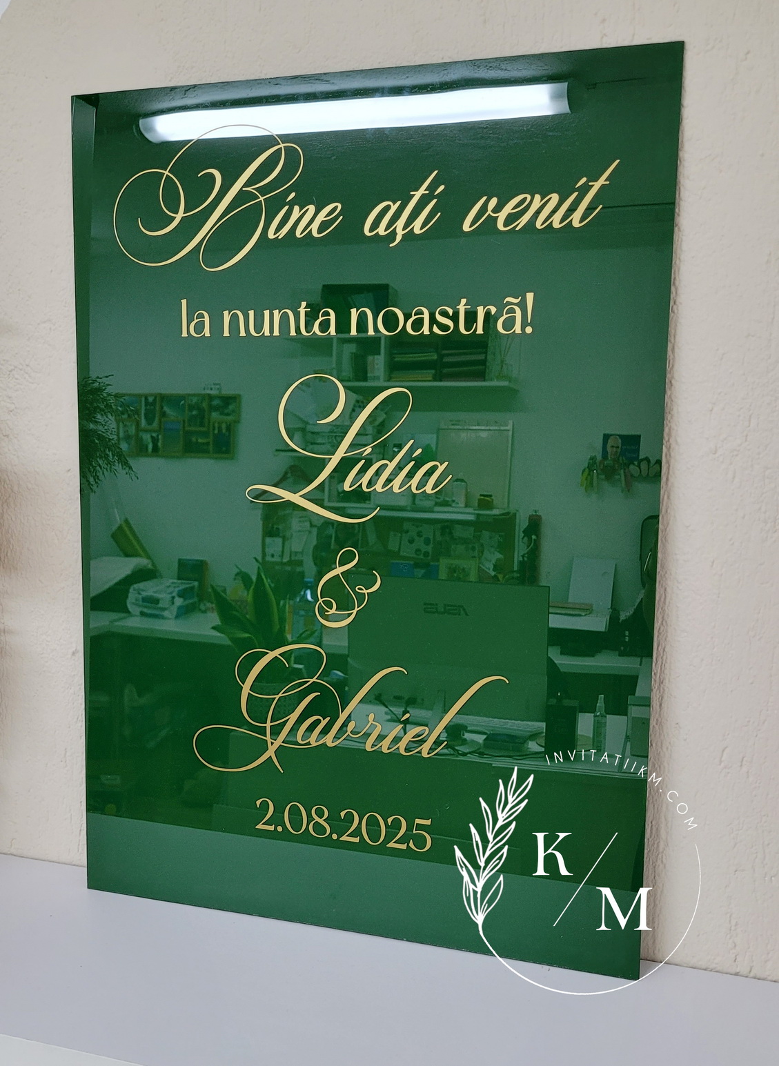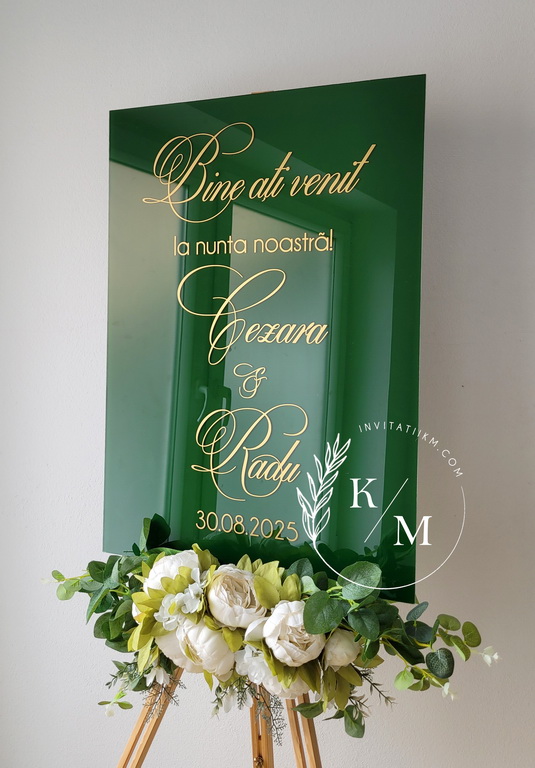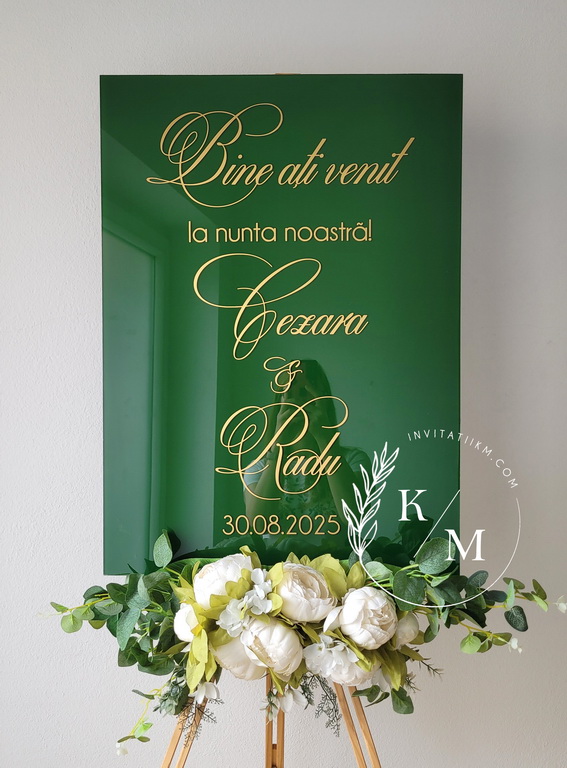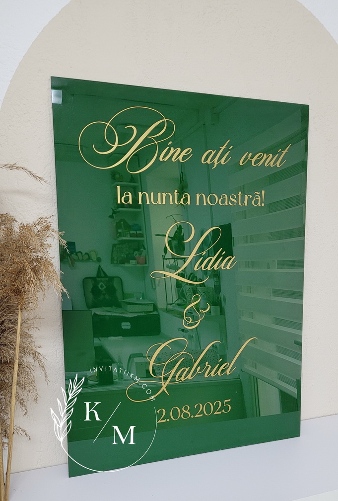 Panou de intampinare a invitatilor pentru nunta sau botez, realizat din plexiglas transparent, personalizat cu text din autocolant auriu si fundal vopsit verde smarald.