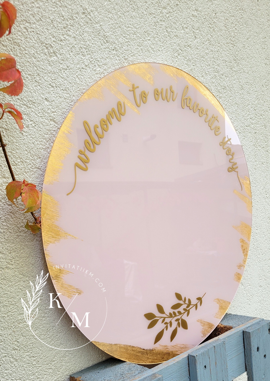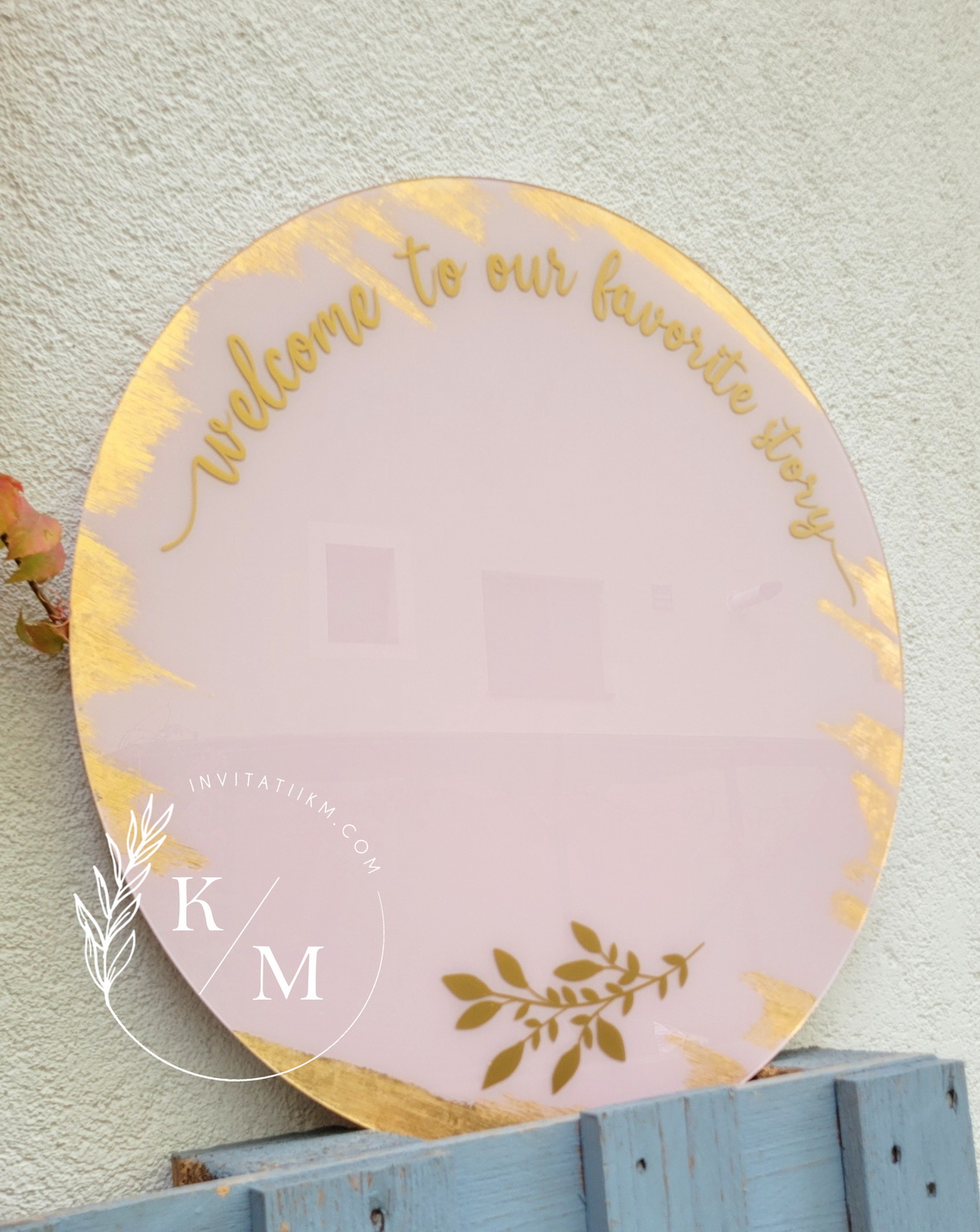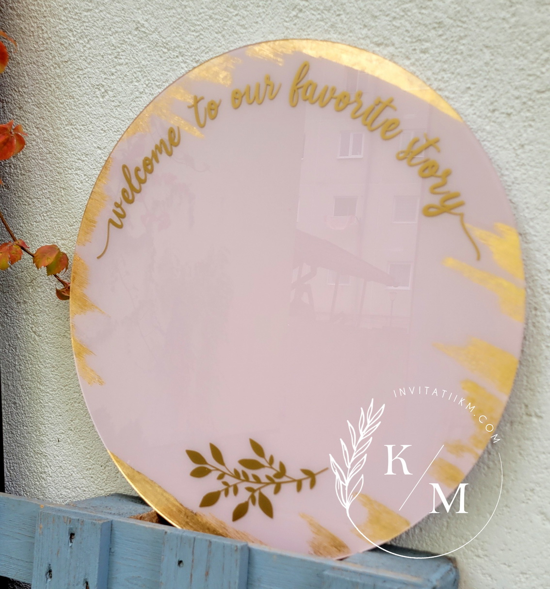 Panou de bun venit pentru nuntă din plexiglas roz prăfuit, cu text auriu și foiță aurie aplicată manual. Elegant și personalizabil. Un panou decorativ rafinat, realizat din plexiglas transparent, cu un diametru de 55 cm, vopsit manual în nuanța elegantă de roz prăfuit/roz antic. Detaliile sunt completate de foiță aurie aplicată manual, element floral din autocolant auriu și un text personalizat în tonuri de auriu și negru, pentru un contrast sofisticat. Ideal pentru decorul de nuntă, botez sau evenimente speciale.
