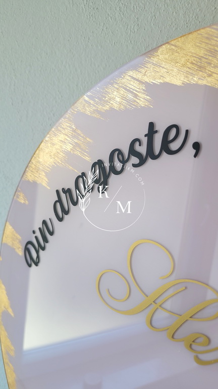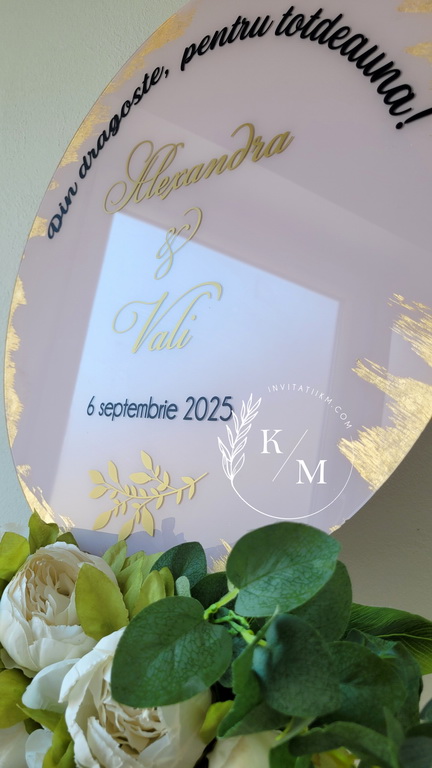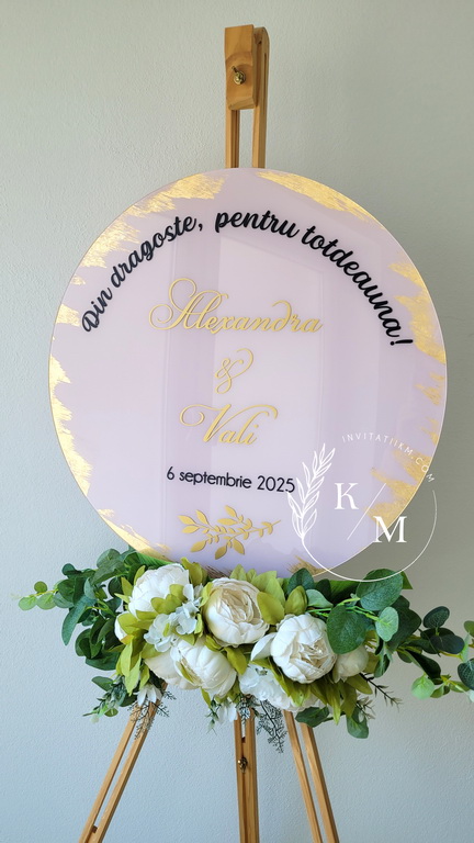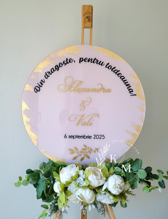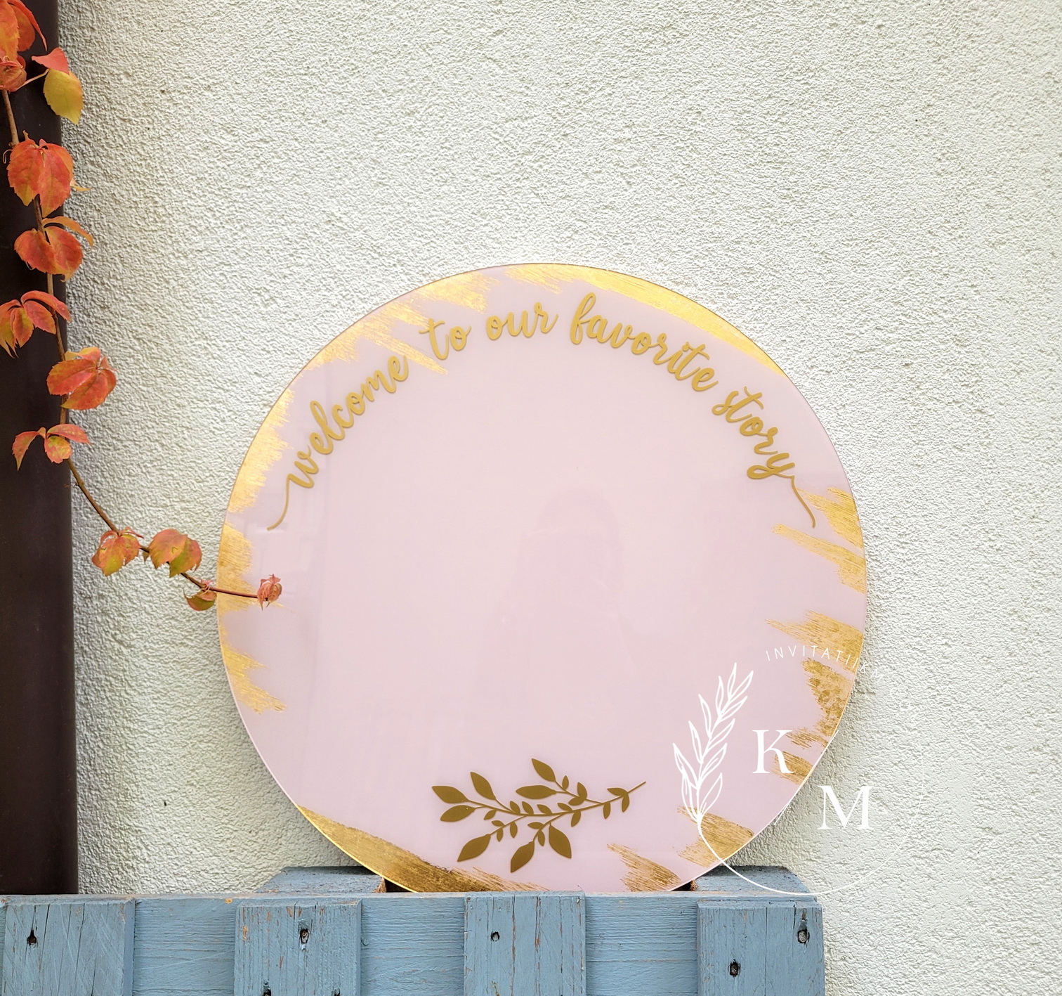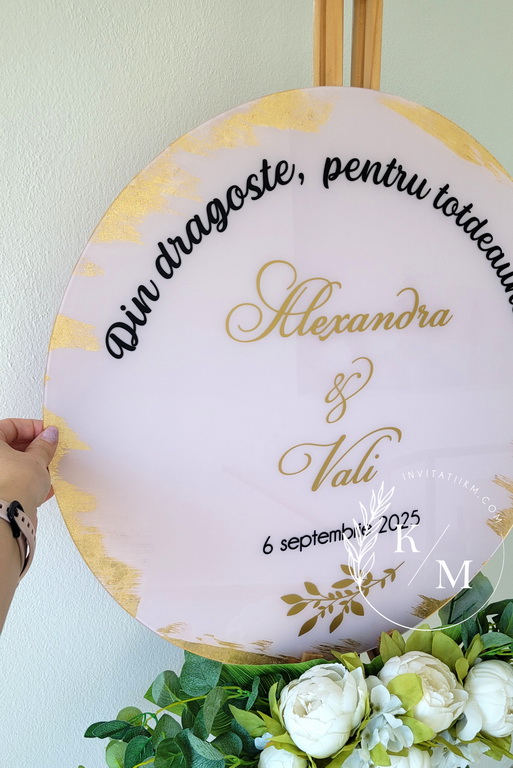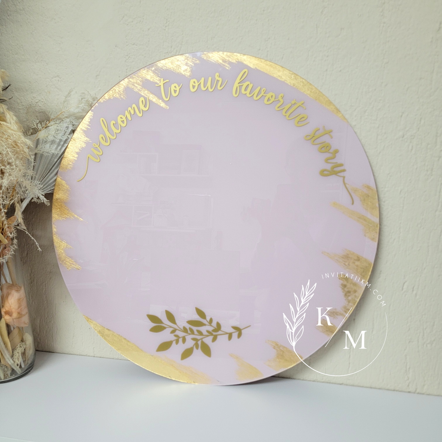 Panou de bun venit pentru nuntă din plexiglas roz prăfuit, cu text auriu și foiță aurie aplicată manual. Elegant și personalizabil. Un panou decorativ rafinat, realizat din plexiglas transparent, cu un diametru de 55 cm, vopsit manual în nuanța elegantă de roz prăfuit/roz antic. Detaliile sunt completate de foiță aurie aplicată manual, element floral din autocolant auriu și un text personalizat în tonuri de auriu și negru, pentru un contrast sofisticat. Ideal pentru decorul de nuntă, botez sau evenimente speciale.