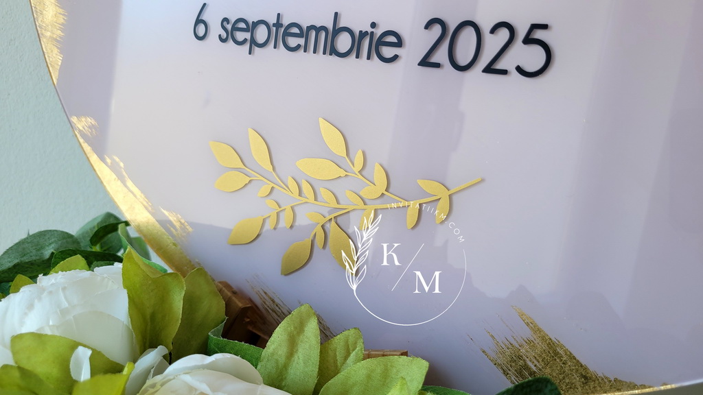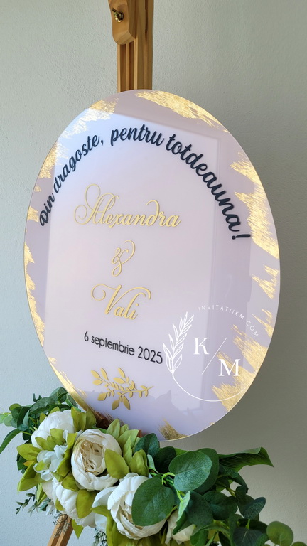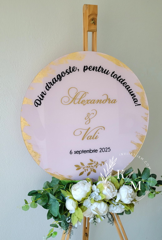 Panou de bun venit pentru nuntă din plexiglas roz prăfuit, cu text auriu și foiță aurie aplicată manual. Elegant și personalizabil. Un panou decorativ rafinat, realizat din plexiglas transparent, cu un diametru de 55 cm, vopsit manual în nuanța elegantă de roz prăfuit/roz antic. Detaliile sunt completate de foiță aurie aplicată manual, element floral din autocolant auriu și un text personalizat în tonuri de auriu și negru, pentru un contrast sofisticat. Ideal pentru decorul de nuntă, botez sau evenimente speciale.