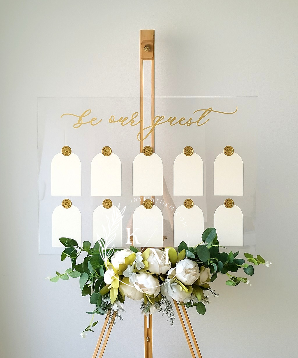 Panou de intampinare pentru nunta cu cartonase cu asezarea invitatilor la mese. Panoul este realizat din plexiglas transparent, are dimensiunea 50 x 70 cm, iar cartonasele sunt realizate din carton texturat decupate in forma de arcada + sigiliu. In functie de numarul cartonaselor, acestea pot fi mai mari/mai micute. Se pot achizitiona impreuna sau separat.
