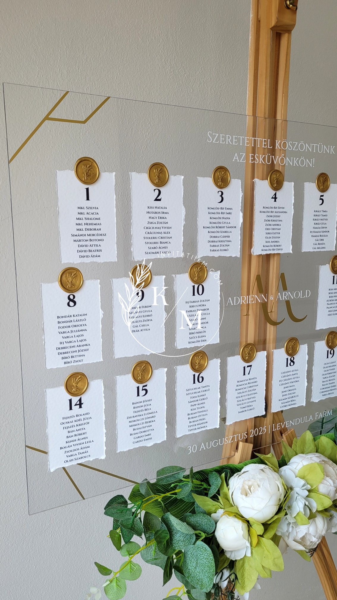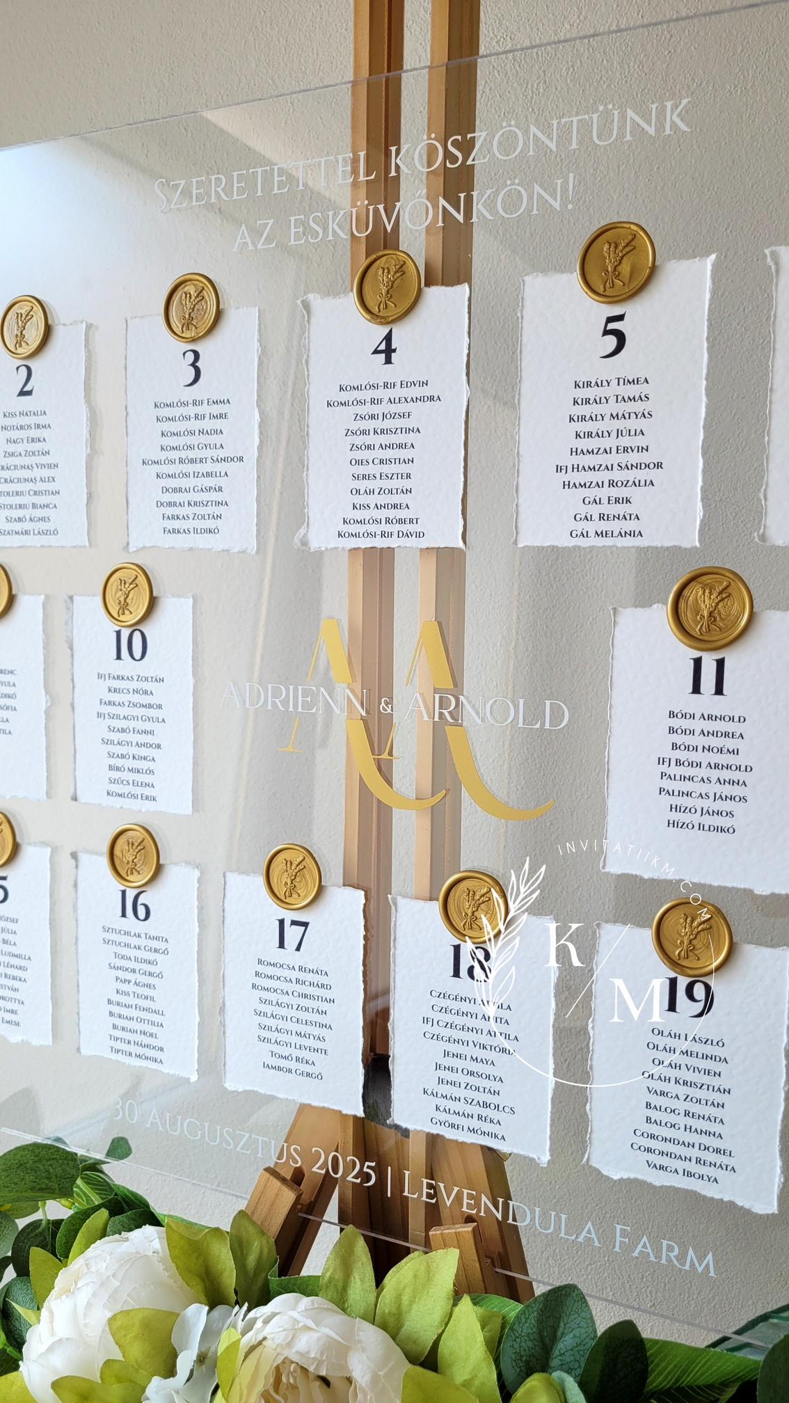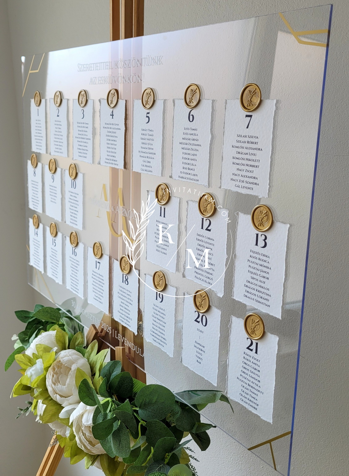 Panou de intampinare pentru nunta cu cartonase cu asezarea invitatilor la mese. Panoul este realizat din plexiglas transparent, are dimensiunea 50 x 70 cm, iar cartonasele sunt realizate din carton texturat cu marginile rupte manual + sigiliu. In functie de numarul cartonaselor, acestea pot fi mai mari/mai micute. Se pot achizitiona impreuna sau separat. Fiind realizat se client, design-ul nu se poate reproduce in totalitate.
