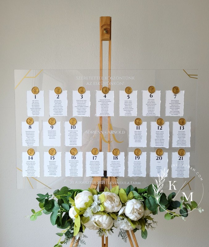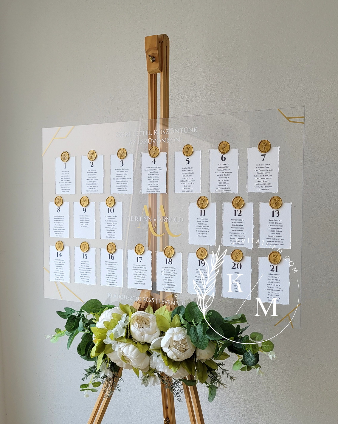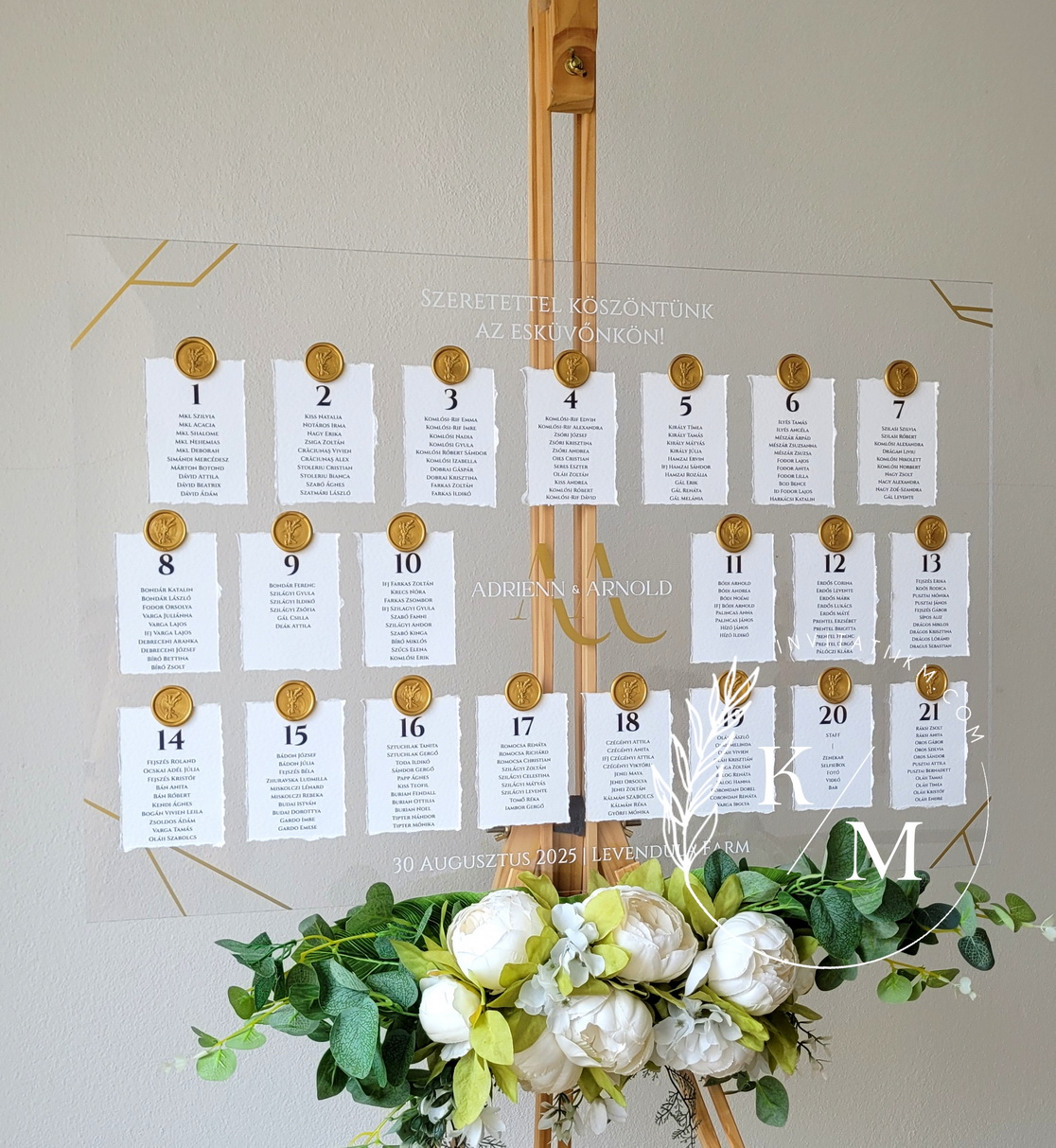 Panou de intampinare pentru nunta cu cartonase cu asezarea invitatilor la mese. Panoul este realizat din plexiglas transparent, are dimensiunea 50 x 70 cm, iar cartonasele sunt realizate din carton texturat cu marginile rupte manual + sigiliu. In functie de numarul cartonaselor, acestea pot fi mai mari/mai micute. Se pot achizitiona impreuna sau separat. Fiind realizat se client, design-ul nu se poate reproduce in totalitate.