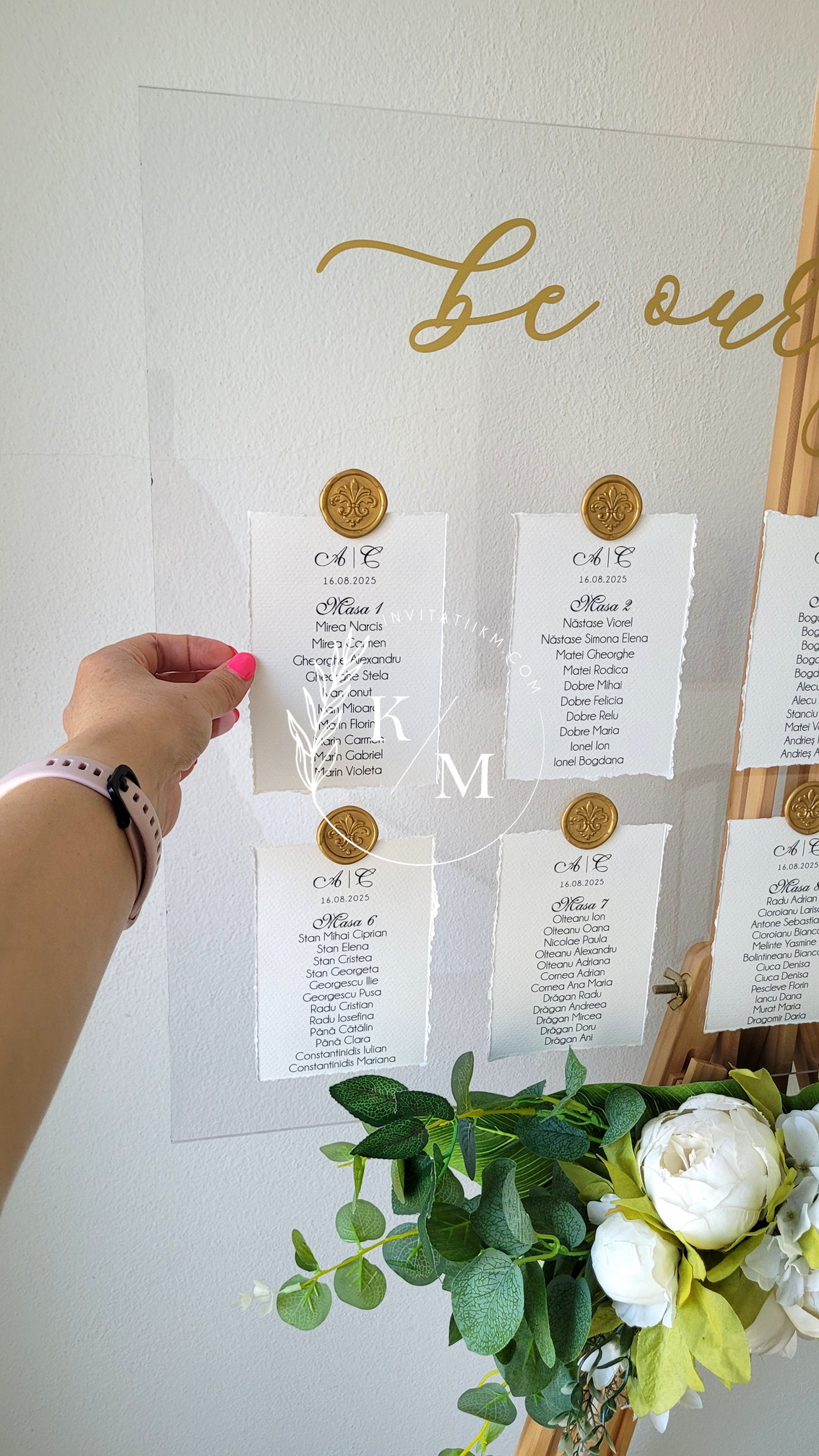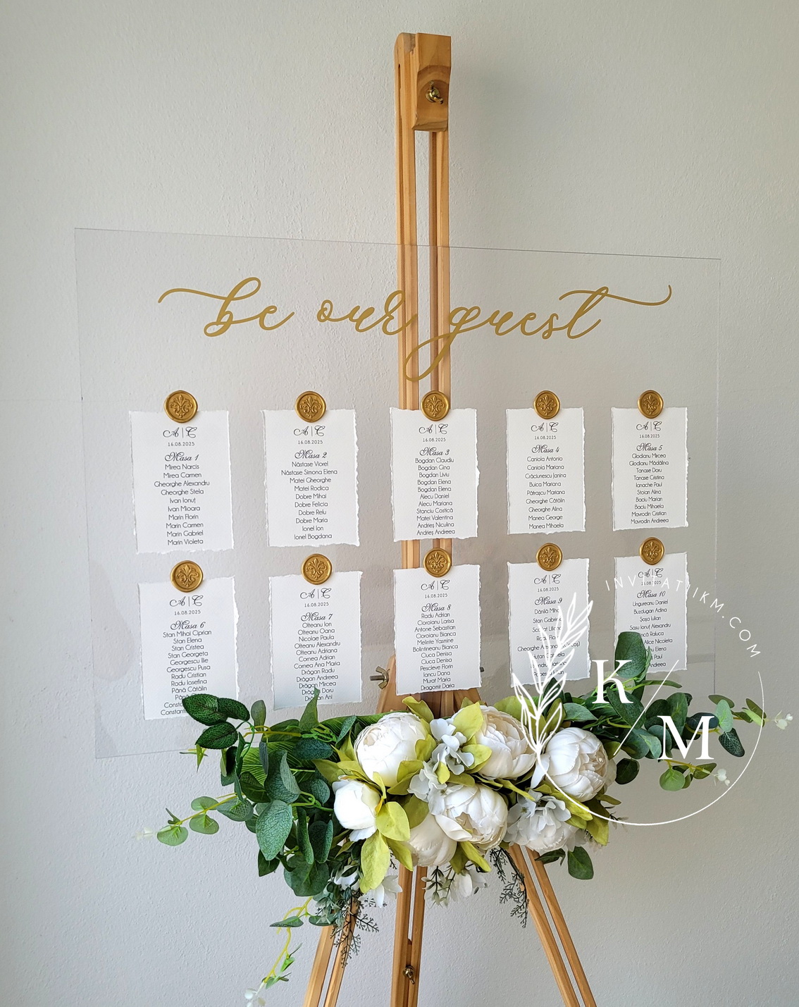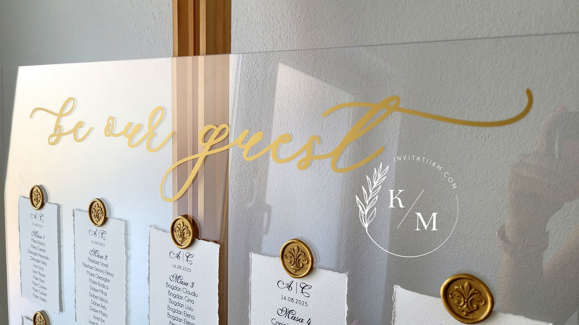 Panou de intampinare pentru nunta cu cartonase cu asezarea invitatilor la mese. Panoul este realizat din plexiglas transparent, are dimensiunea 50 x 70 cm, iar cartonasele sunt realizate din carton texturat cu marginile rupte manual + sigiliu. In functie de numarul cartonaselor, acestea pot fi mai mari/mai micute. Se pot achizitiona impreuna sau separat.