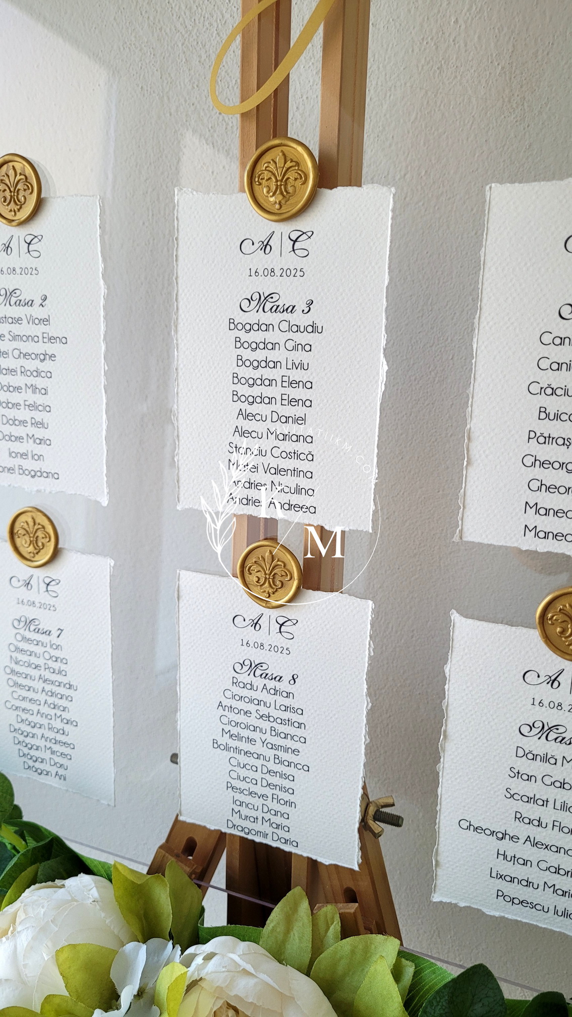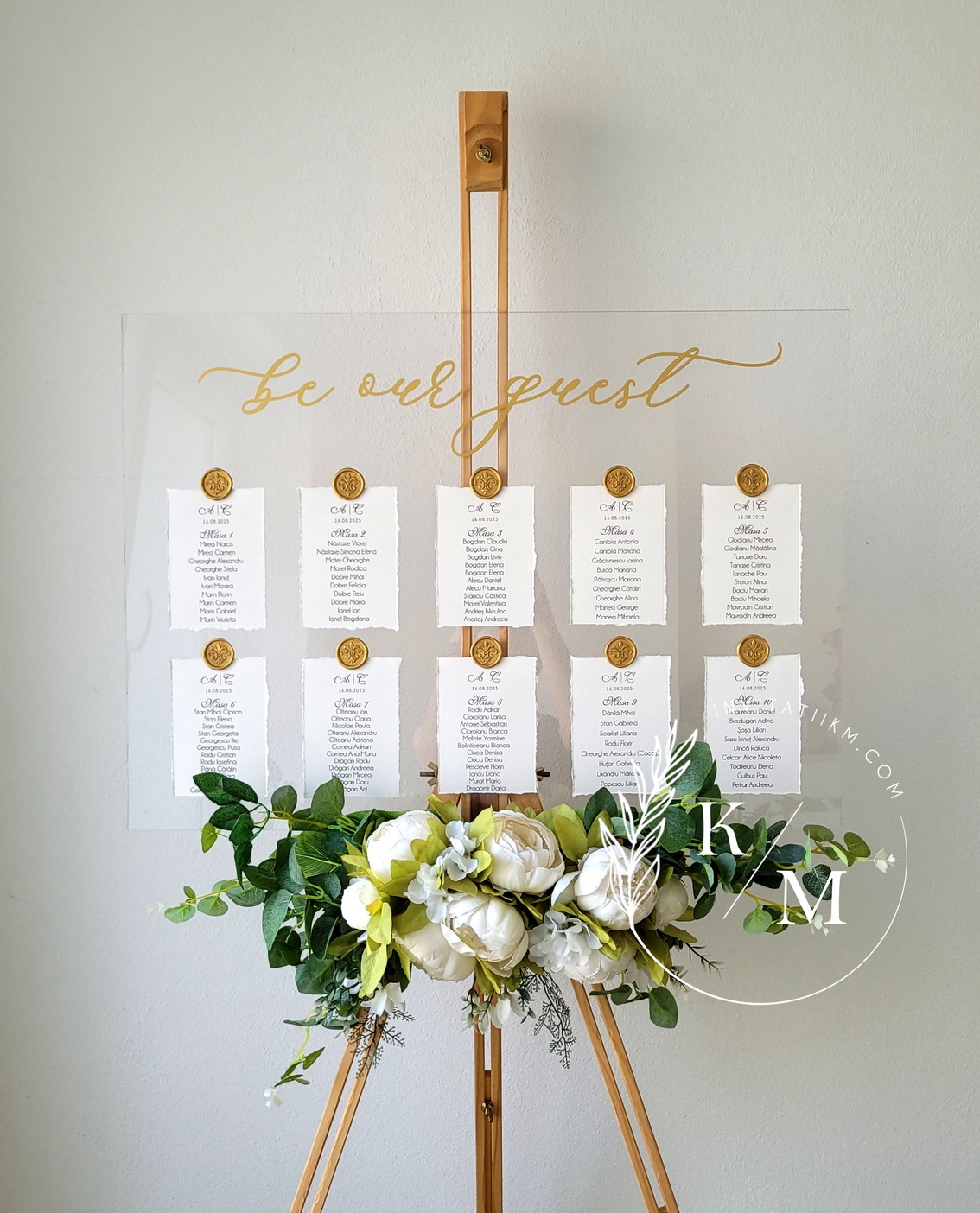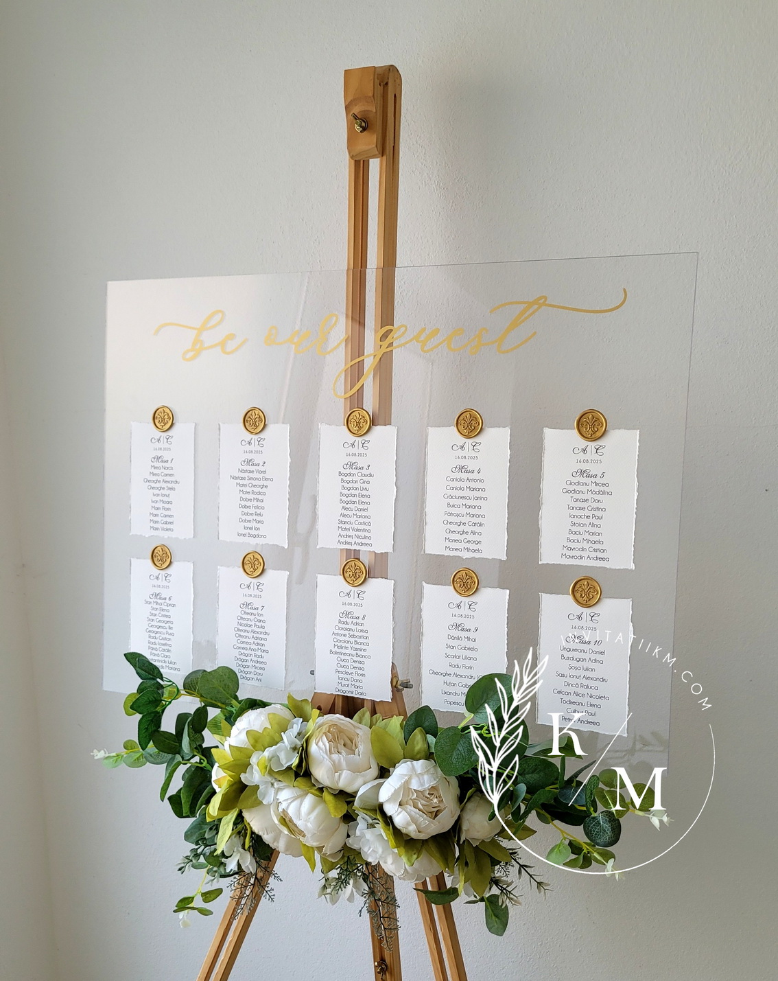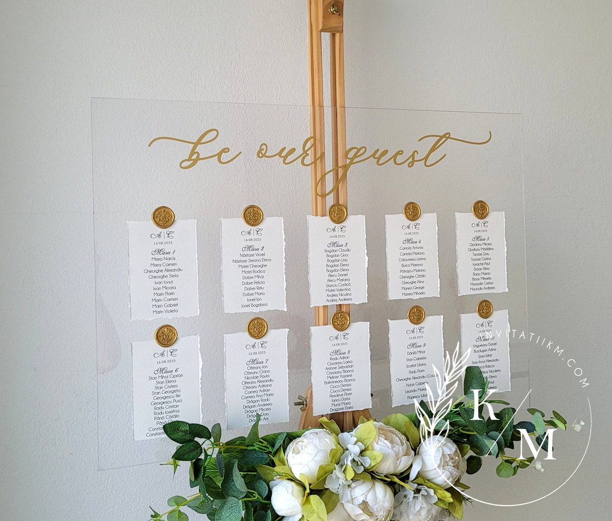 Panou de intampinare pentru nunta cu cartonase cu asezarea invitatilor la mese. Panoul este realizat din plexiglas transparent, are dimensiunea 50 x 70 cm, iar cartonasele sunt realizate din carton texturat cu marginile rupte manual + sigiliu. In functie de numarul cartonaselor, acestea pot fi mai mari/mai micute. Se pot achizitiona impreuna sau separat.