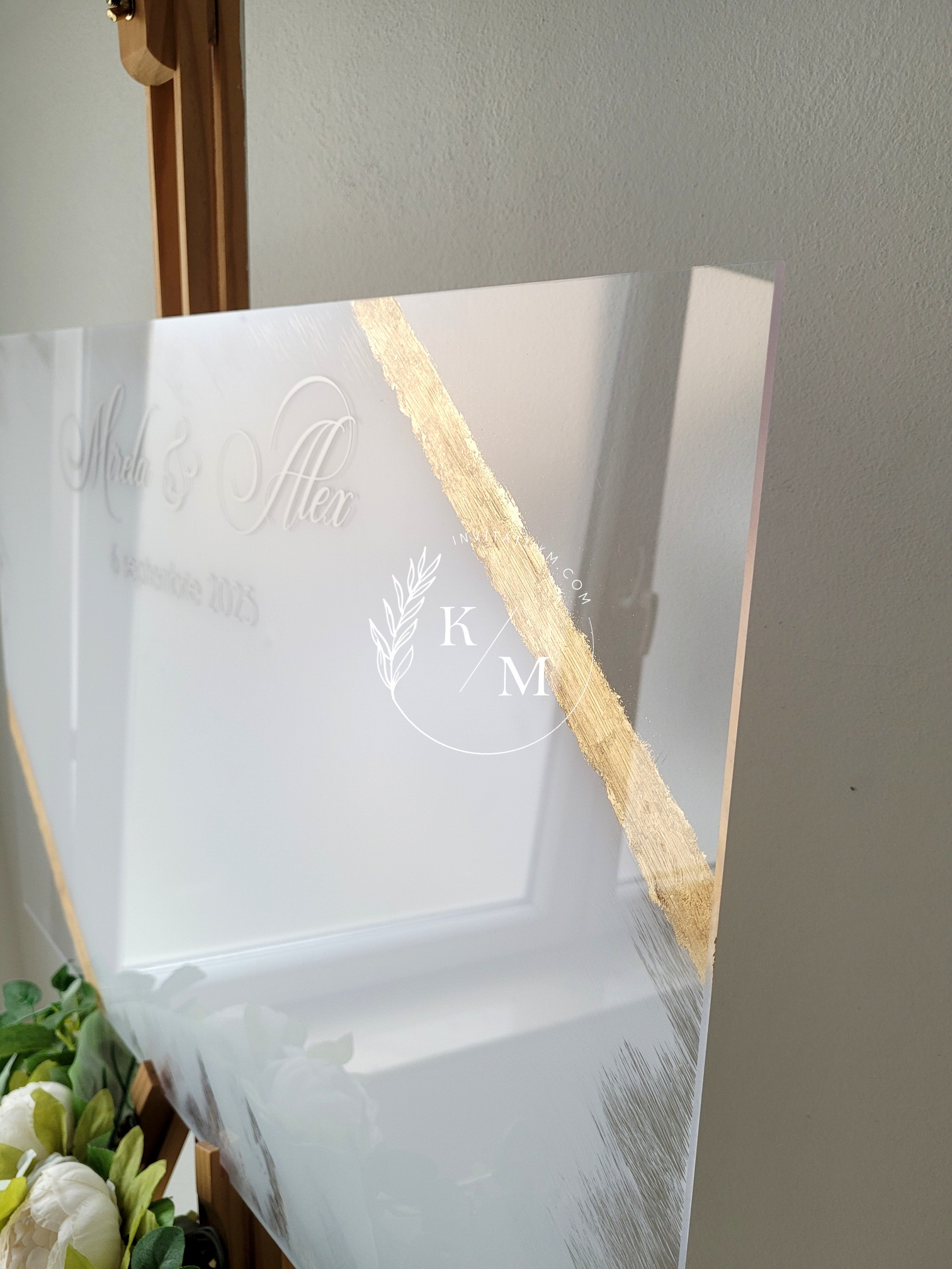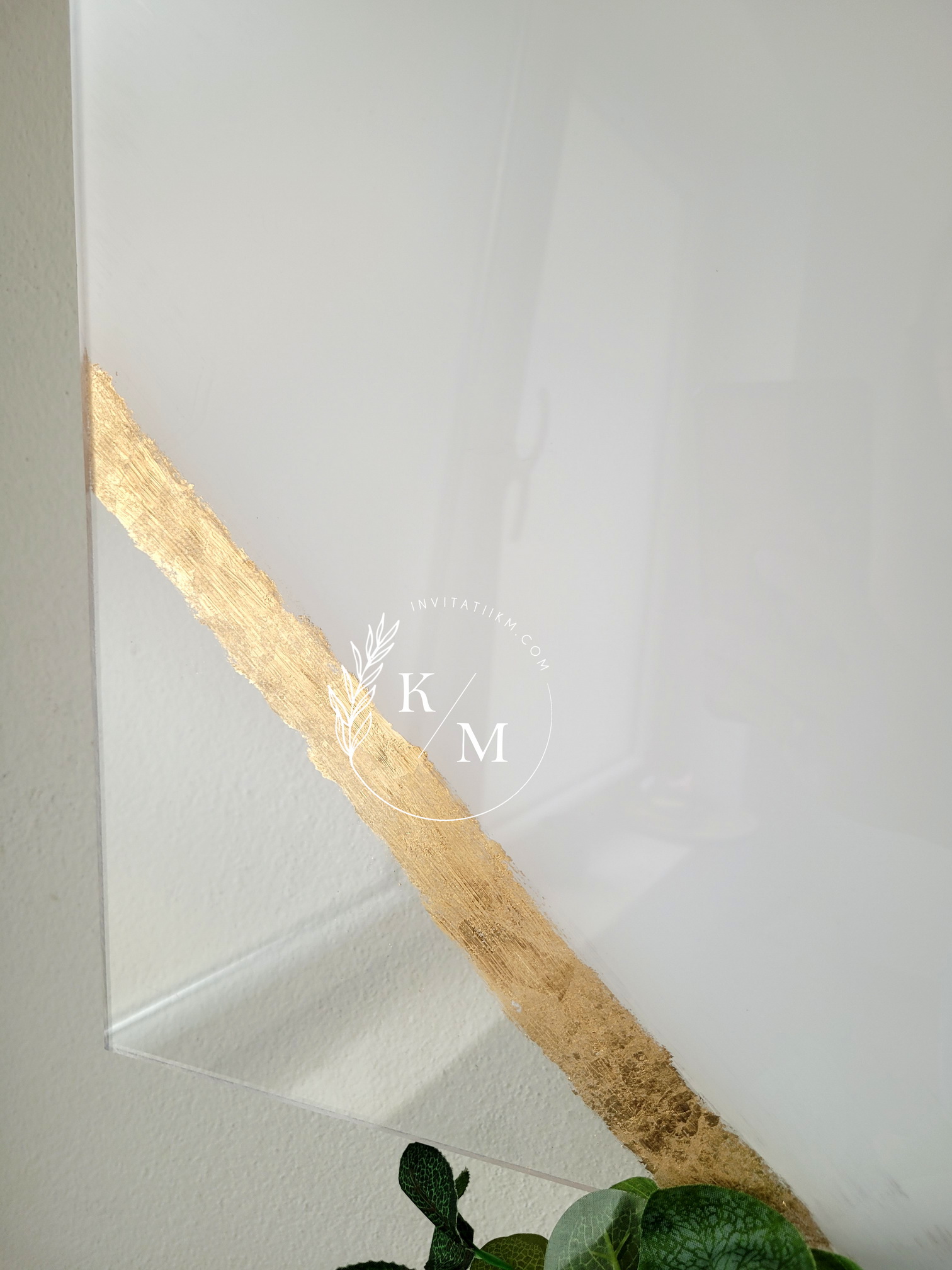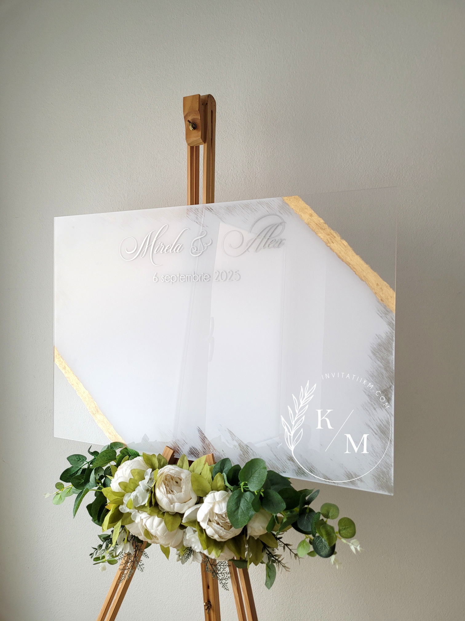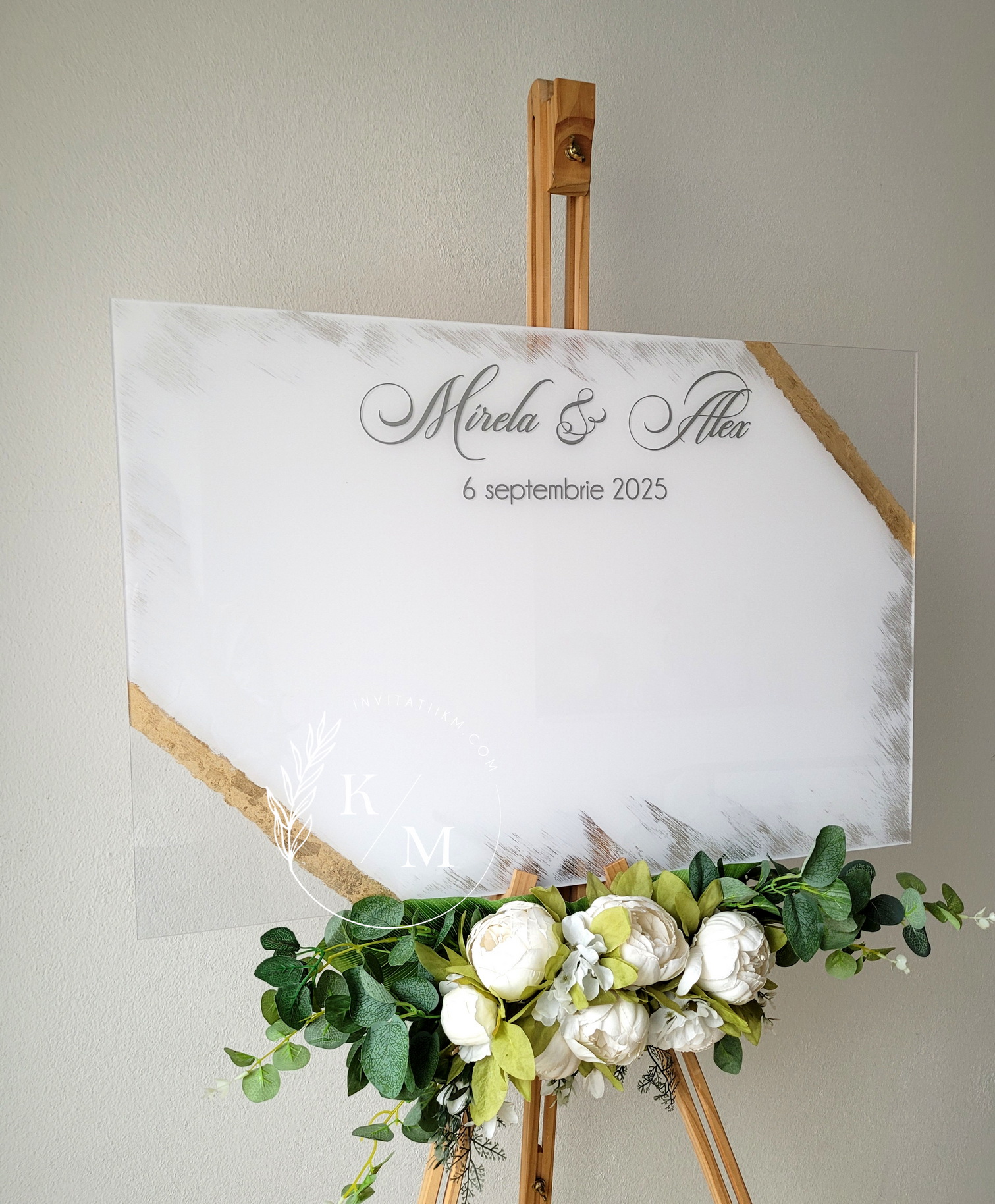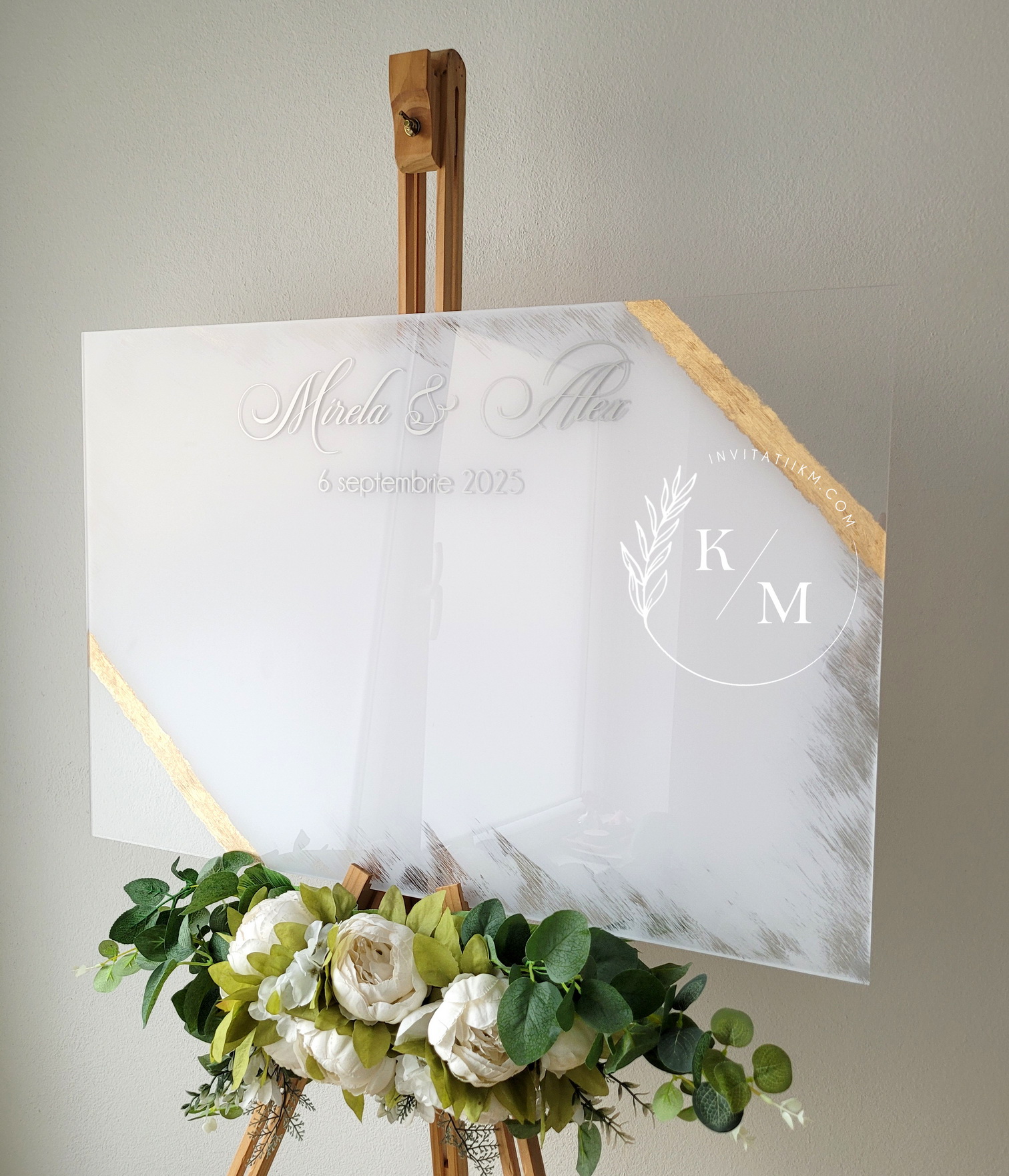Panou de intampinare la nunta pentru cartonase cu asezarea invitatilor la mese. Panoul este realizat din plexiglas transparent vopsit pe verso, are 2 linii elegante realizate din foita aurie aplicata manual, textul poate fi alb/negru/auriu/argintiu si are dimensiunea aprox. 50 x 70 cm. In functie de cate liste aveti, textul poate fi mai mare/mai mic.