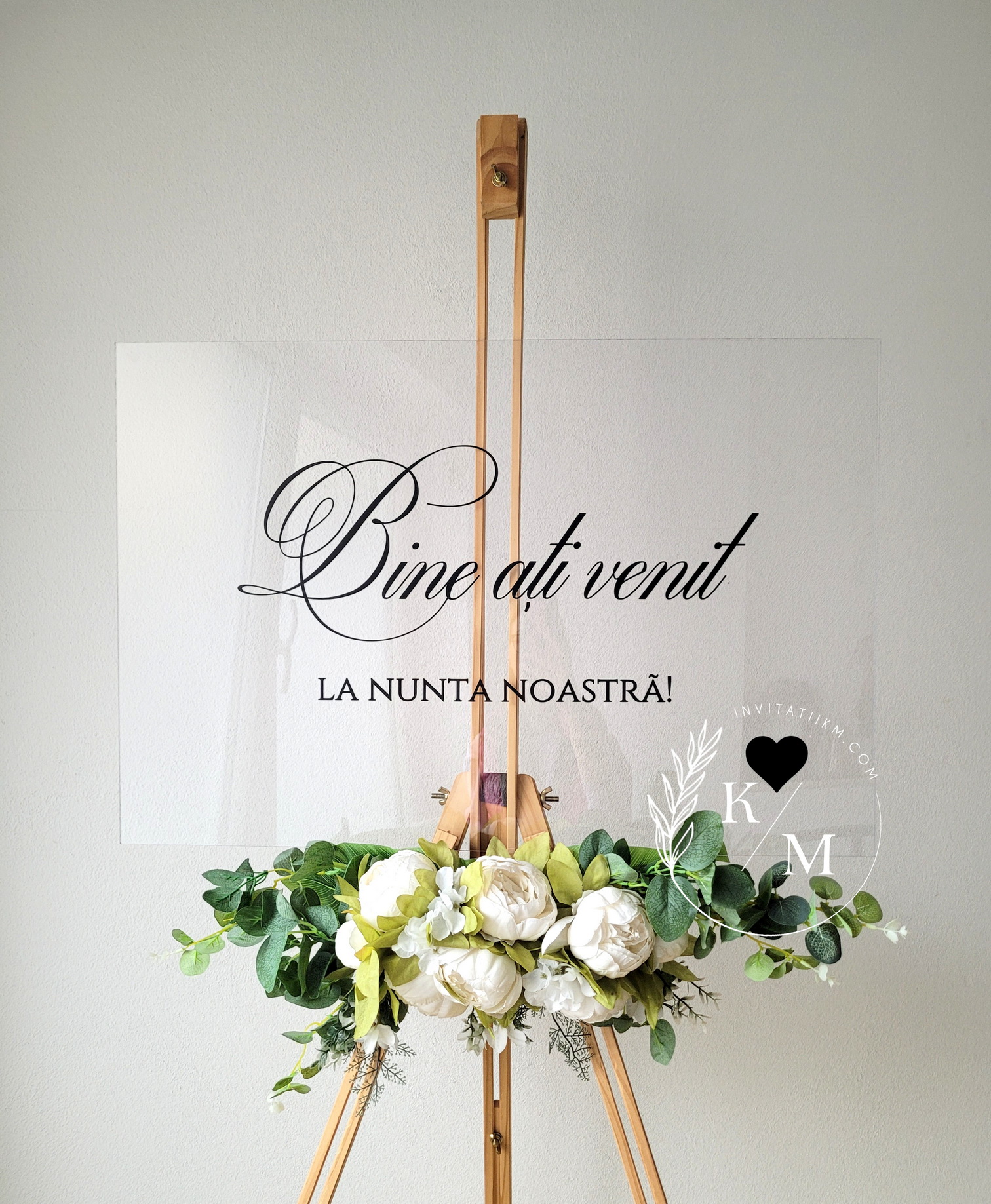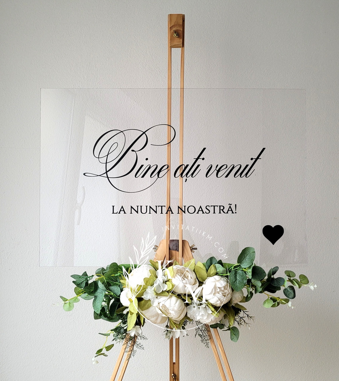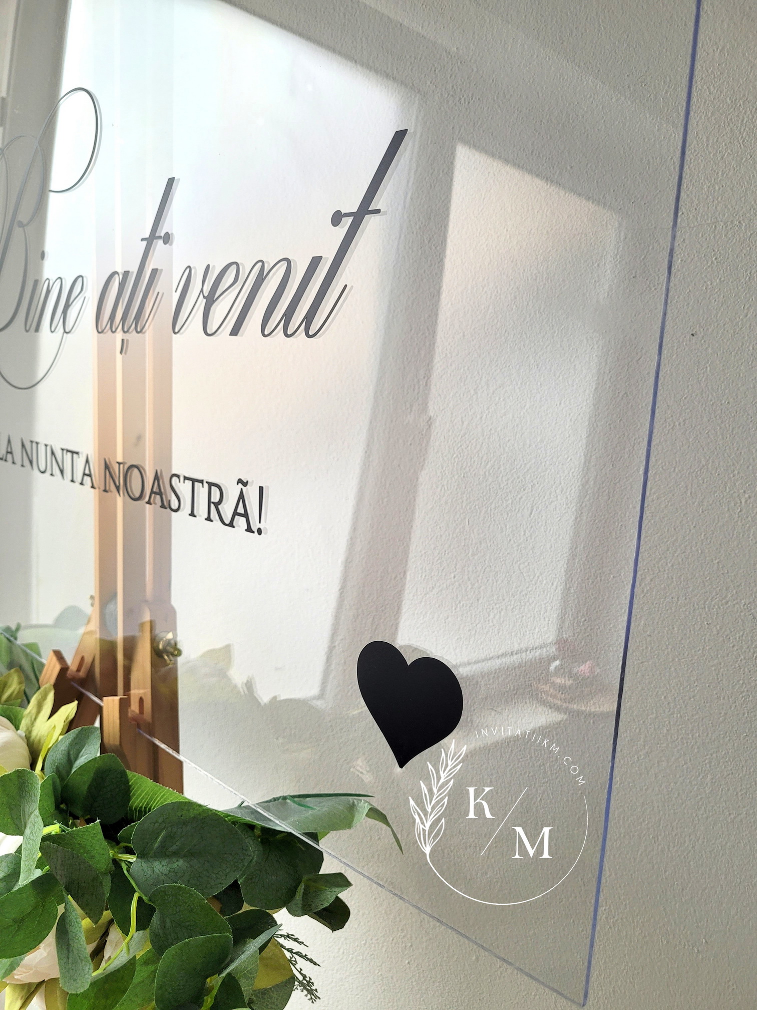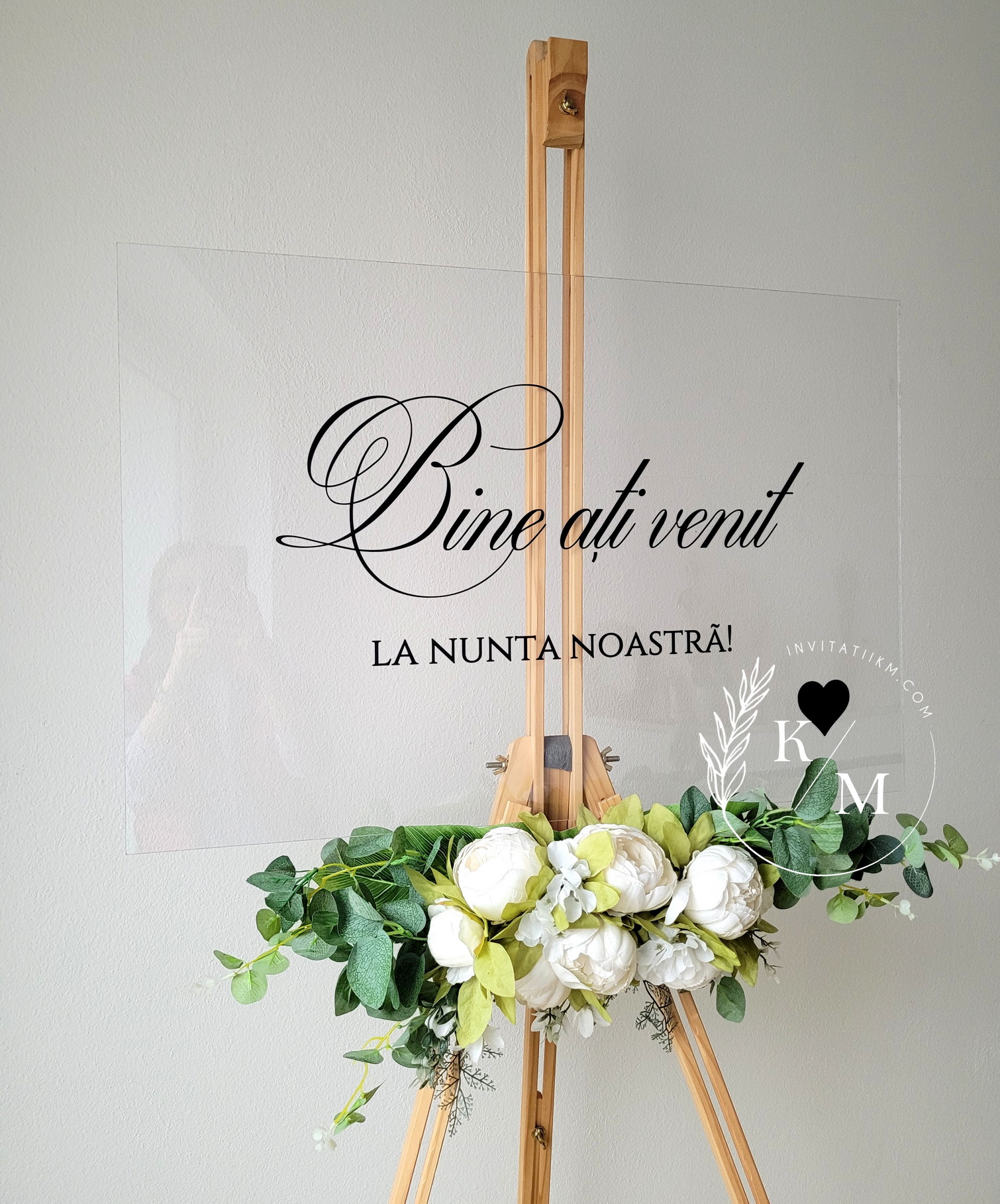 Panou de intampinare a invitatilor pentru nunta sau botez. Panoul de bun venit este realizat din plexiglas transparent, personalizat cu text din autocolant alb/negru/auriu/argintiu si are dimensiunea aprox. 50×70 cm.
