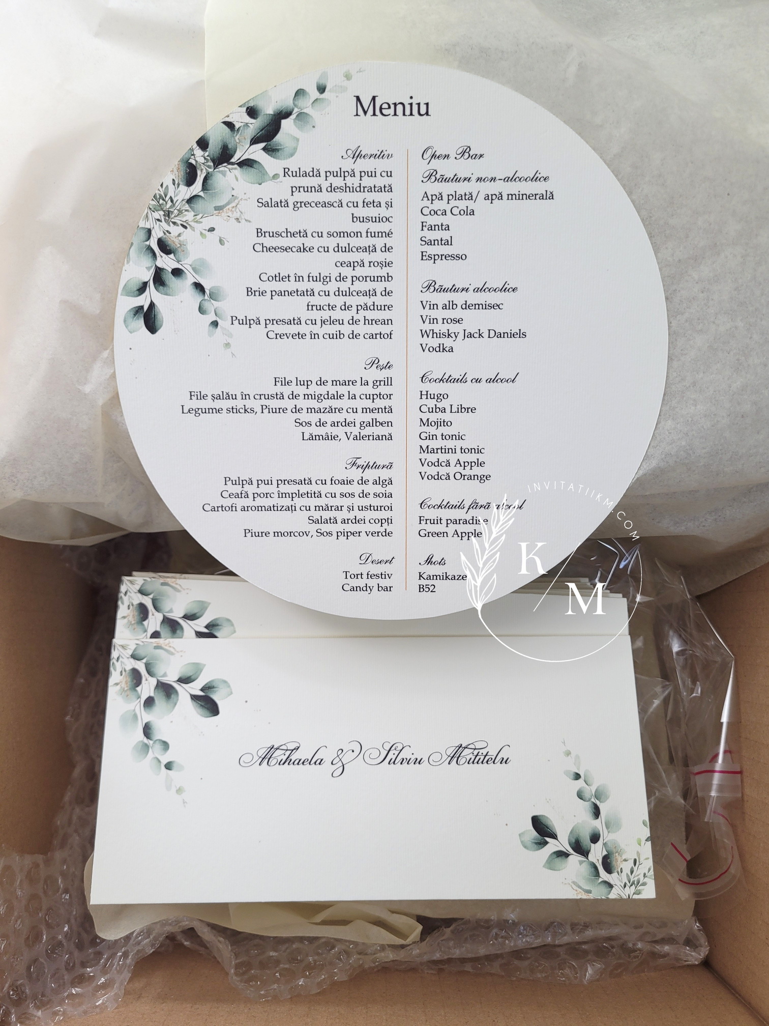 Meniuri de nunta si plicuri de bani/carduri de asezare cu tematica greenery/verde si putin auriu. Meniurile de nunta sunt realizate din carton gros si au diametrul 18-20 cm. Plicurile de bani sunt realizate din carton gros si au buzunar interior lipit pentru dar.