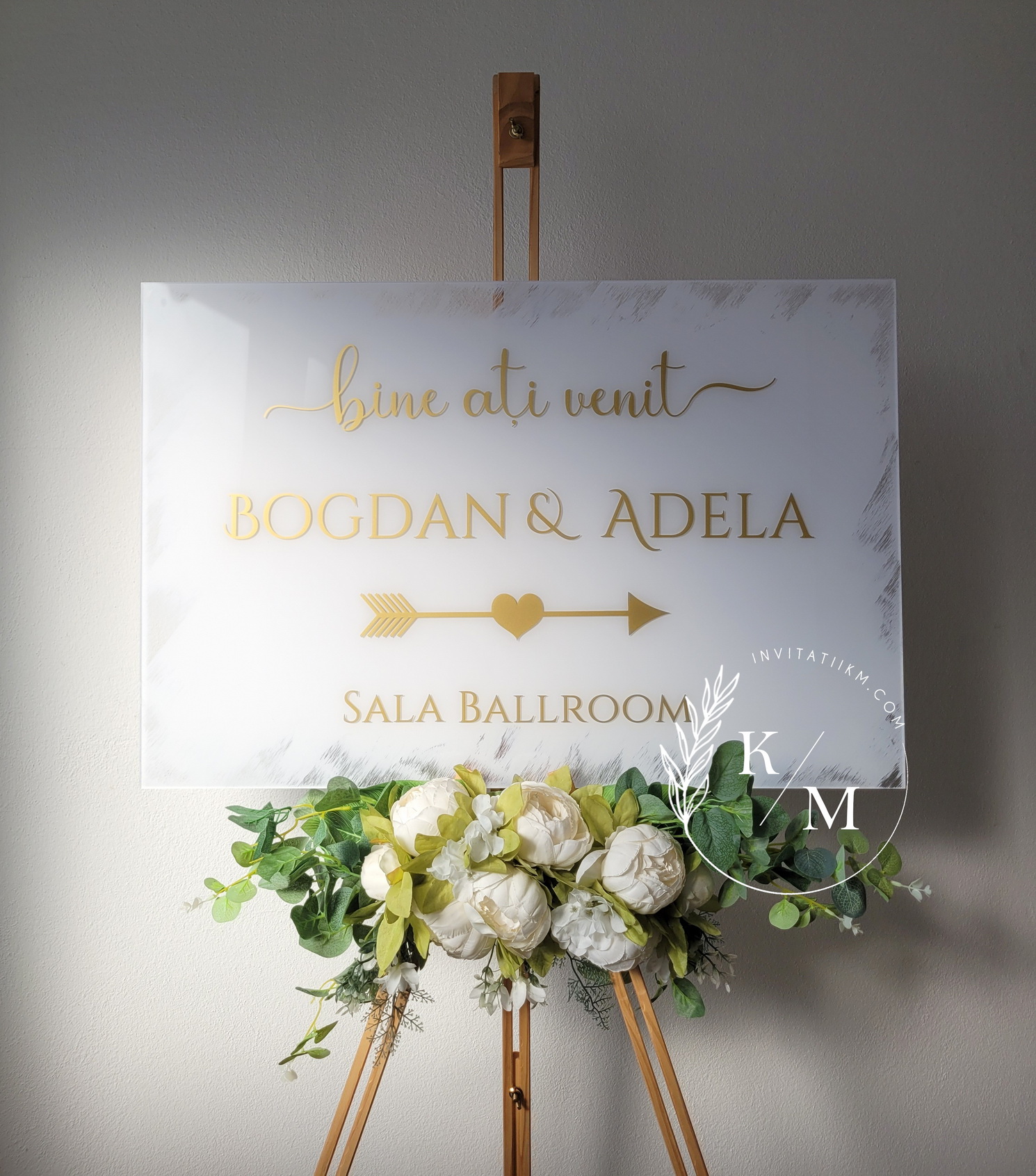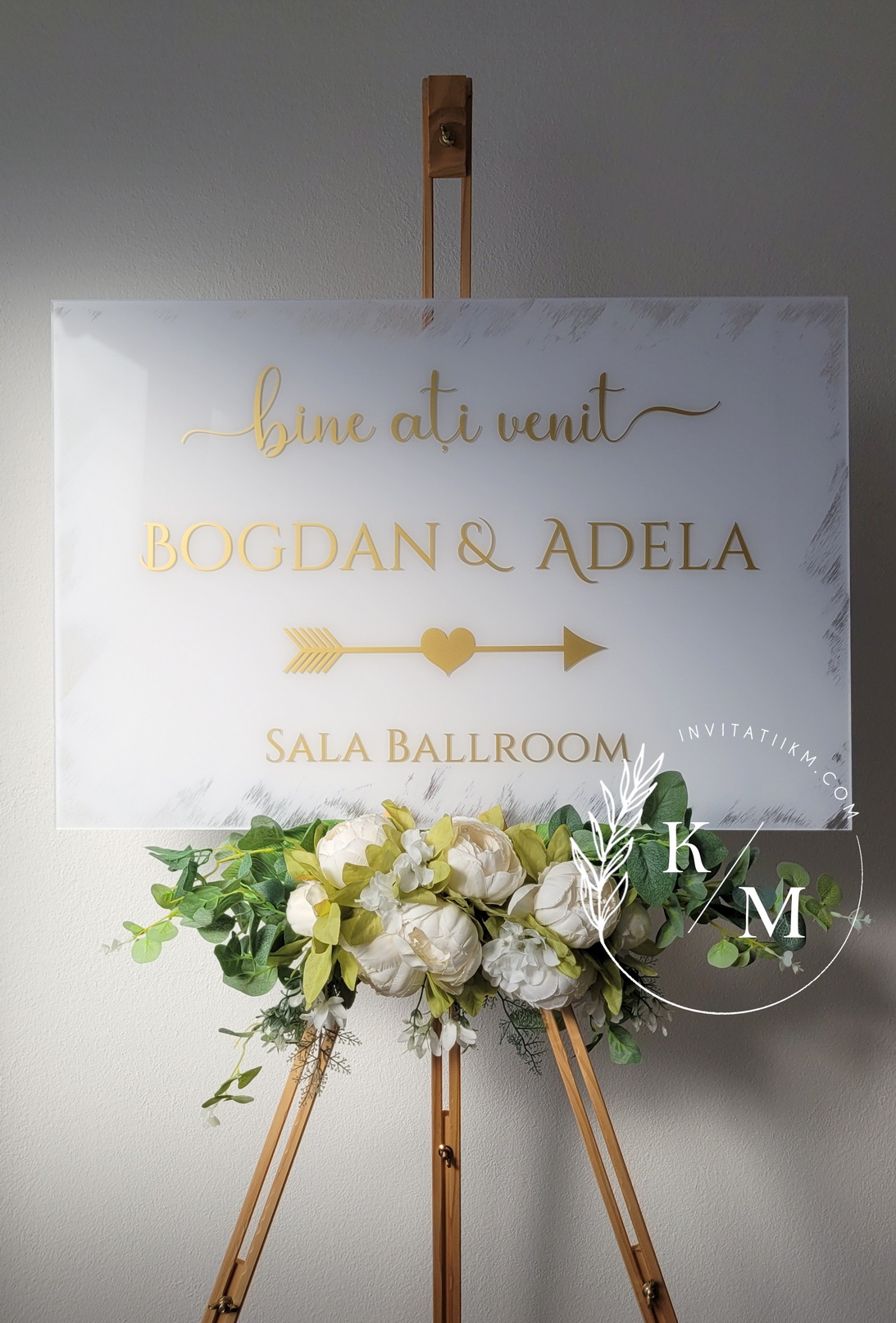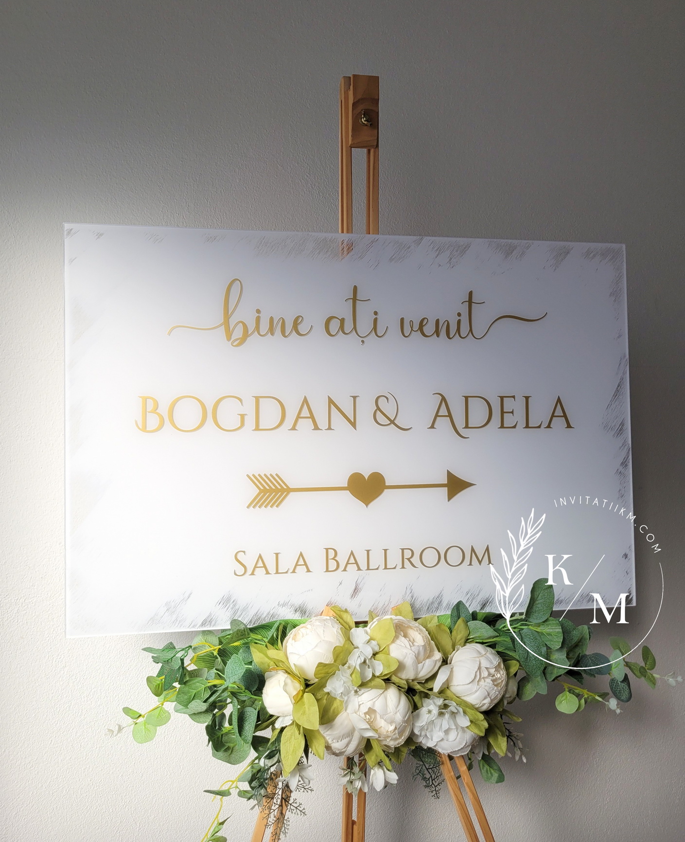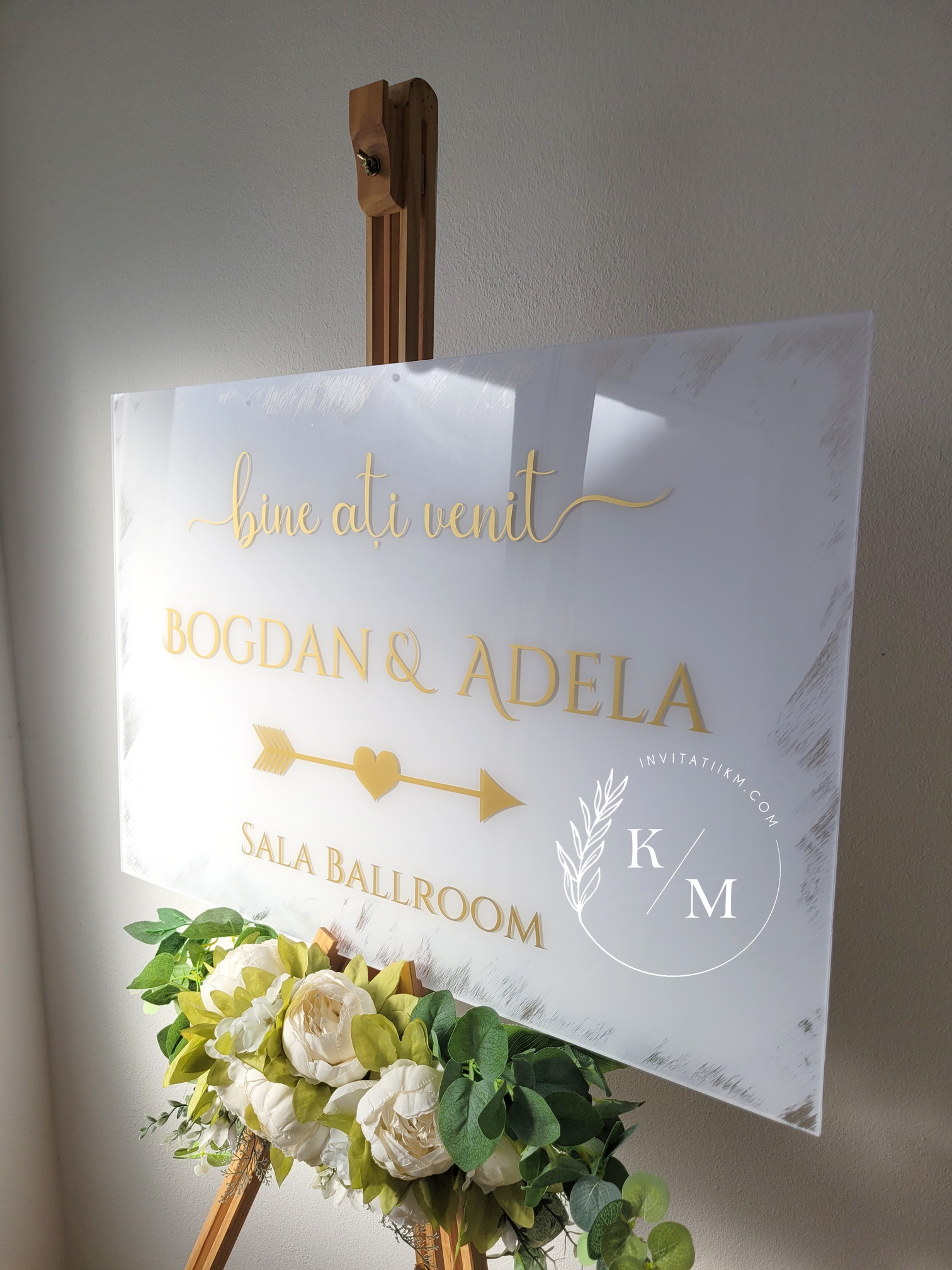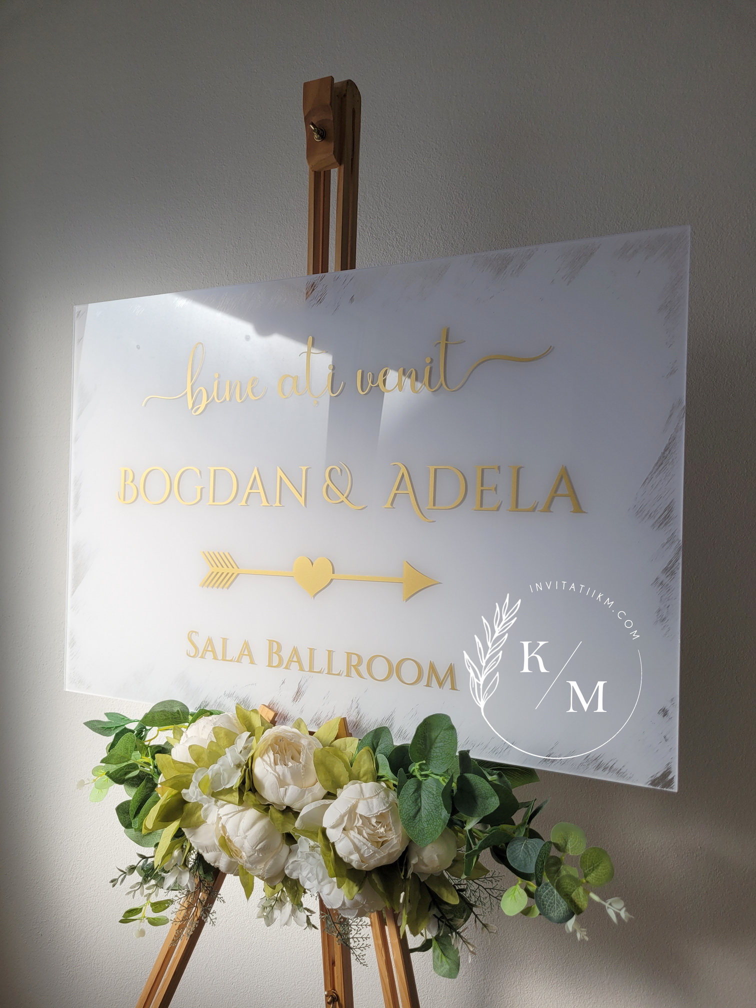 Panou de intampinare a invitatilor pentru nunta, realizat din plexiglas transparent, personalizat cu text din autocolant auriu si vopsit in diverse culori.