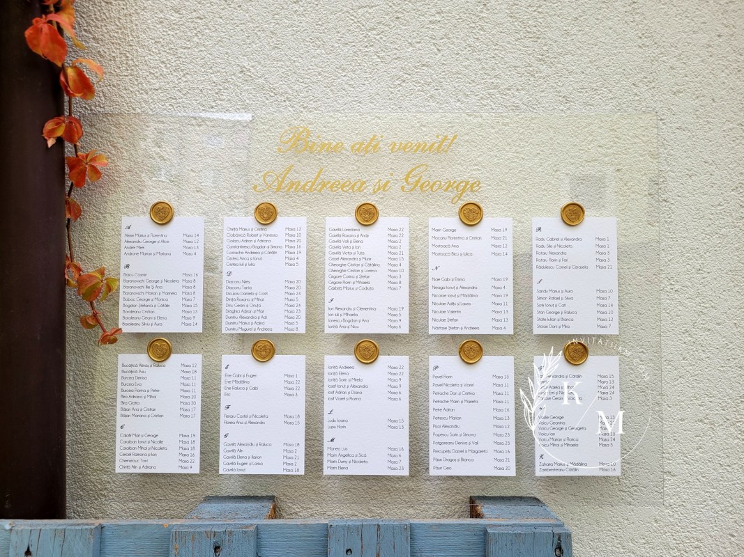 Panou de intampinare pentru nunta cu cartonase cu asezarea invitatilor la mese. Panoul este realizat din plexiglas transparent, are dimensiunea 50 x 70 cm, iar cartonasele sunt realizate din carton texturat + sigilii asortate. In functie de numarul cartonaselor, acestea pot fi mai mari/mai micute. Se pot achizitiona impreuna sau separat.