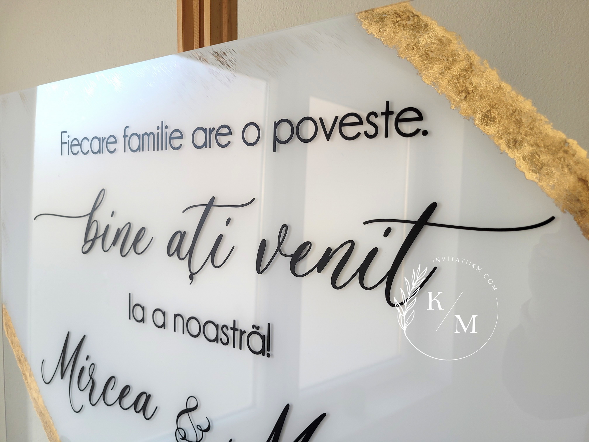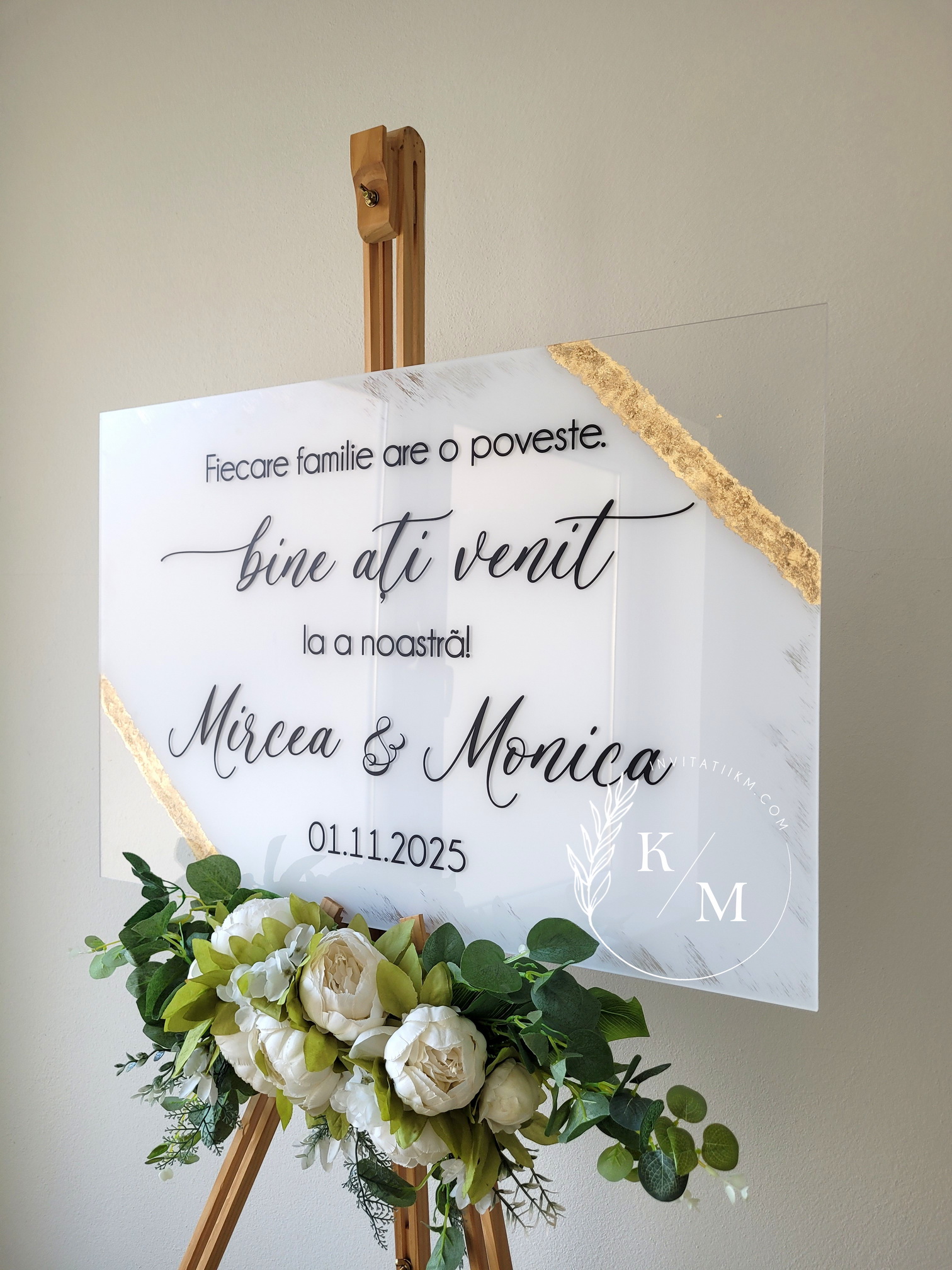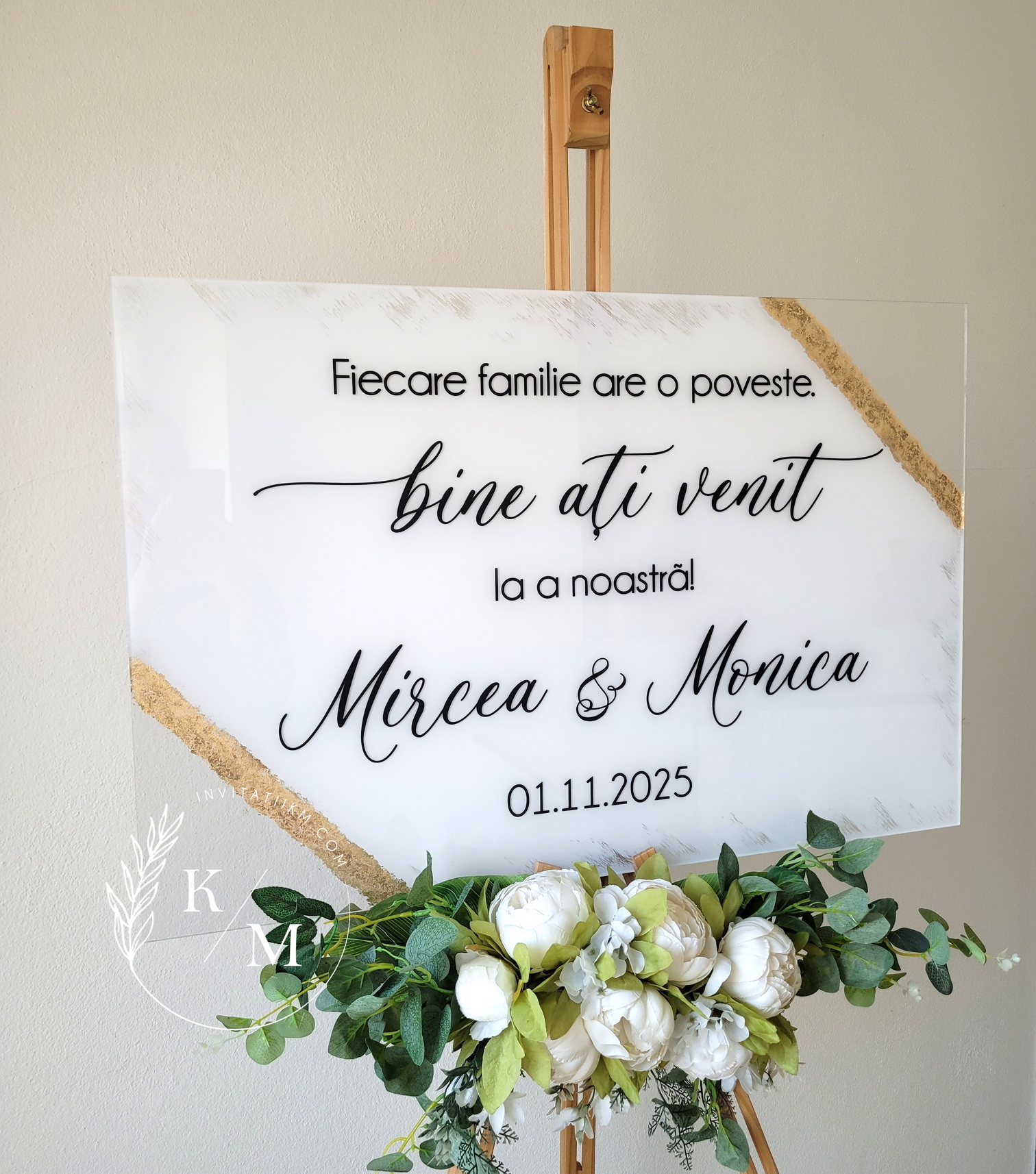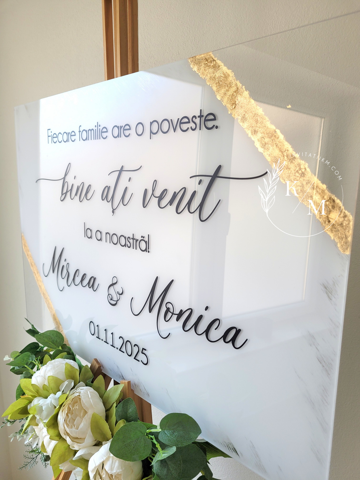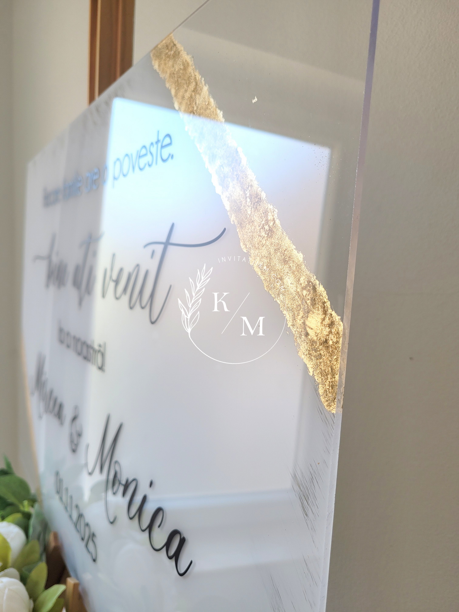 Panou de intampinare pentru nunta. Panoul este realizat din plexiglas transparent vopsit pe verso, are 2 linii elegante realizate din foita aurie aplicata manual, textul poate fi alb/negru/auriu/argintiu si are dimensiunea aprox. 50 x 70 cm.
