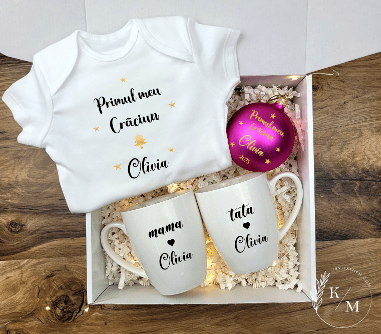Cutia conține produse utile și simbolice: un body moale din bumbac personalizat cu numele bebelușului, două căni pentru părinți, un glob delicat din sticlă și o cutie decorată manual, completată cu fundiță și umplutură decorativă. Globurile și cănile sunt ambalate și în folie cu bule, pentru extra protecție.