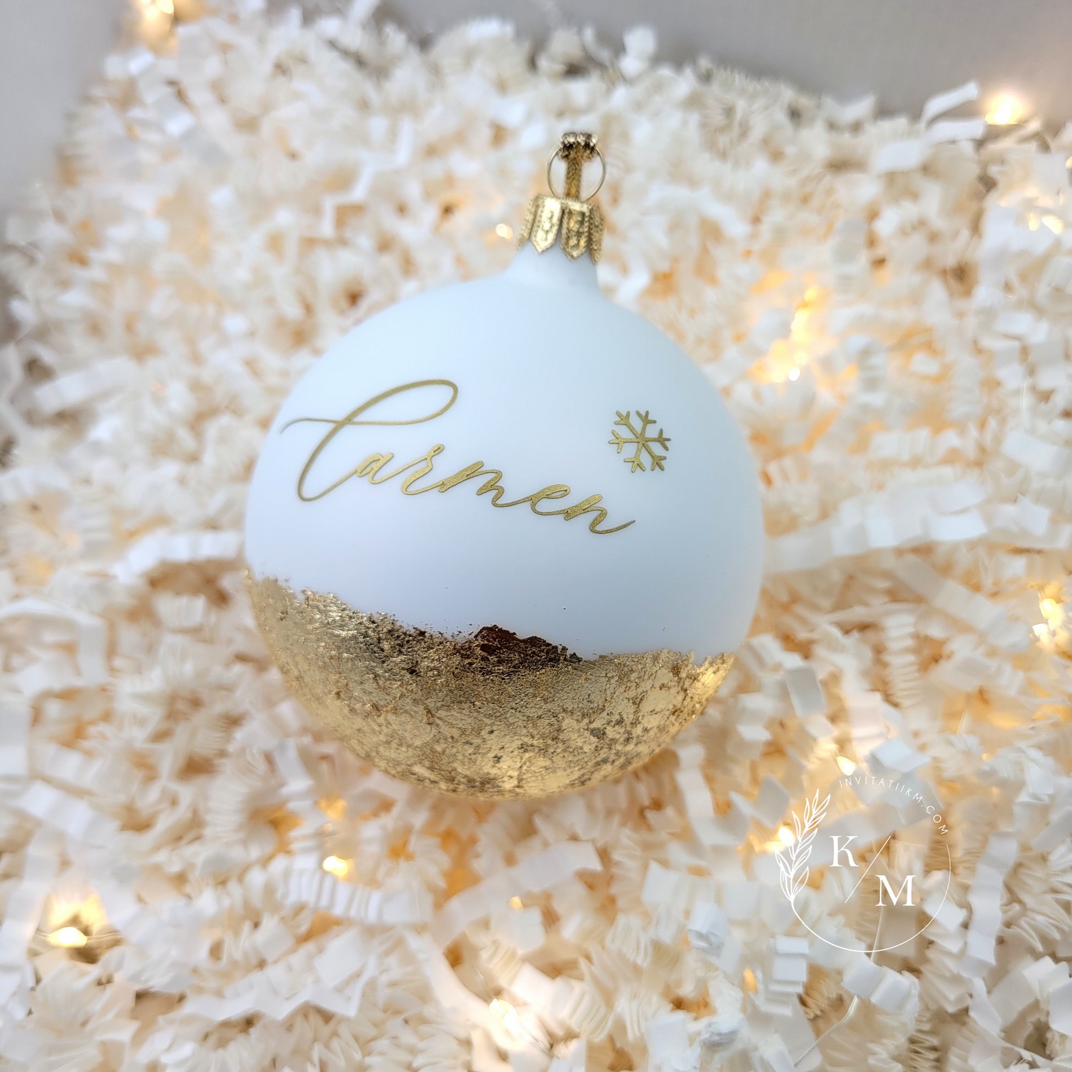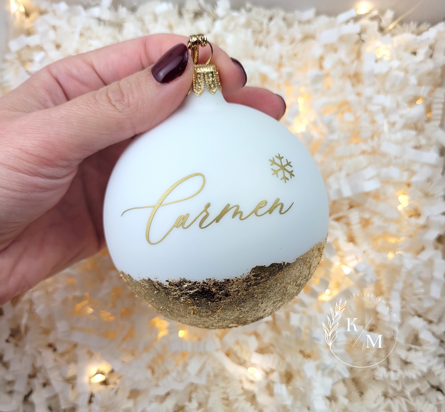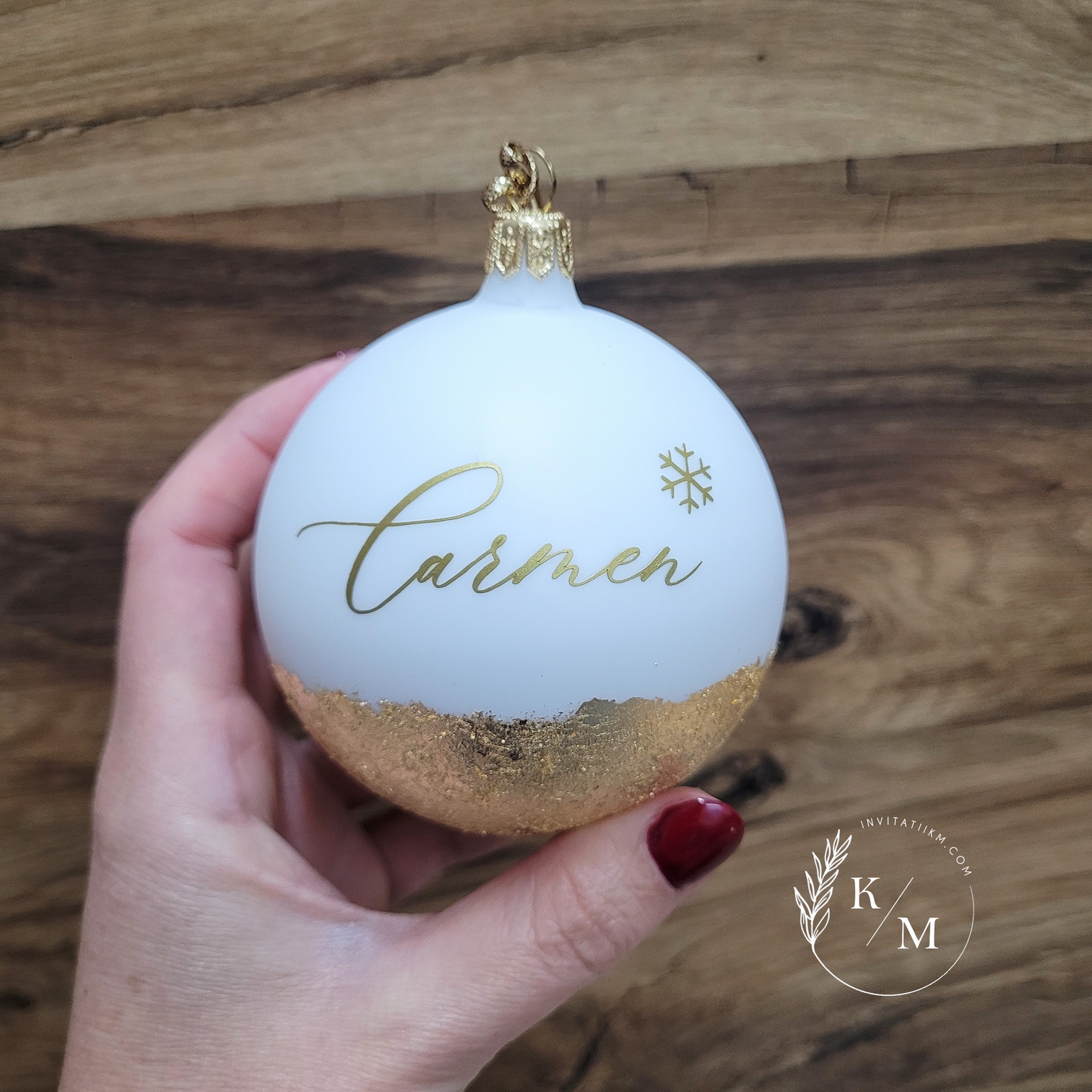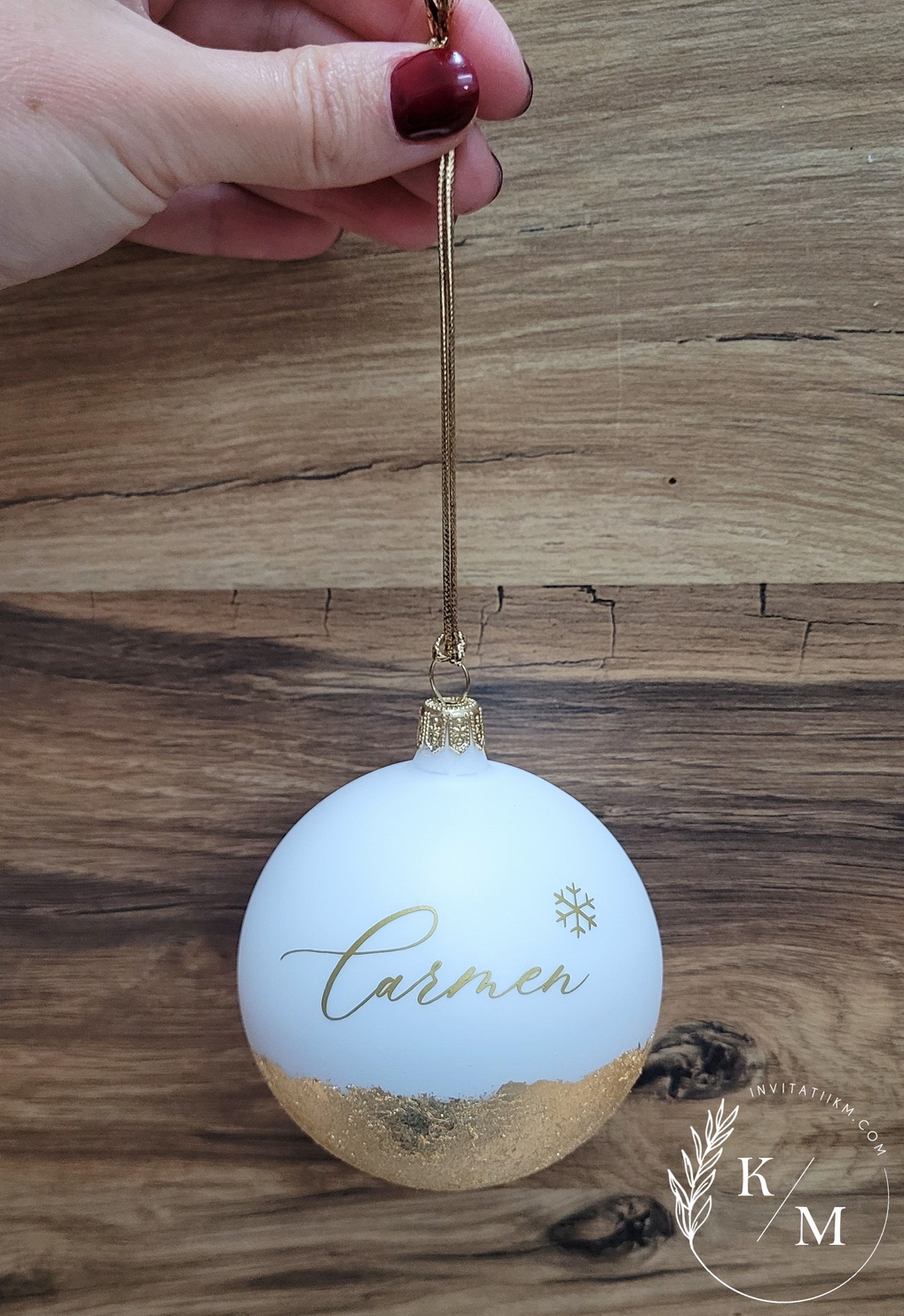 Acest glob personalizat este realizat manual din sticlă colorată și decorat cu foiță aurie aplicată cu migală, pentru un efect rafinat, unic la fiecare piesă. Textul personalizat, realizat cu autocolant premium, completează perfect aspectul elegant, transformând fiecare glob într-o mică operă de artă.