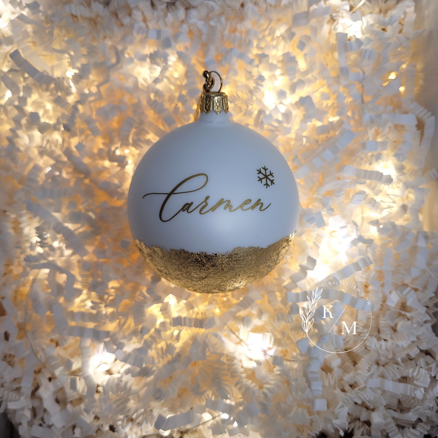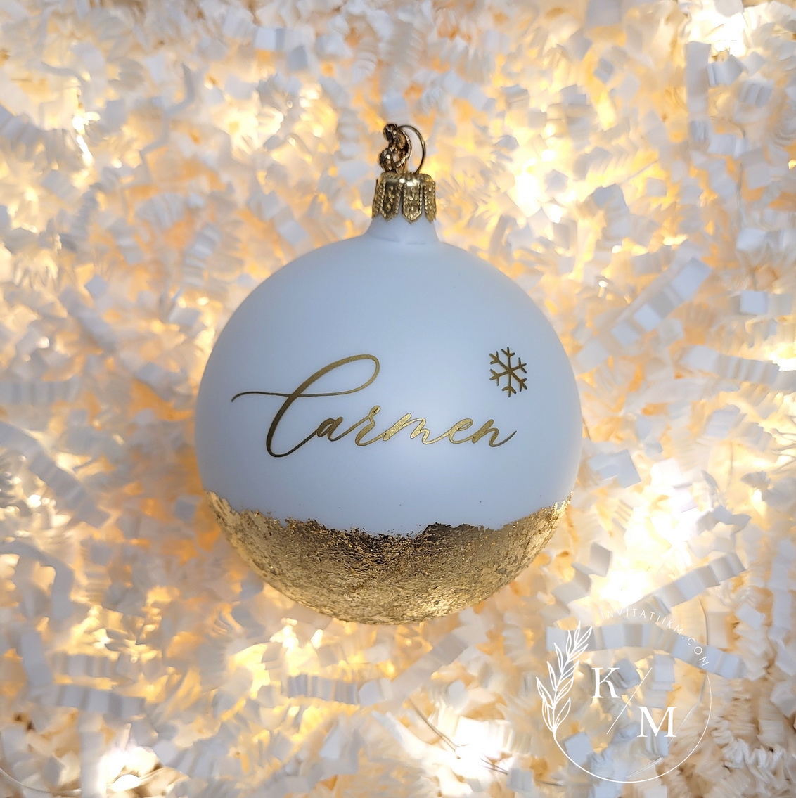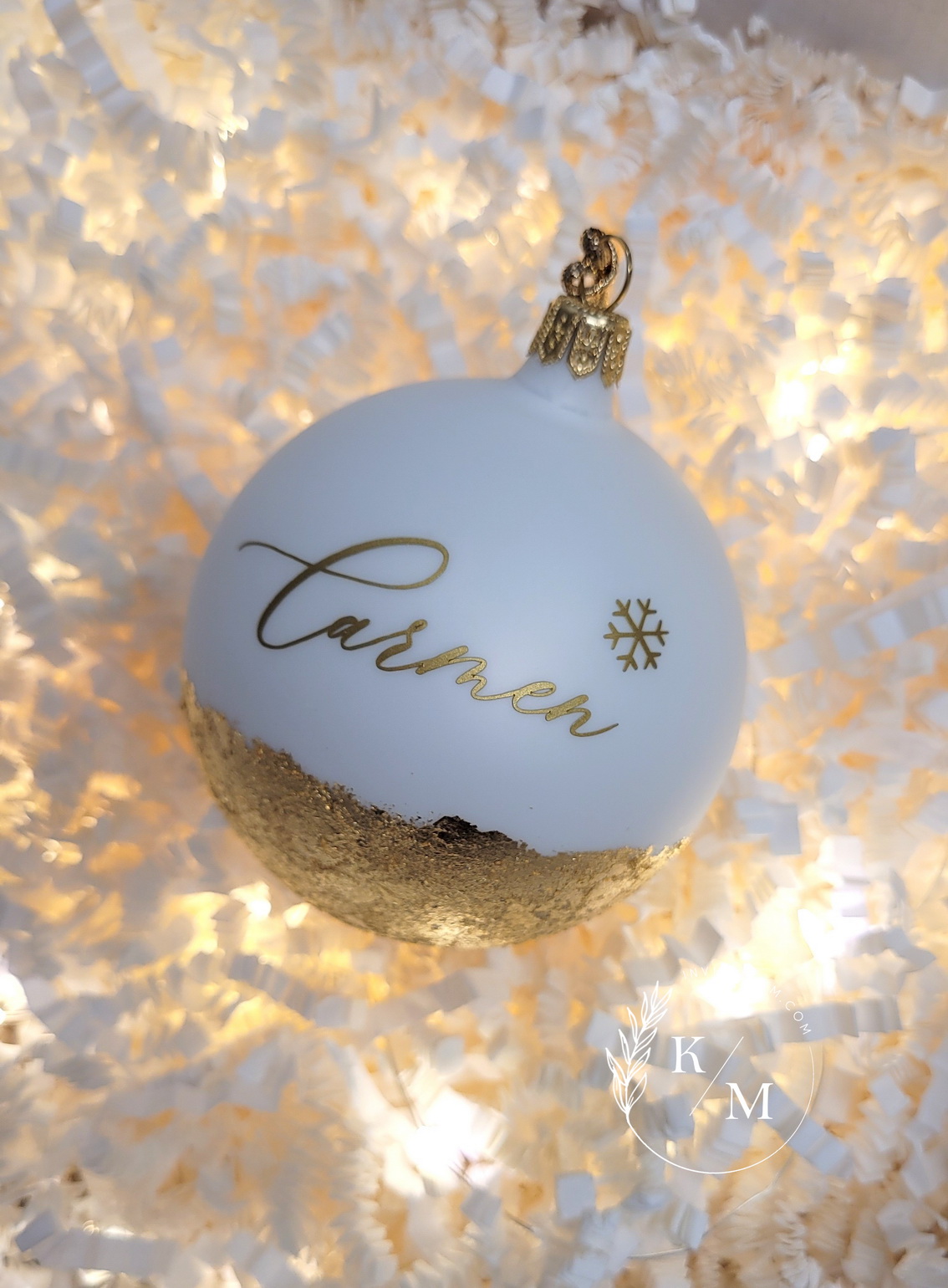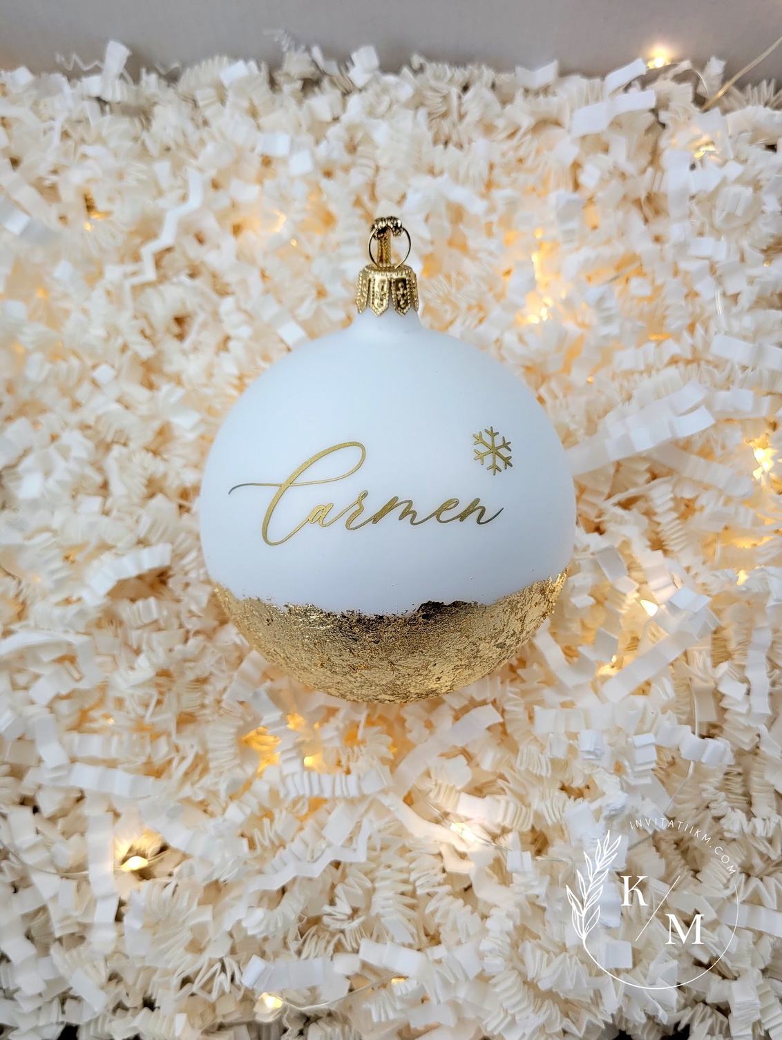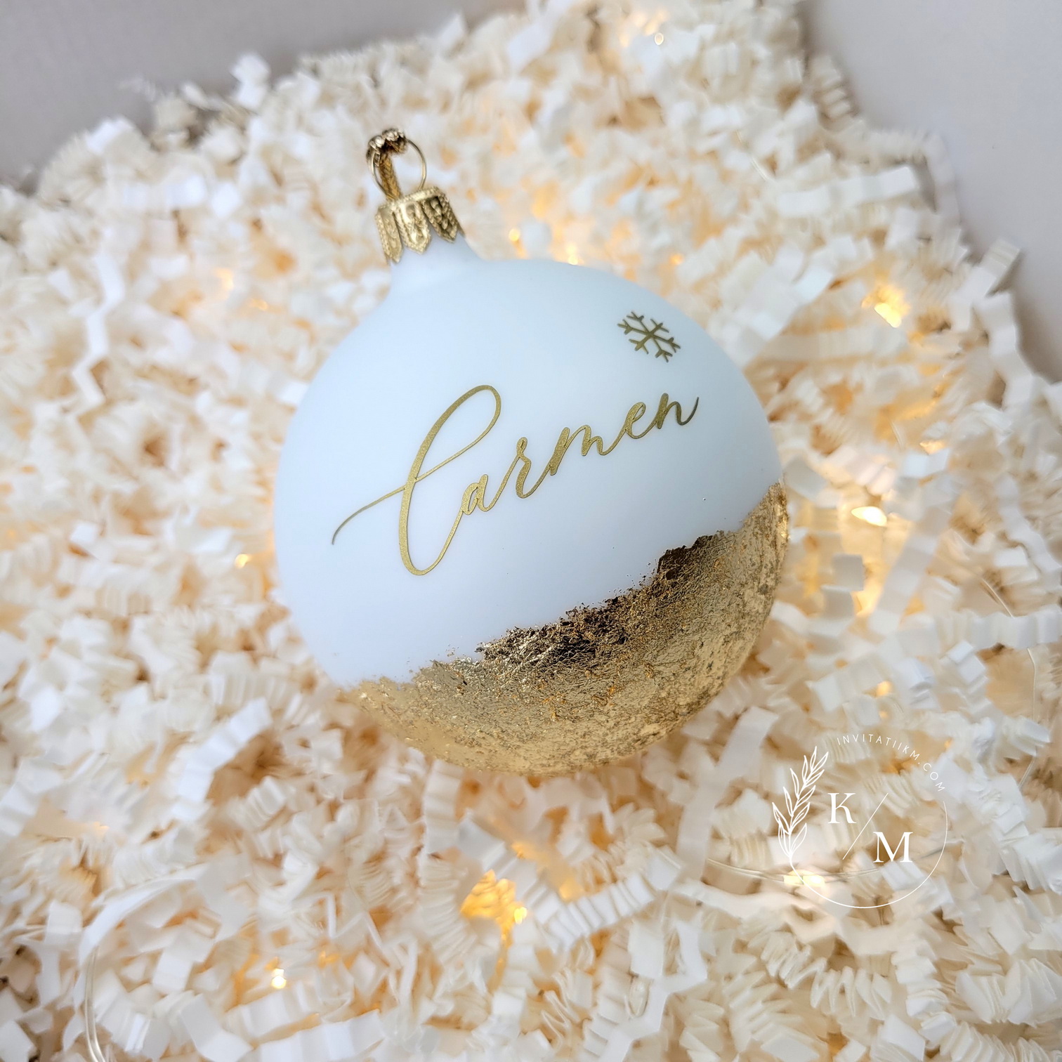 Acest glob personalizat este realizat manual din sticlă colorată și decorat cu foiță aurie aplicată cu migală, pentru un efect rafinat, unic la fiecare piesă. Textul personalizat, realizat cu autocolant premium, completează perfect aspectul elegant, transformând fiecare glob într-o mică operă de artă.