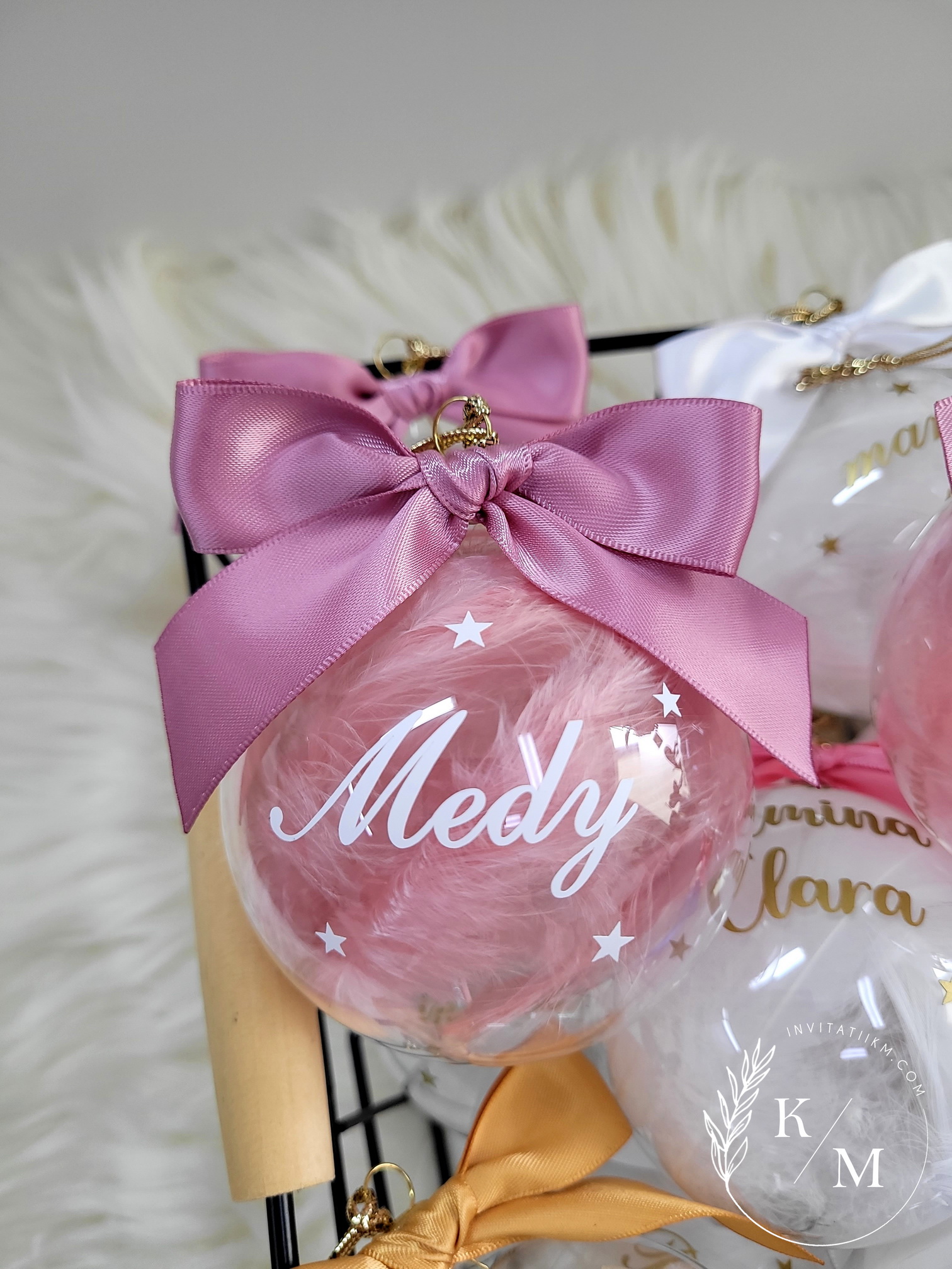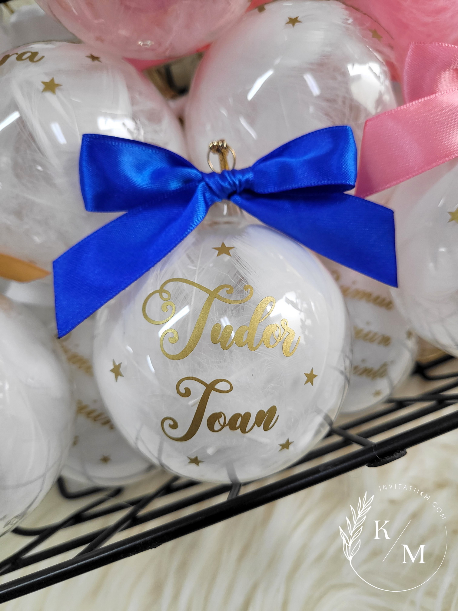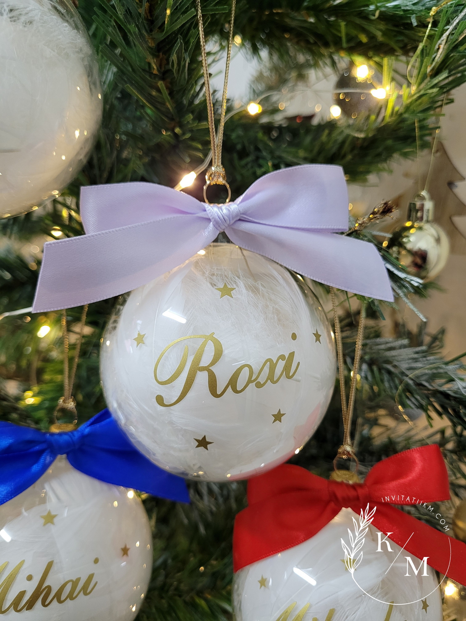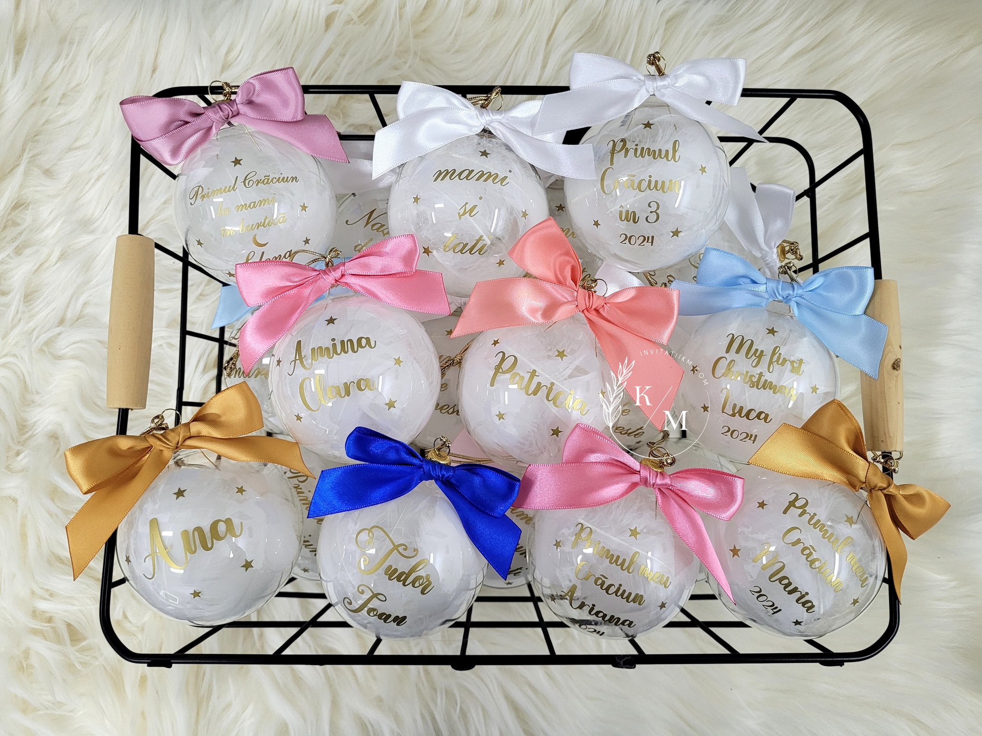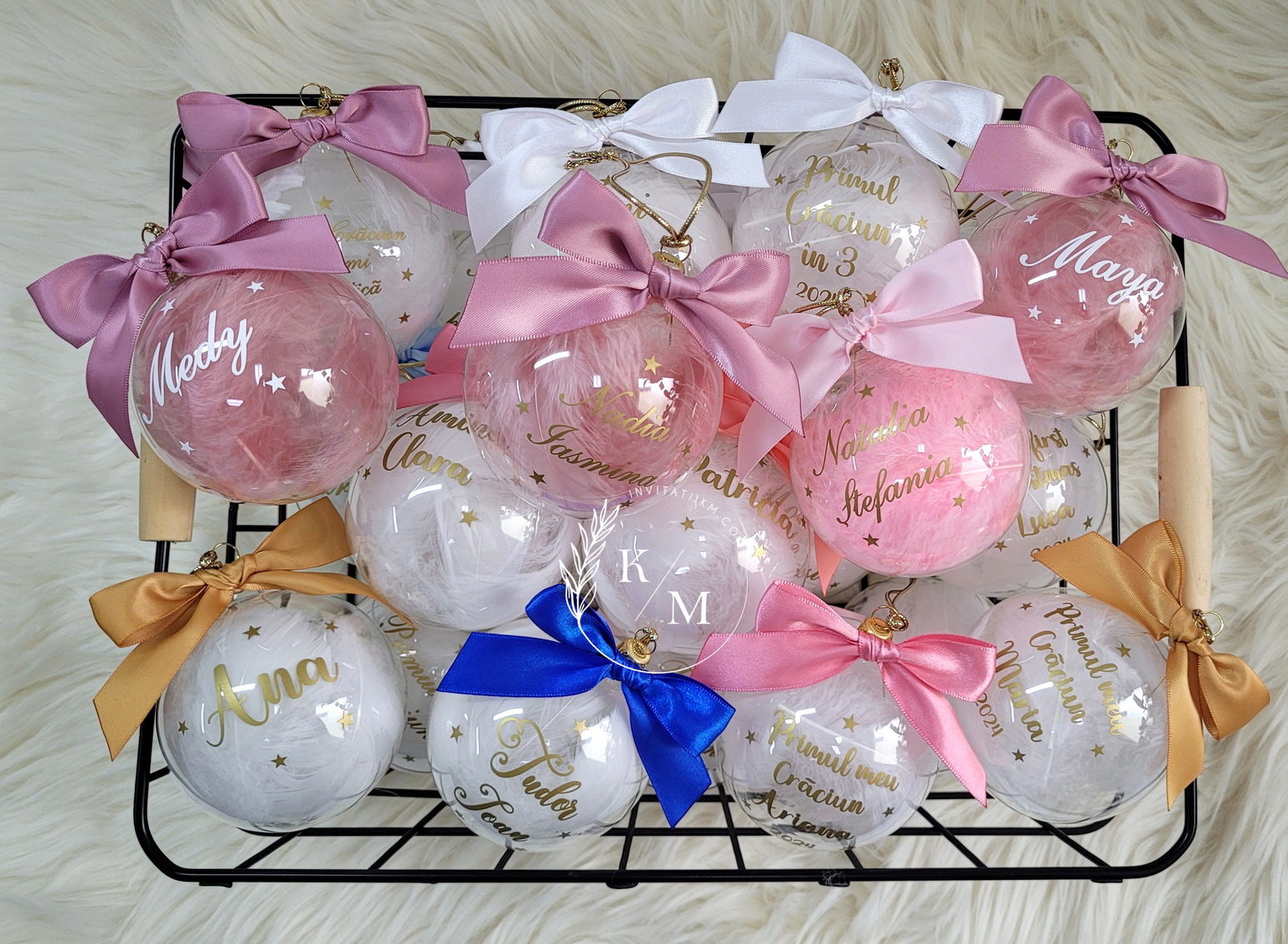 Fiecare glob este personalizat cu numele, inițialele sau mesajul dorit și ambalat individual cu atenție într-o cutie elegantă, gata de oferit cadou celor dragi. Globurile se pot accesoriza (gratuit) cu fundiță satinată din material de calitate, care nu se deșiră.