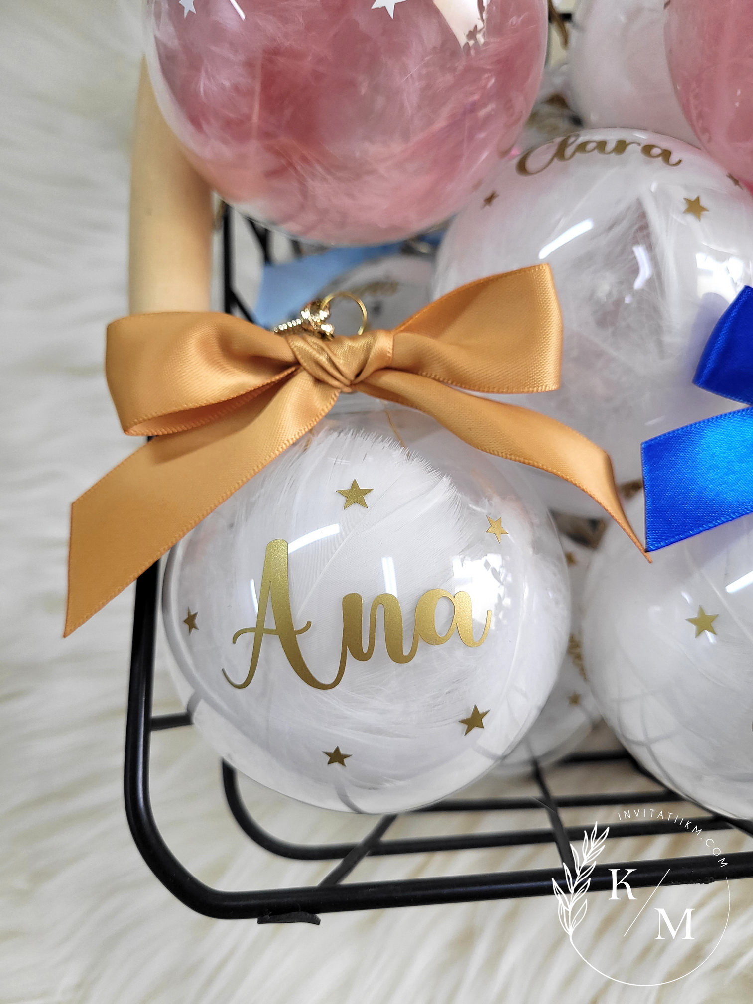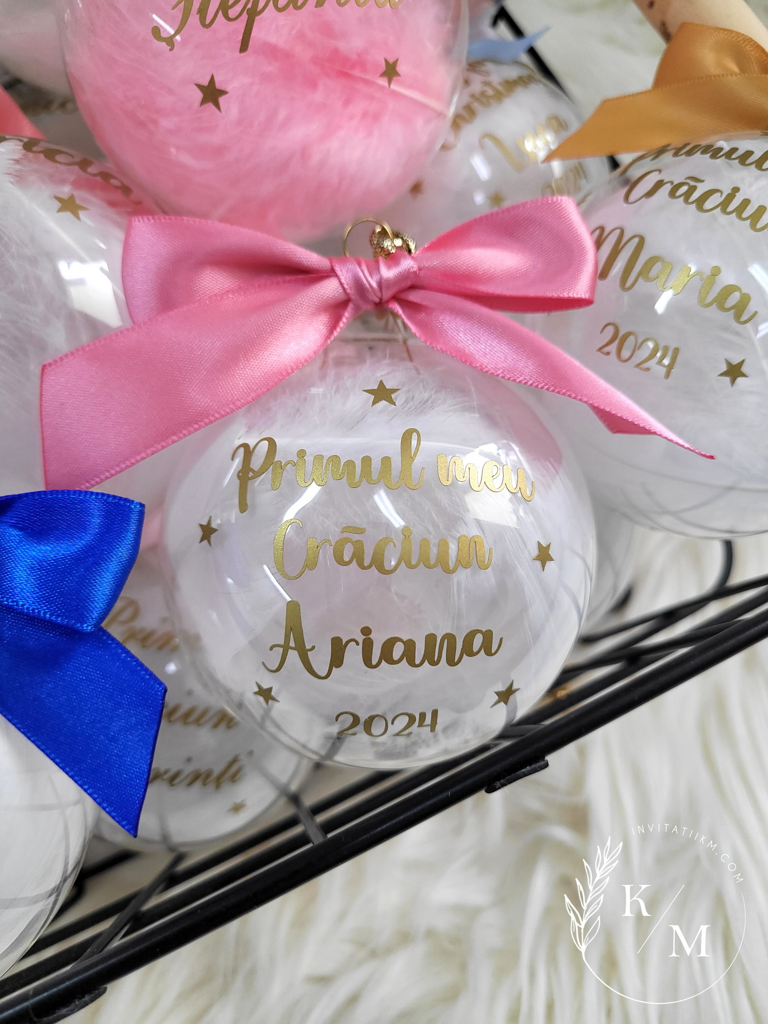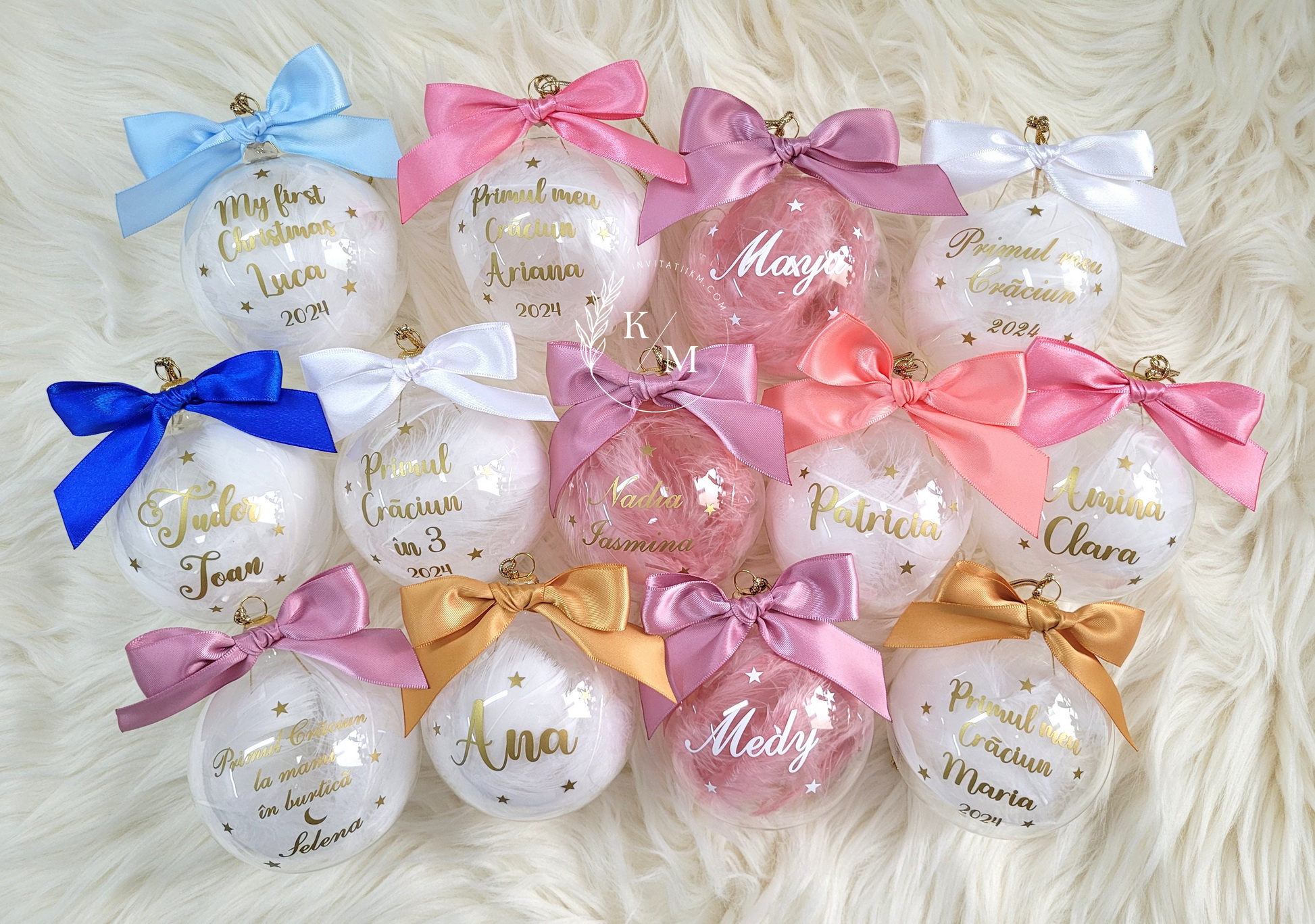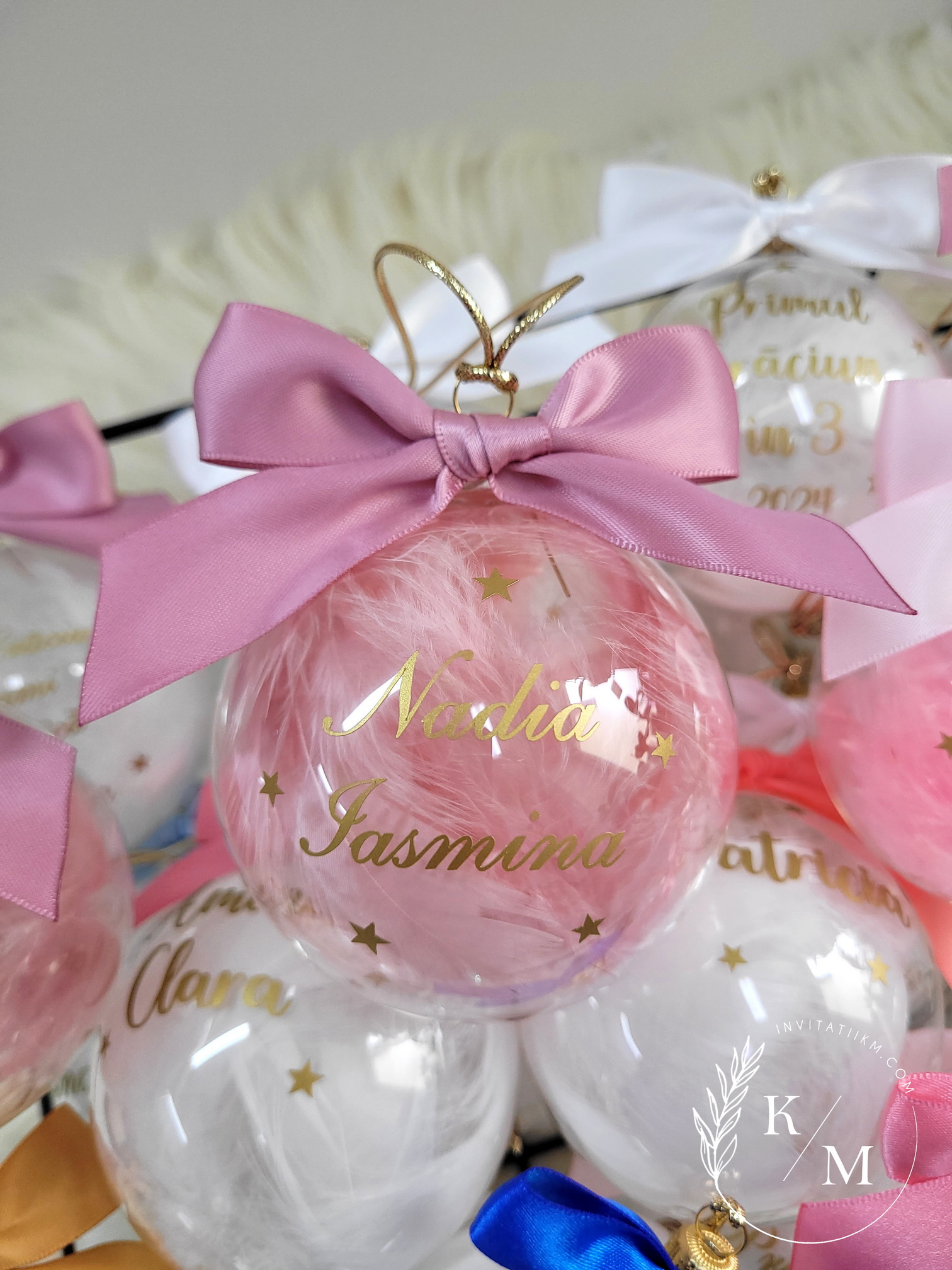 Fiecare glob este personalizat cu numele, inițialele sau mesajul dorit și ambalat individual cu atenție într-o cutie elegantă, gata de oferit cadou celor dragi. Globurile se pot accesoriza (gratuit) cu fundiță satinată din material de calitate, care nu se deșiră.