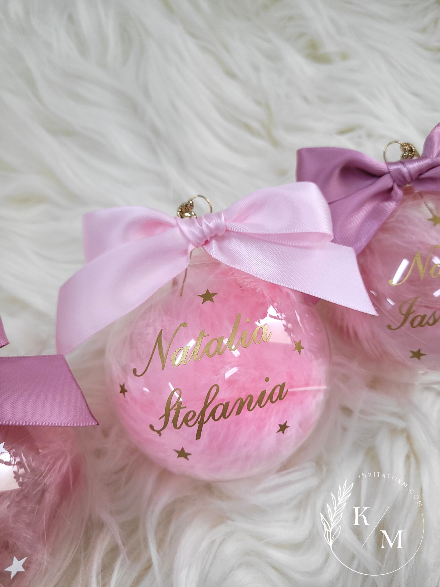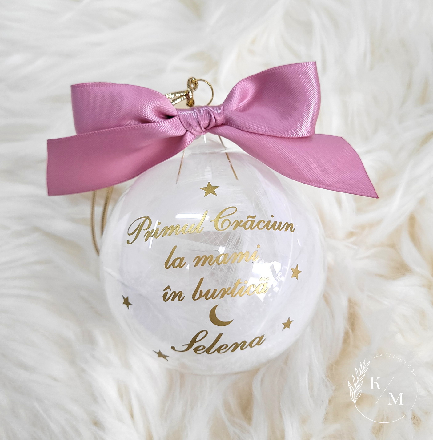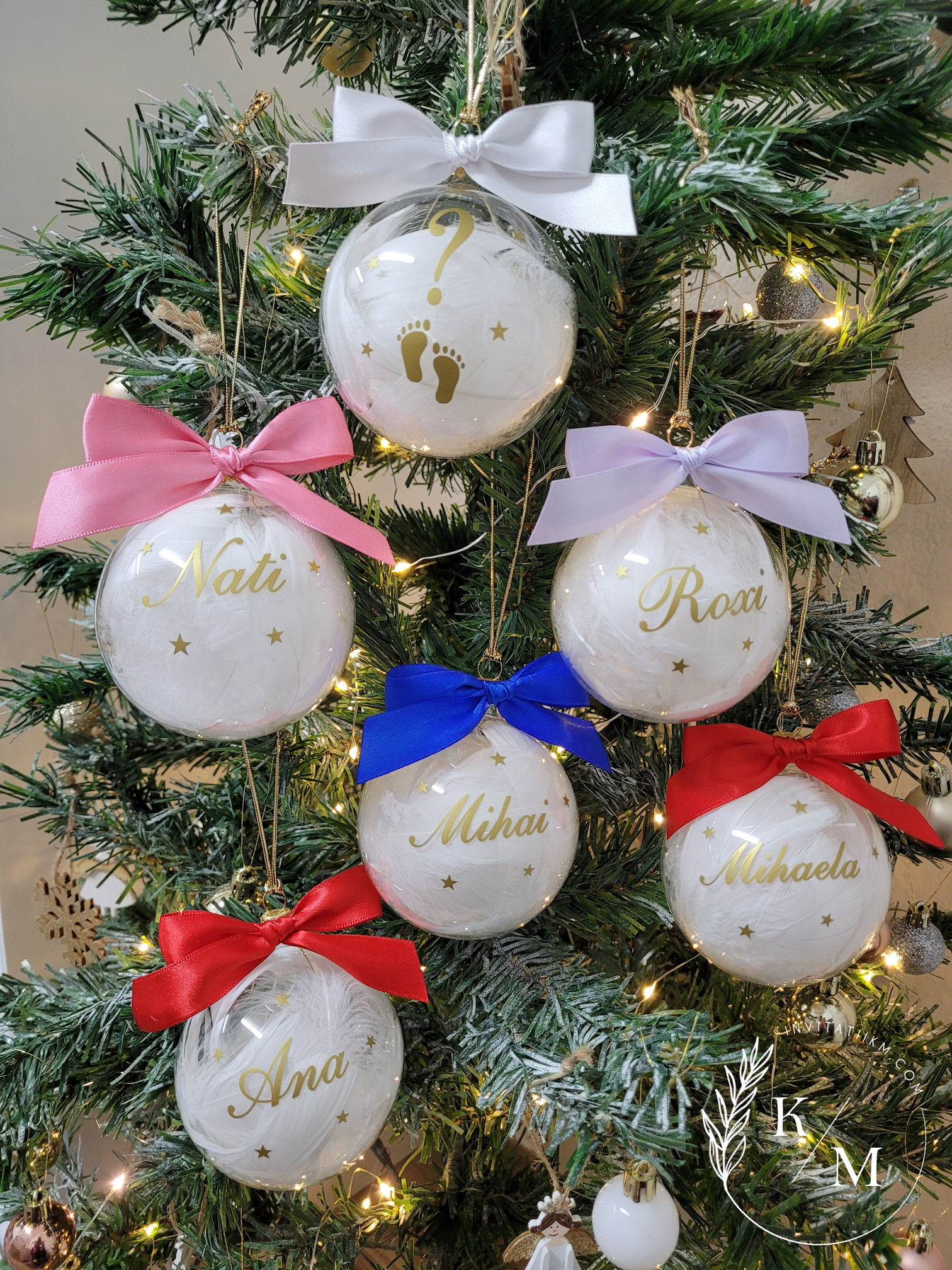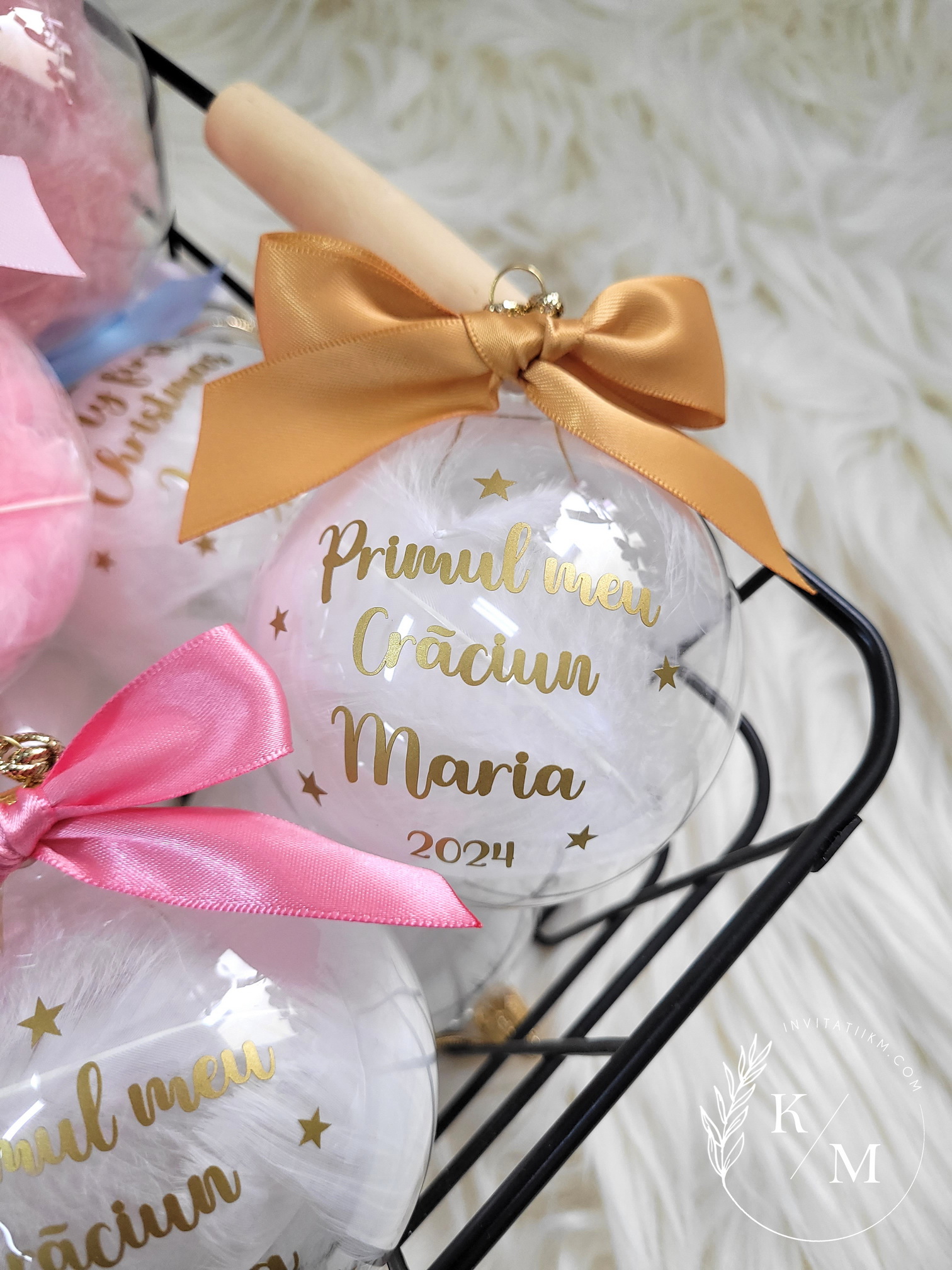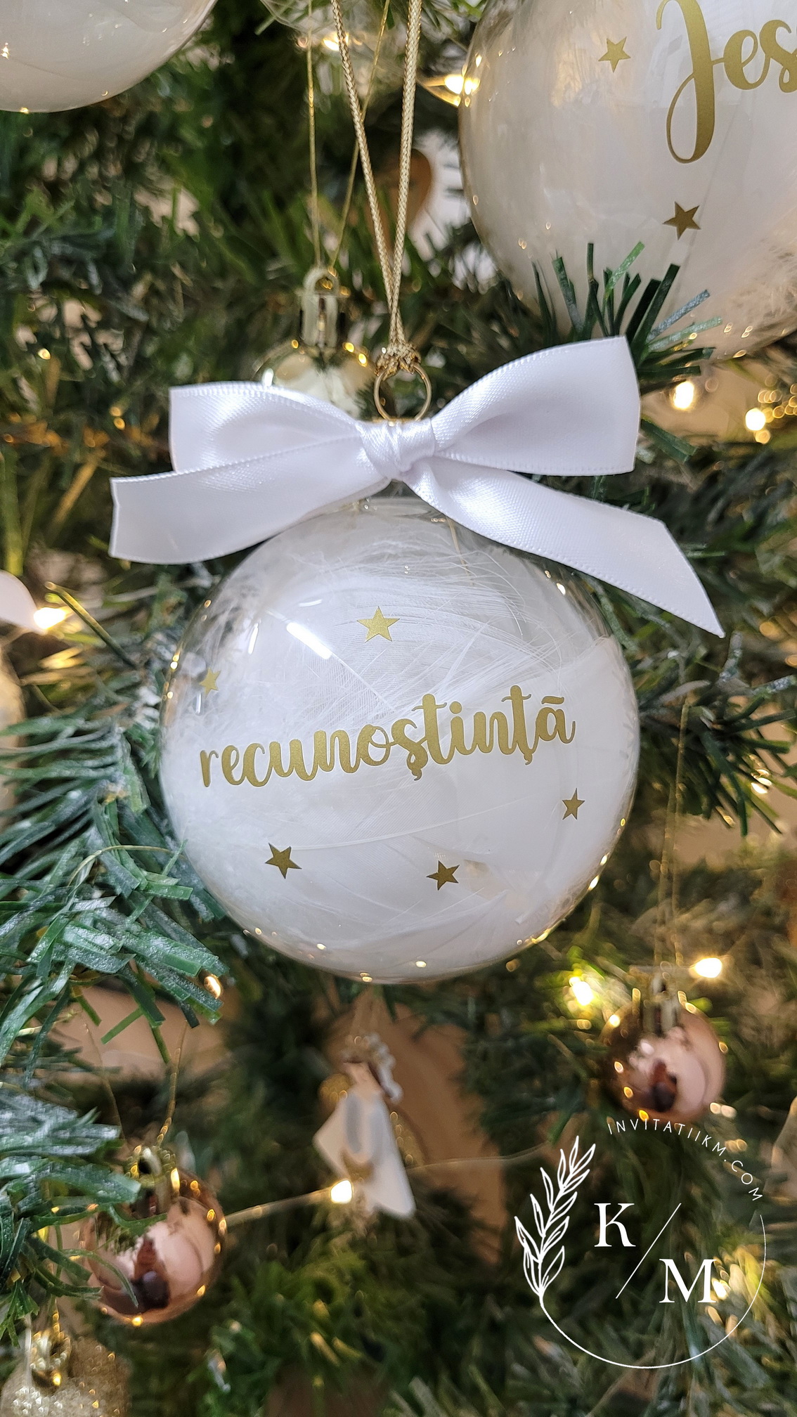 Fiecare glob este personalizat cu numele, inițialele sau mesajul dorit și ambalat individual cu atenție într-o cutie elegantă, gata de oferit cadou celor dragi. Globurile se pot accesoriza (gratuit) cu fundiță satinată din material de calitate, care nu se deșiră.