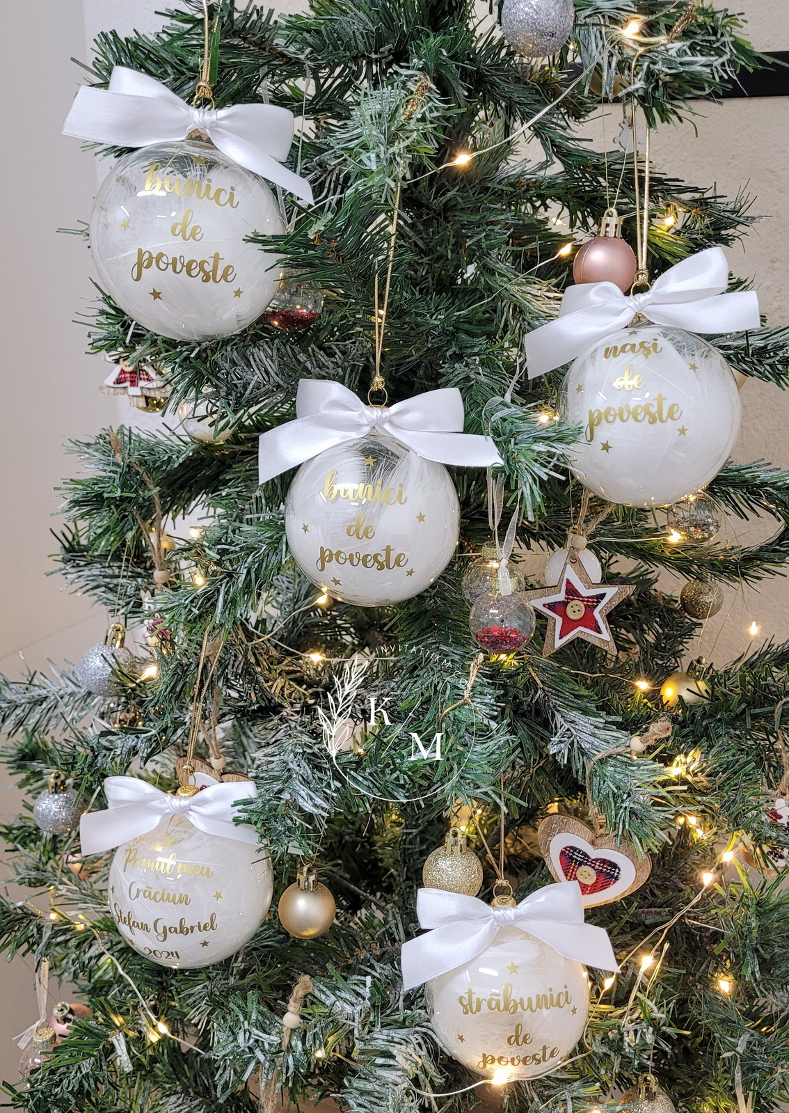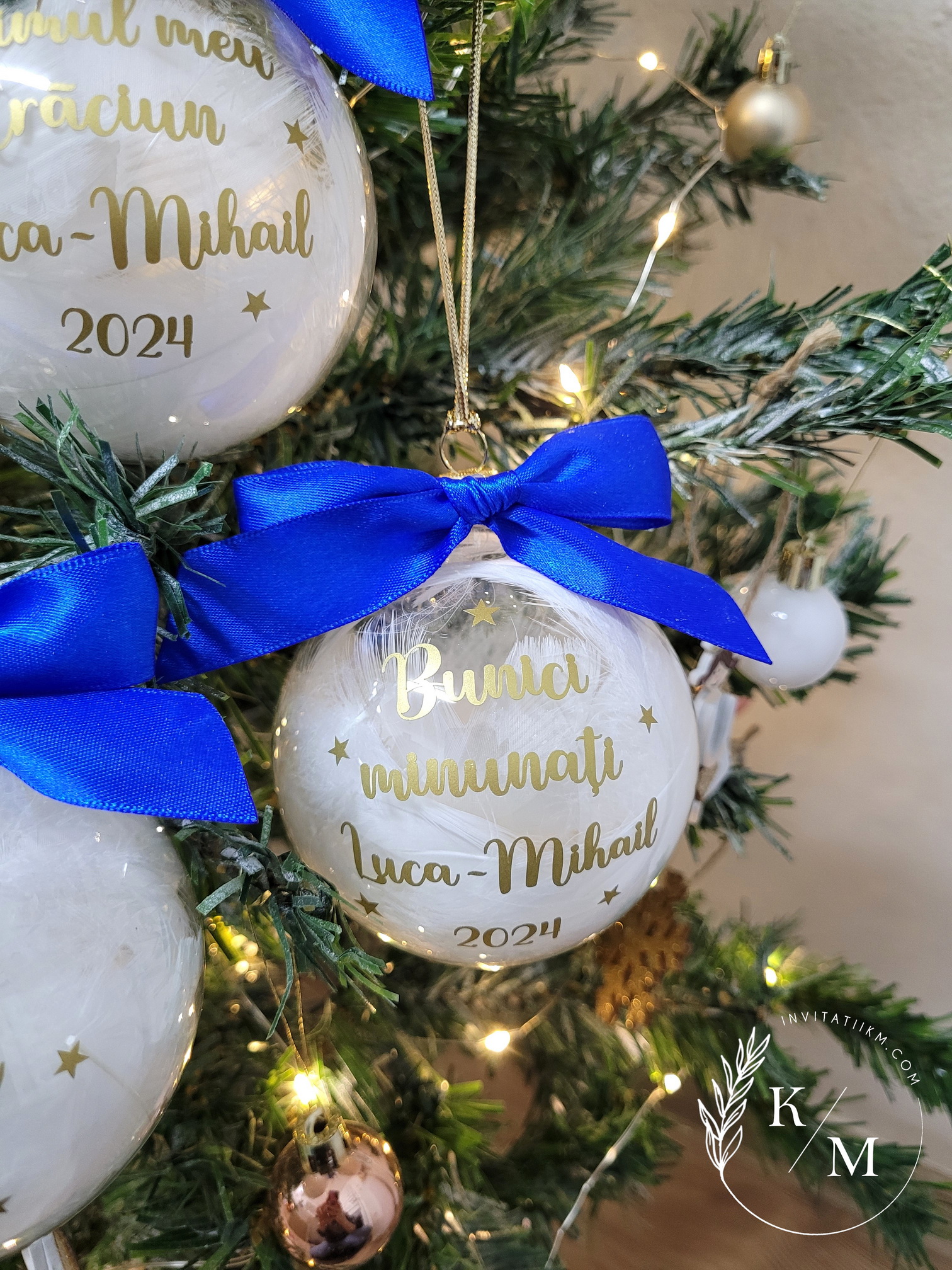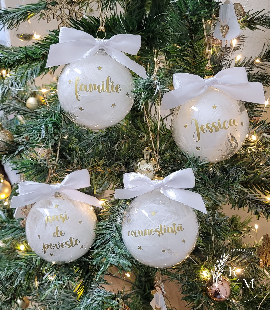 Transformă bradul tău într-o poveste de iarnă cu seturile noastre de globuri de Crăciun personalizate, umplute cu puf alb sau colorat, realizate manual din sticlă (la noi în România) și decorate cu grijă în atelierul nostru. Fiecare glob este unic – scrisul fin, detaliile delicate și finisajul elegant aduc o notă de rafinament autentic în decorul tău de sărbătoare.