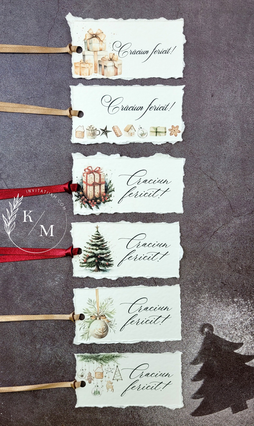 Etichetele sunt accesorizate cu panglică satinată, gata de prins pe cadouri, pungi, cutii sau decorațiuni. Fiecare model este creat pentru a aduce un plus de farmec darurilor tale de sărbători.