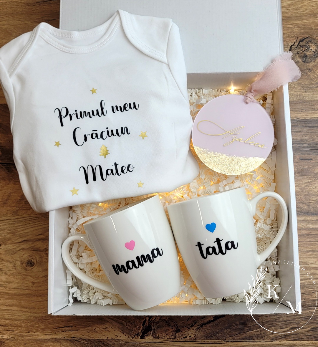 Cutia conține produse utile și simbolice: un body moale din bumbac personalizat cu numele bebelușului, două căni pentru părinți, un glob elegant din plexiglas și o cutie decorată manual, completată cu fundiță și umplutură decorativă. Globurile și cănile sunt ambalate și în folie cu bule, pentru extra protecție.
