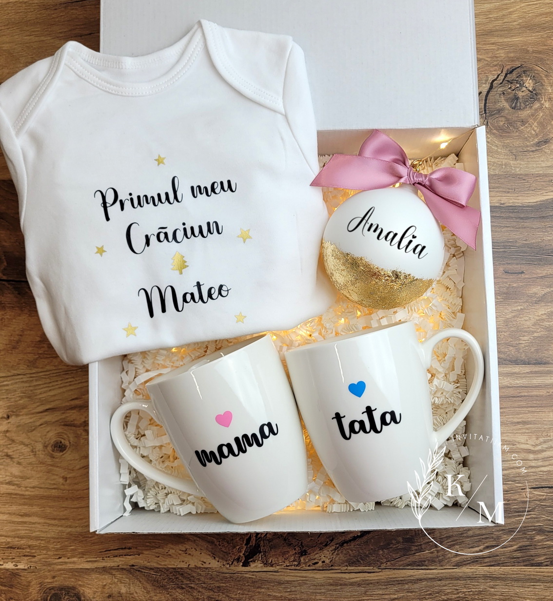 Cutia conține produse utile și simbolice: un body moale din bumbac personalizat cu numele bebelușului, două căni pentru părinți, un glob delicat din sticlă și o cutie decorată manual, completată cu fundiță și umplutură decorativă. Globurile și cănile sunt ambalate și în folie cu bule, pentru extra protecție.