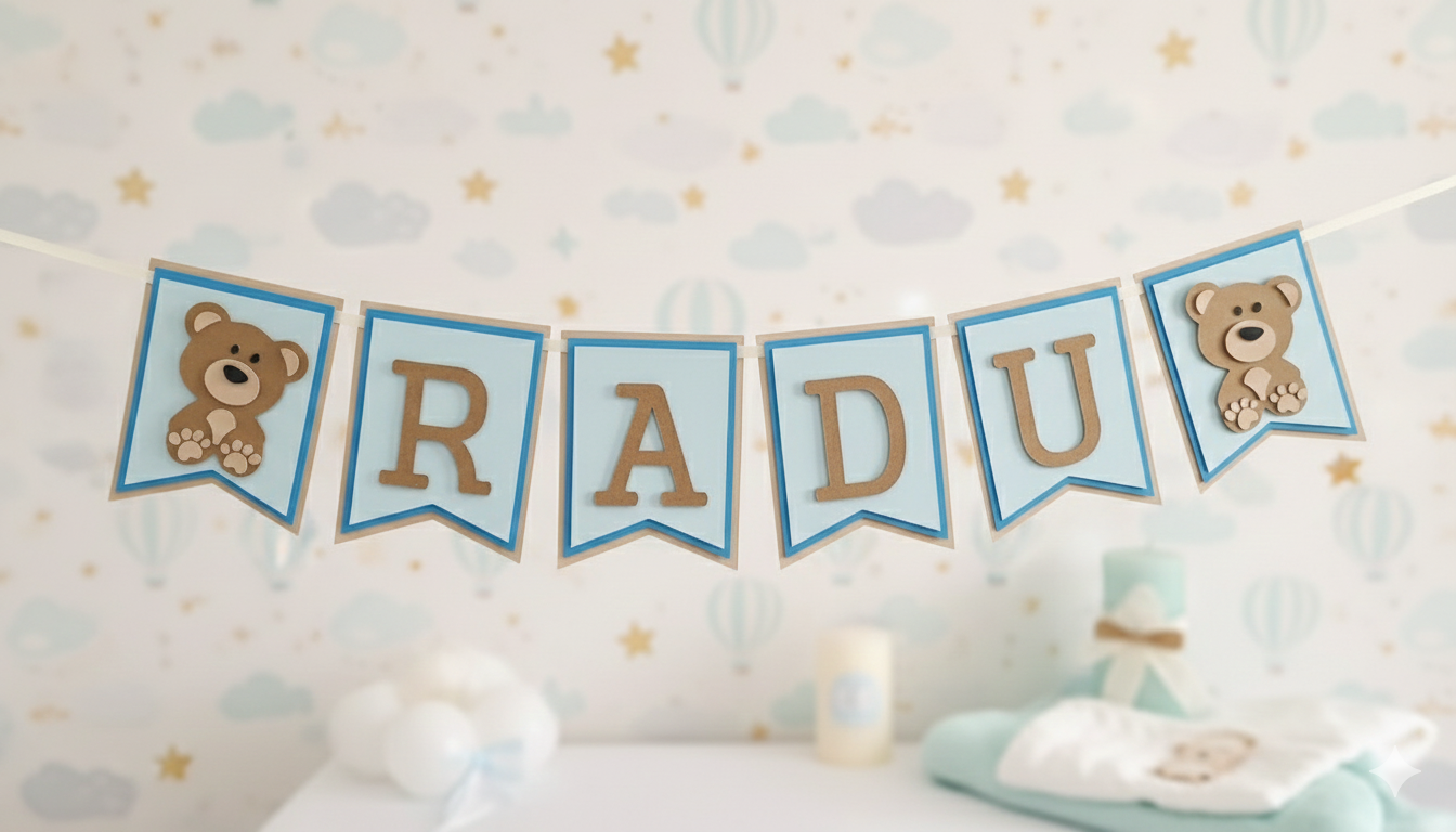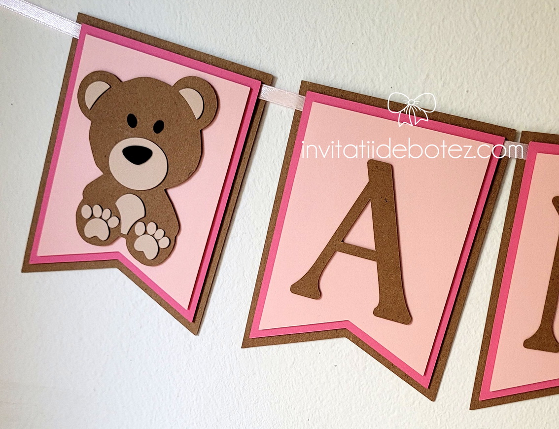 Litere pentru ghirlanda cu ursulet decupat si inimioara realizate din mai multe cartonase colorate suprapuse. Pot fi folosite la decorarea camerei copilului sau la botez, pentru coltul cu dulciuri/candy bar. Culorile se pot schimba, la fel si formele.