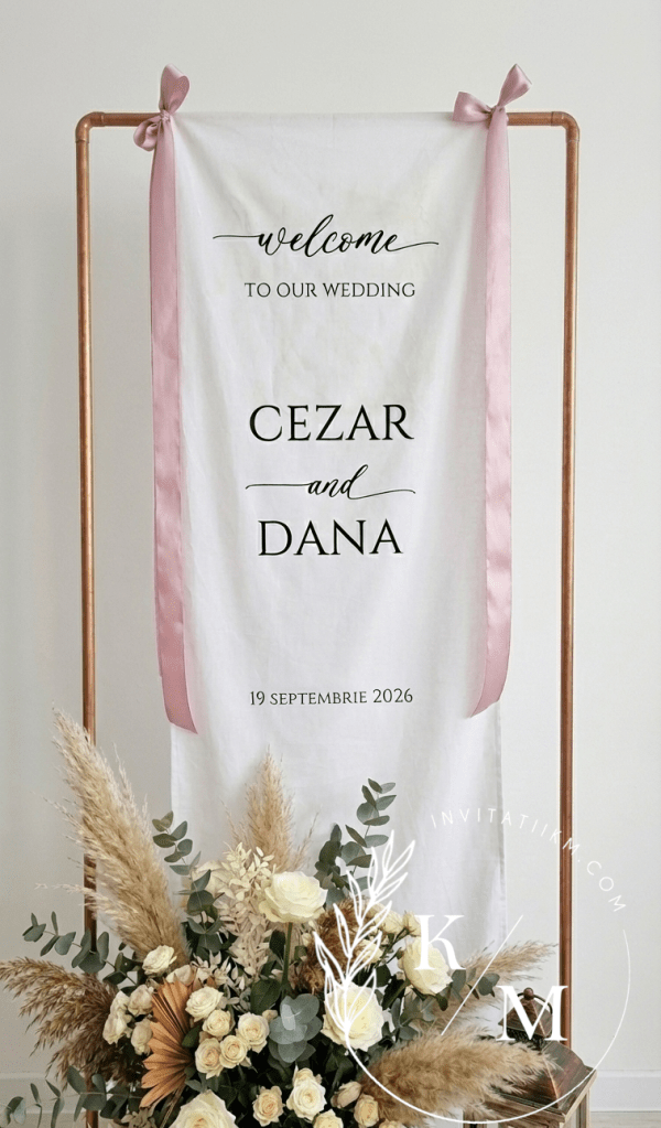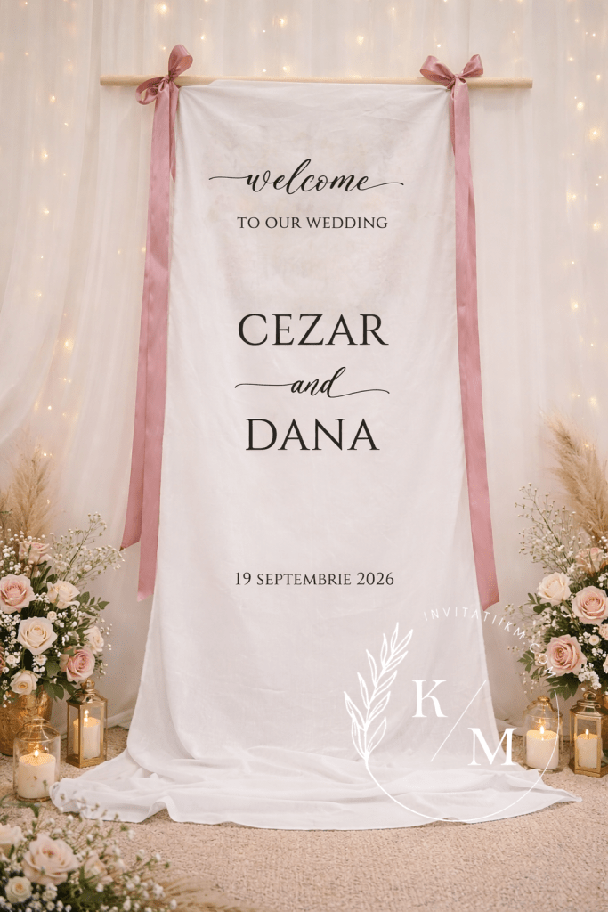 Transformați momentul sosirii invitaților într-o experiență memorabilă cu un panou de întâmpinare textil, realizat din bumbac premium, atent selecționat pentru finețea, fluiditatea și aspectul său natural elegant. Materialul moale, cu o cădere delicată, oferă un fundal sofisticat pentru un design minimalist, atemporal.