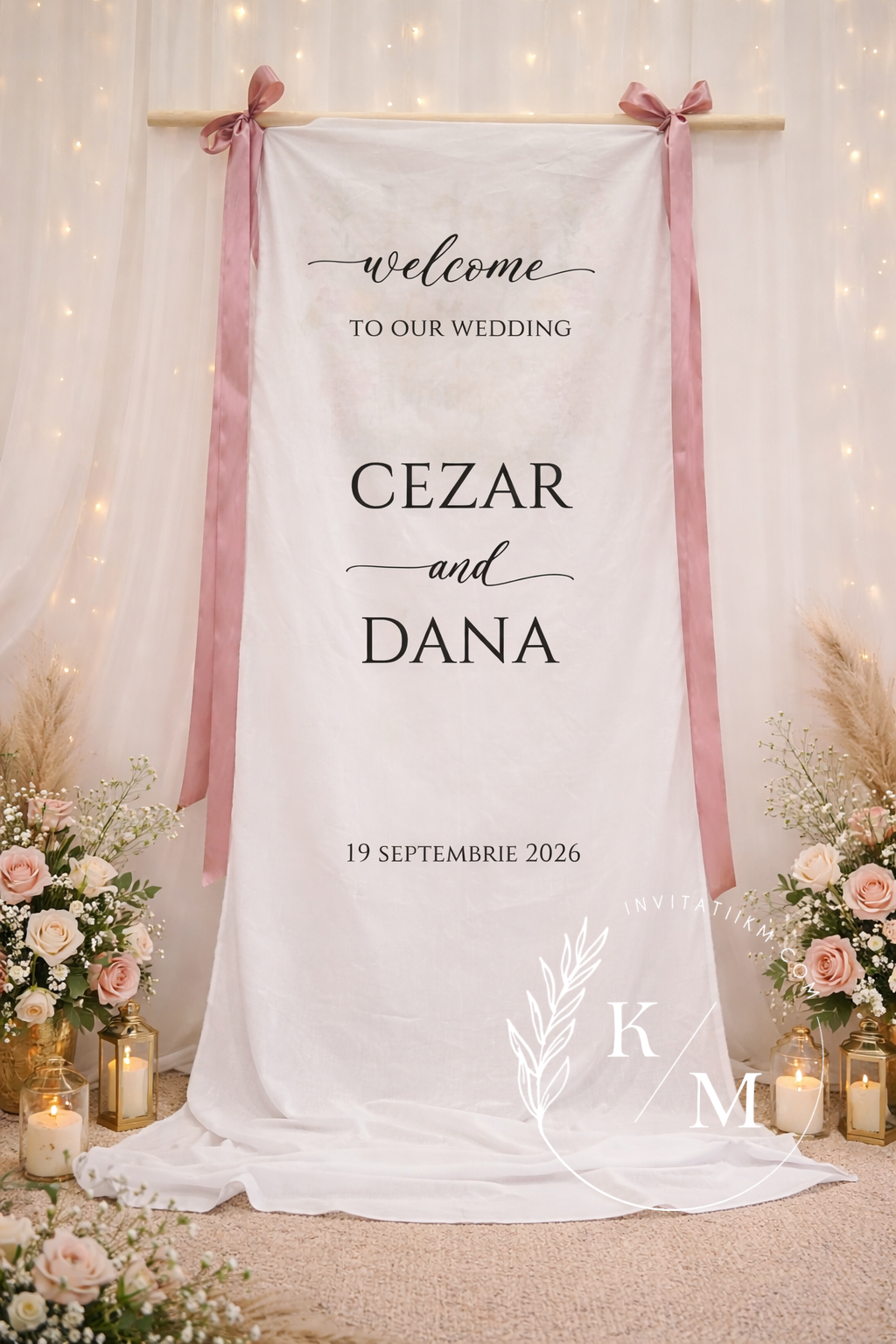 Transformați momentul sosirii invitaților într-o experiență memorabilă cu un panou de întâmpinare textil, realizat din bumbac premium, atent selecționat pentru finețea, fluiditatea și aspectul său natural elegant. Materialul moale, cu o cădere delicată, oferă un fundal sofisticat pentru un design minimalist, atemporal.