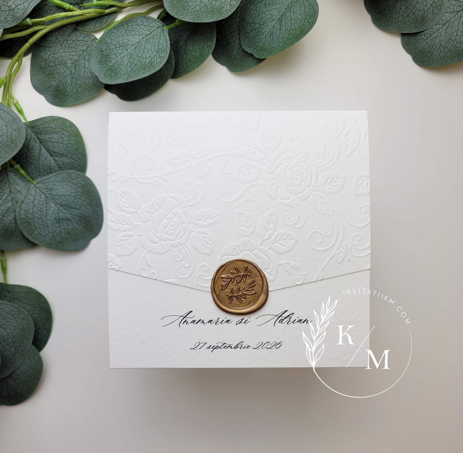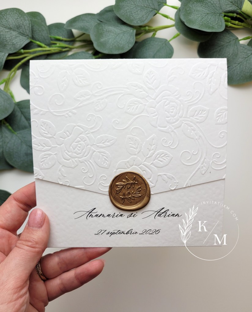 Invitație de nuntă realizată din carton alb texturat premium, cu clapetă embosată manual, accesorizată cu sigiliu turnat la cald.