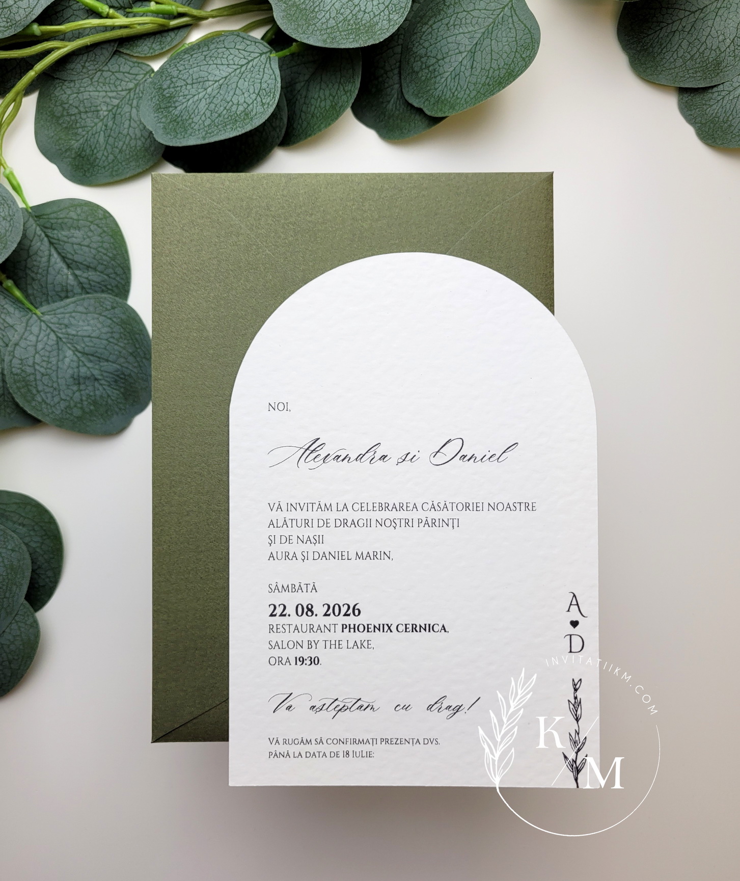 Invitație de nuntă în stil minimalist, realizată din carton alb texturat premium decupat în formă de arcadă și plic asortat verde olive texturat.