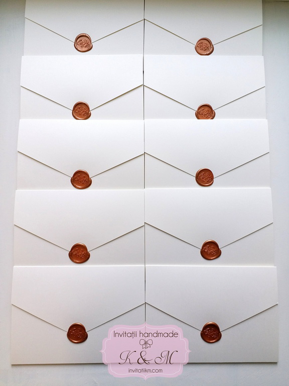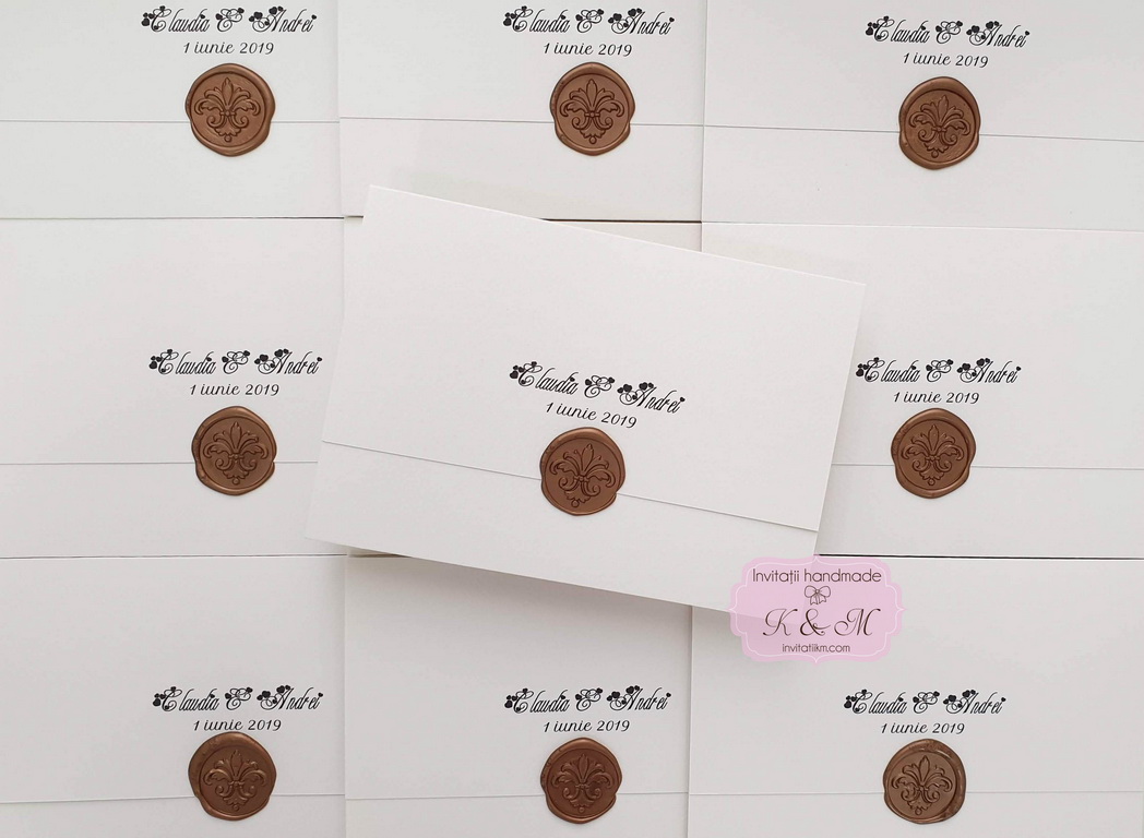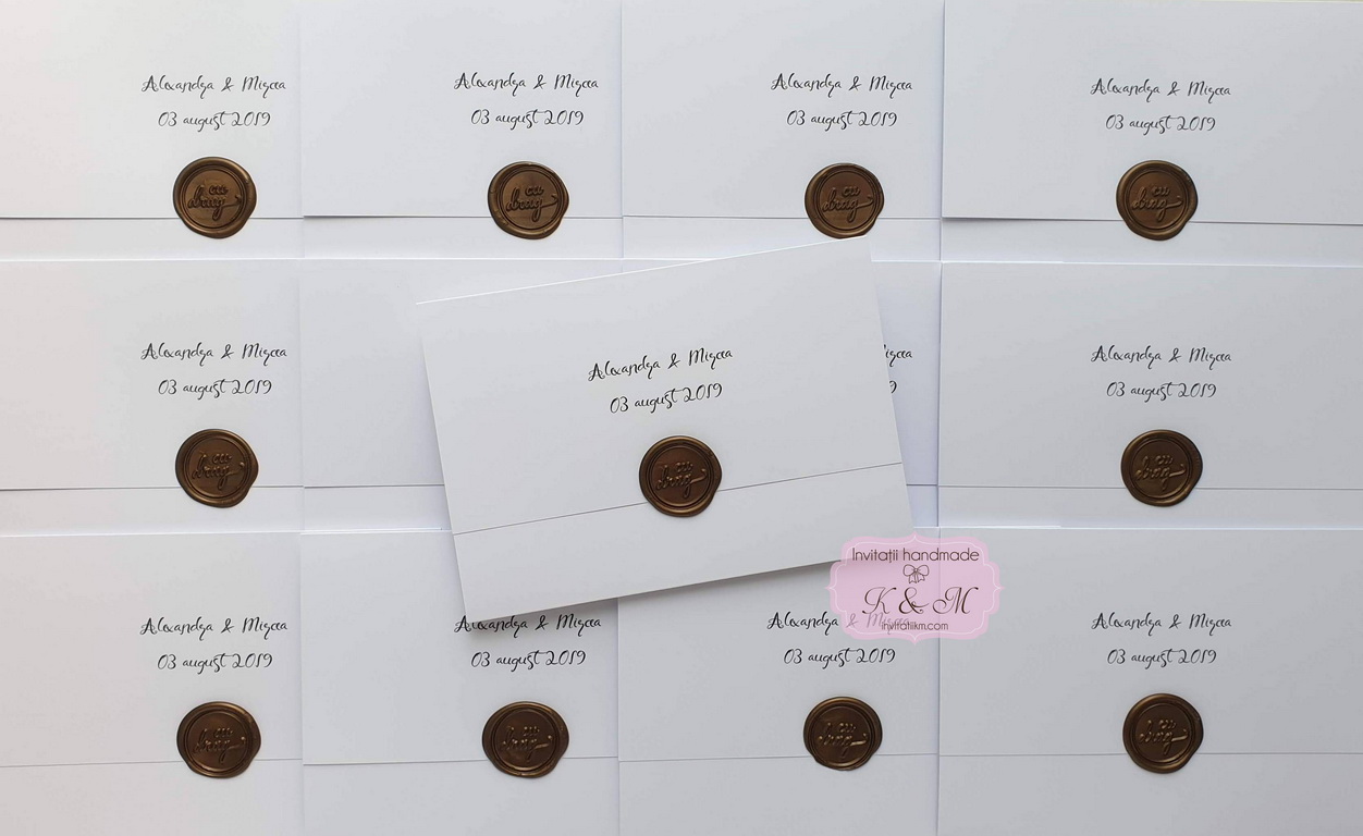 Invitațiile realizate manual au un farmec aparte. Fiecare piesă este ușor diferită, iar acest lucru le transformă în adevărate obiecte de suflet. Sigiliile din ceară, aplicate manual, adaugă un accent nobil și romantic, inspirat din corespondența clasică, dar reinterpretat într-un stil actual.