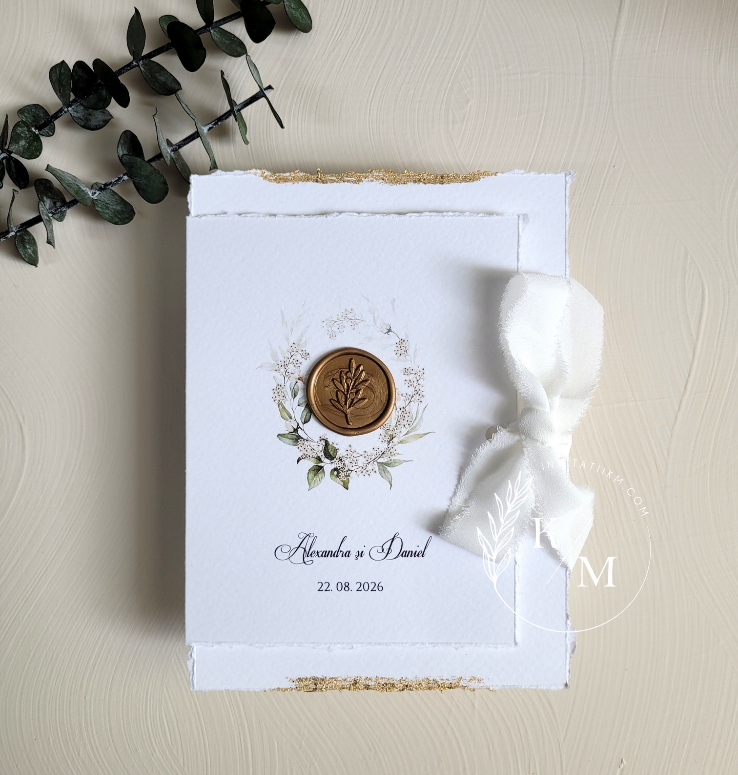 Un detaliu extrem de apreciat este reprezentat de marginile rupte manual, care oferă invitațiilor un aer organic, delicat și ușor boem. Acestea subliniază caracterul handmade al produsului și adaugă profunzime vizuală designului.