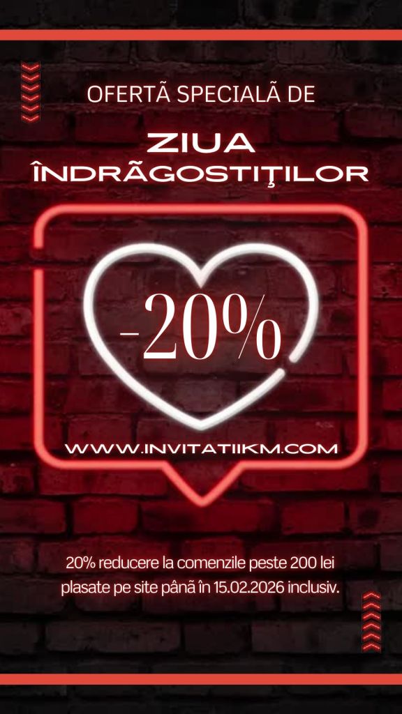 20% reducere in perioada 13-15 februarie 0 13/02/202613/02/2026 Written by Kristina *20% reducere la comenzile peste 200 lei plasate pe site pânã în 15.02.2026 inclusiv, reducerea nu se cumuleaza cu alte oferte existente pe site, se aplica la comenzile achitate pana in data de 16.02 in baza facturii. Share this: Share on Facebook (Opens in new window) Facebook Email a link to a friend (Opens in new window) Email Share on Pinterest (Opens in new window) Pinterest Share on WhatsApp (Opens in new window) WhatsApp Like Loading... Related