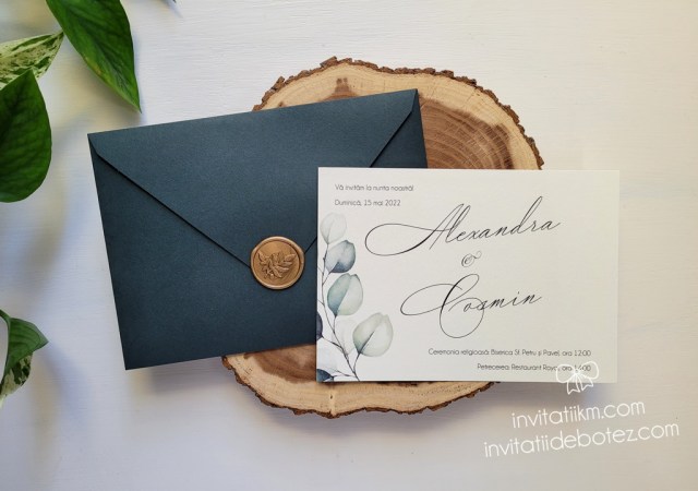 Invitatii de nunta greenery, cu verdeata, frunze de eucalipt si plicuri verzi cu sigilii 19/02/202303/02/2025