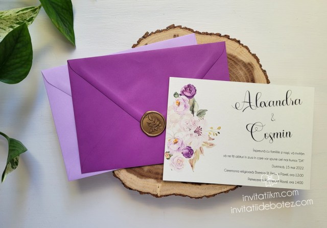 Papetarie de nunta, meniuri, plicuri bani cu chenar geometric si flori mov cod 146 23/09/202104/02/2025