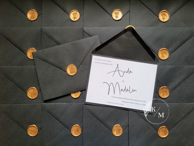 Invitatii de nunta greenery, cu verdeata, eucalipt, frunze, detalii aurii si sigilii 19/02/202303/02/2025